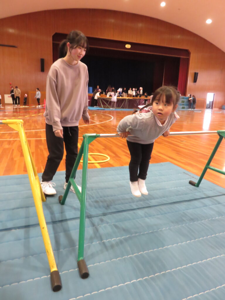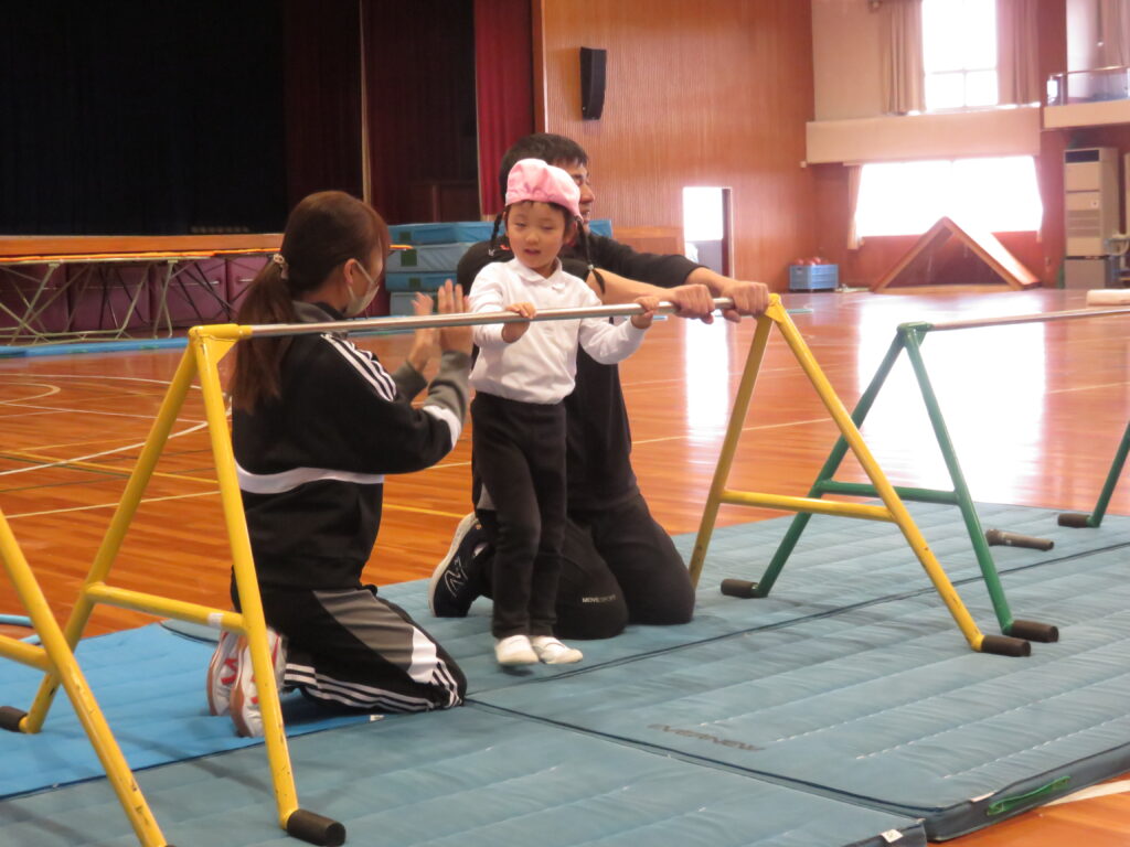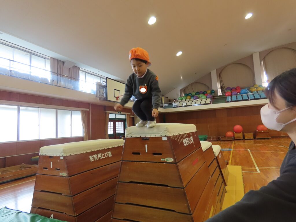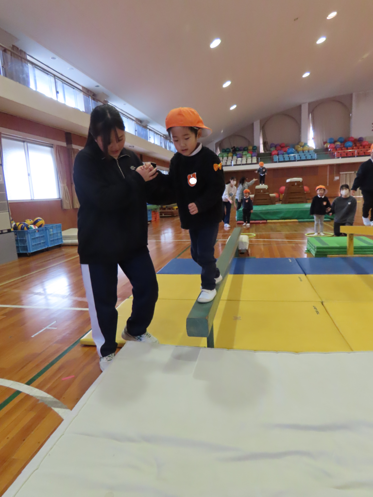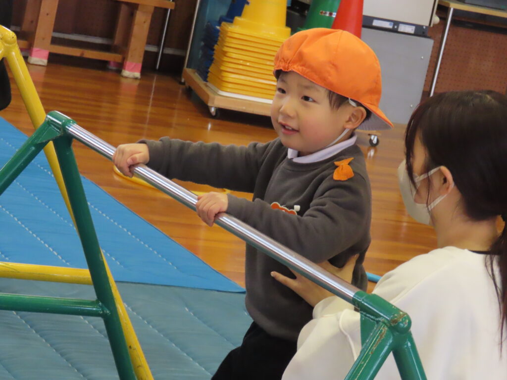 いつもはお姉さんと手を繋いで挑戦している子どもたちですが、今日は一人で挑戦してみよう!ということで、様々な運動遊びに一人で挑戦しました。細い平均台をそーっと渡ったり、子どもたちの背よりも高い跳び箱を渡ったり、、、!