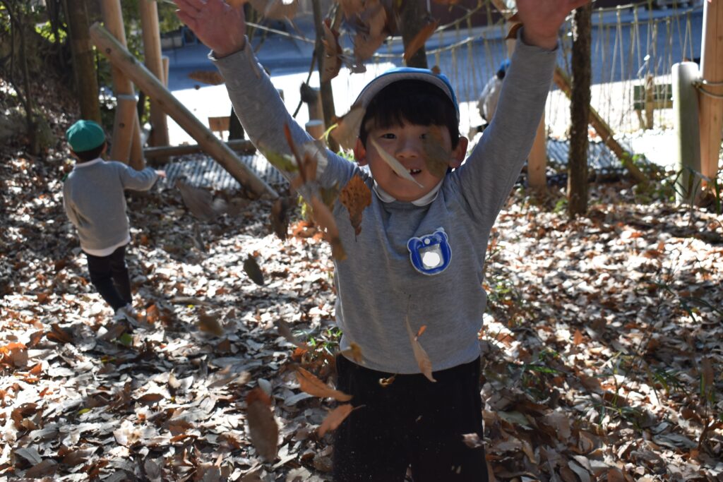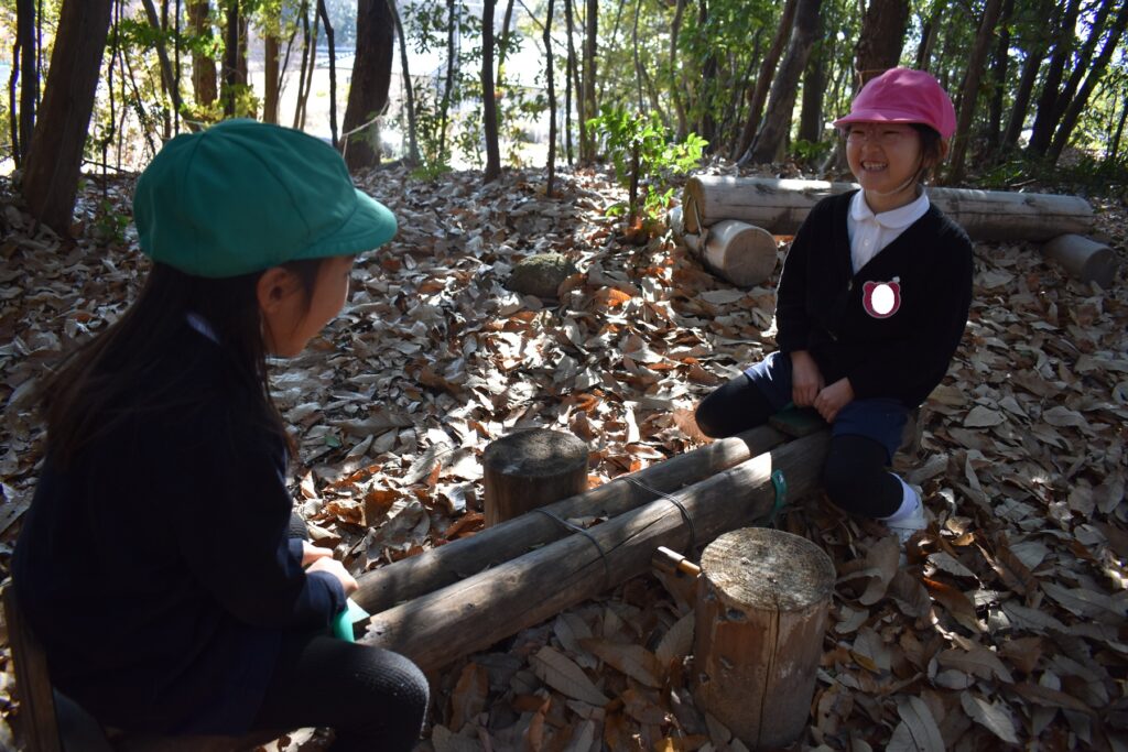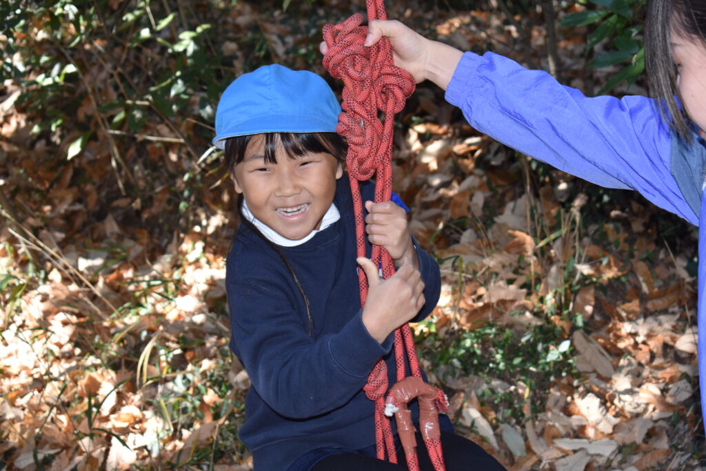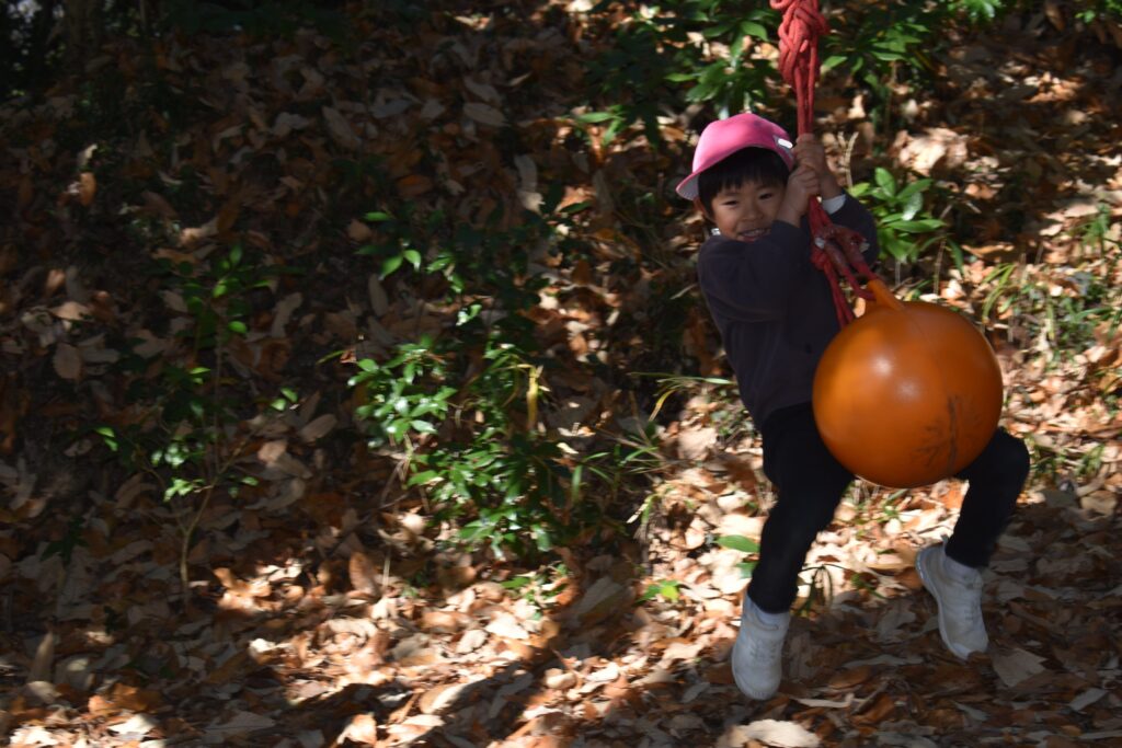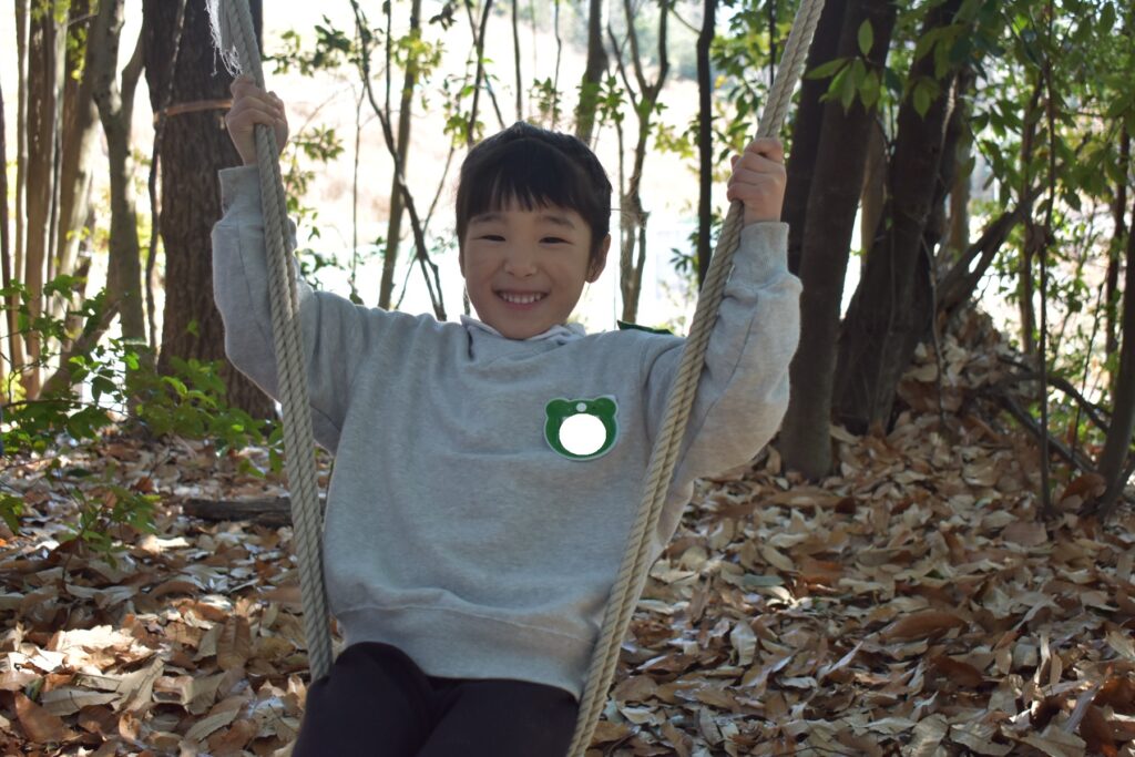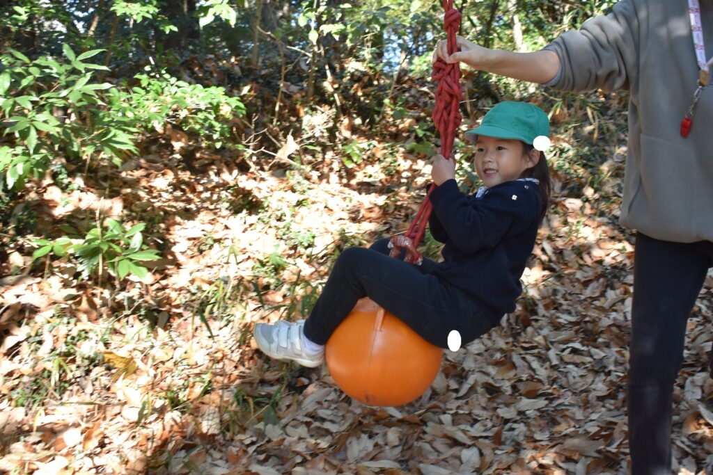 初めての山のアスレチックに子どもたちは興味津々!ターザンロープに挑戦すると思った以上に早くて驚いたり、自然の中のブランコを思いっきり楽しんだりしました。