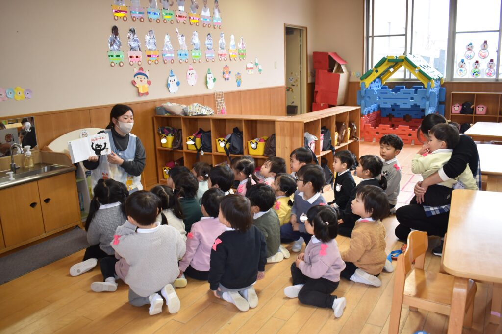 保護者の方が帰る時、泣けてしまった子も絵本を見始めると少しずつ落ち着いてきました。