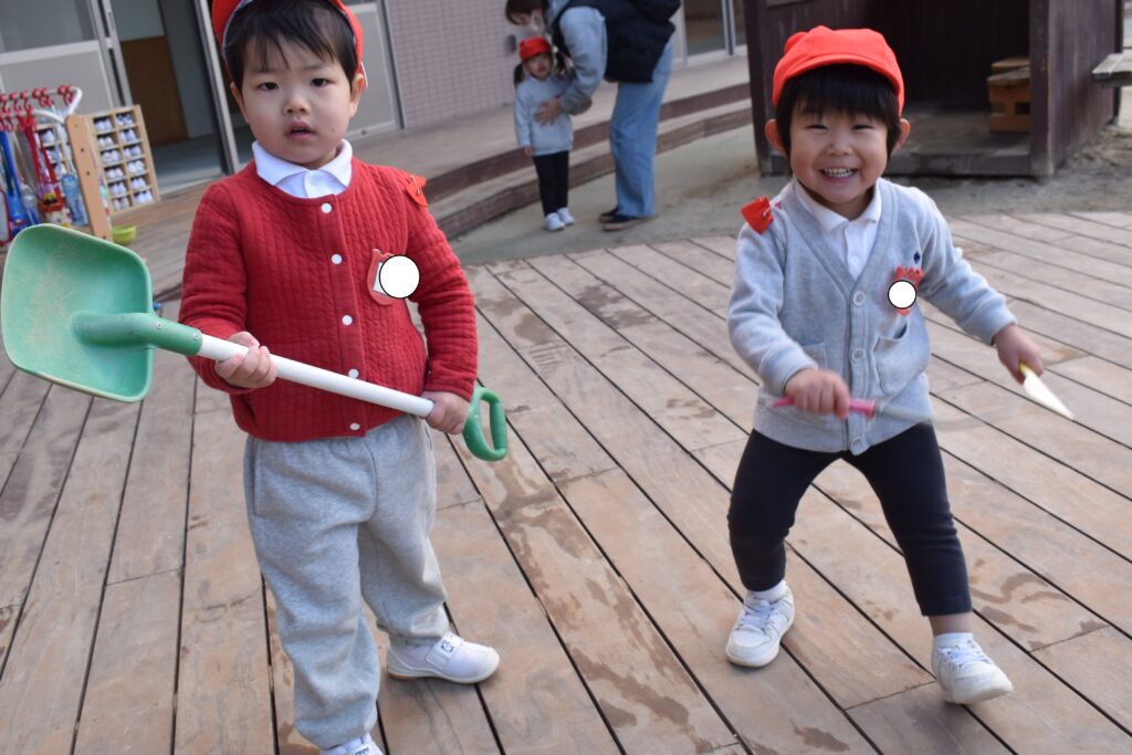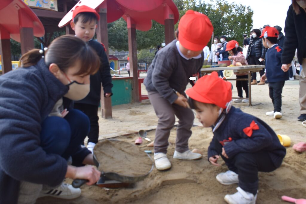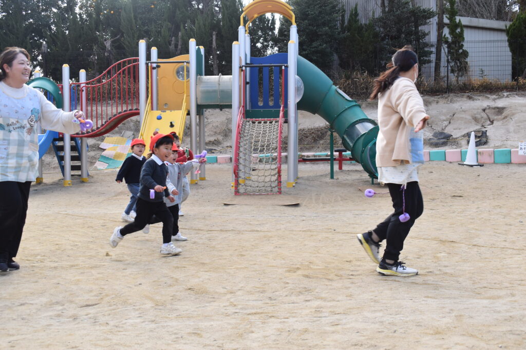今日は初めていちご組の保育参観がありました。園庭では、三輪車をしたり、砂場でお山やご馳走を作ったり。しっぽ取りもして遊びました。