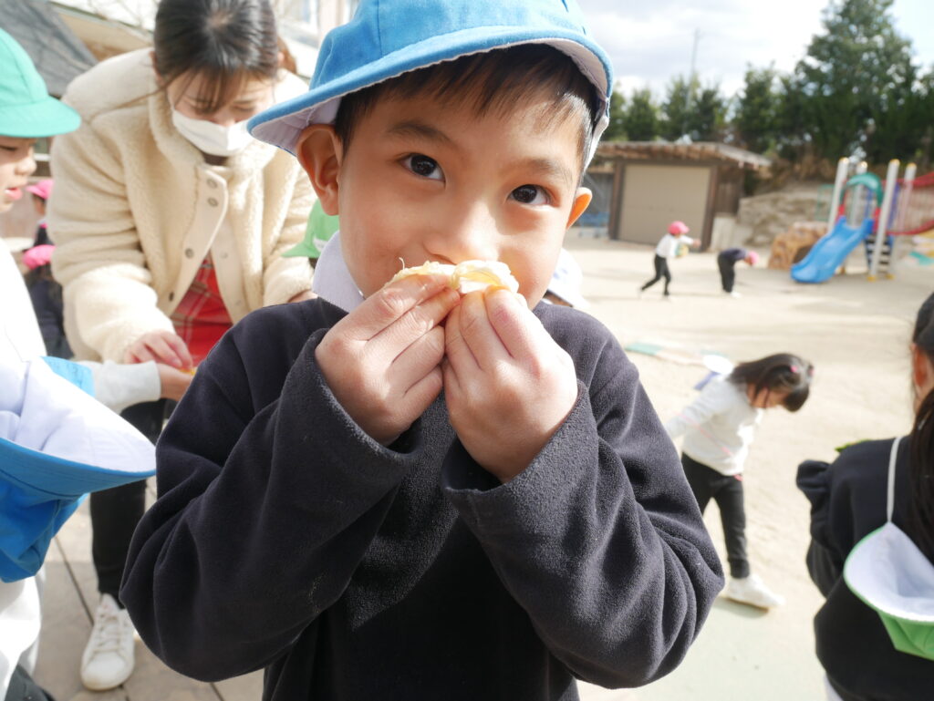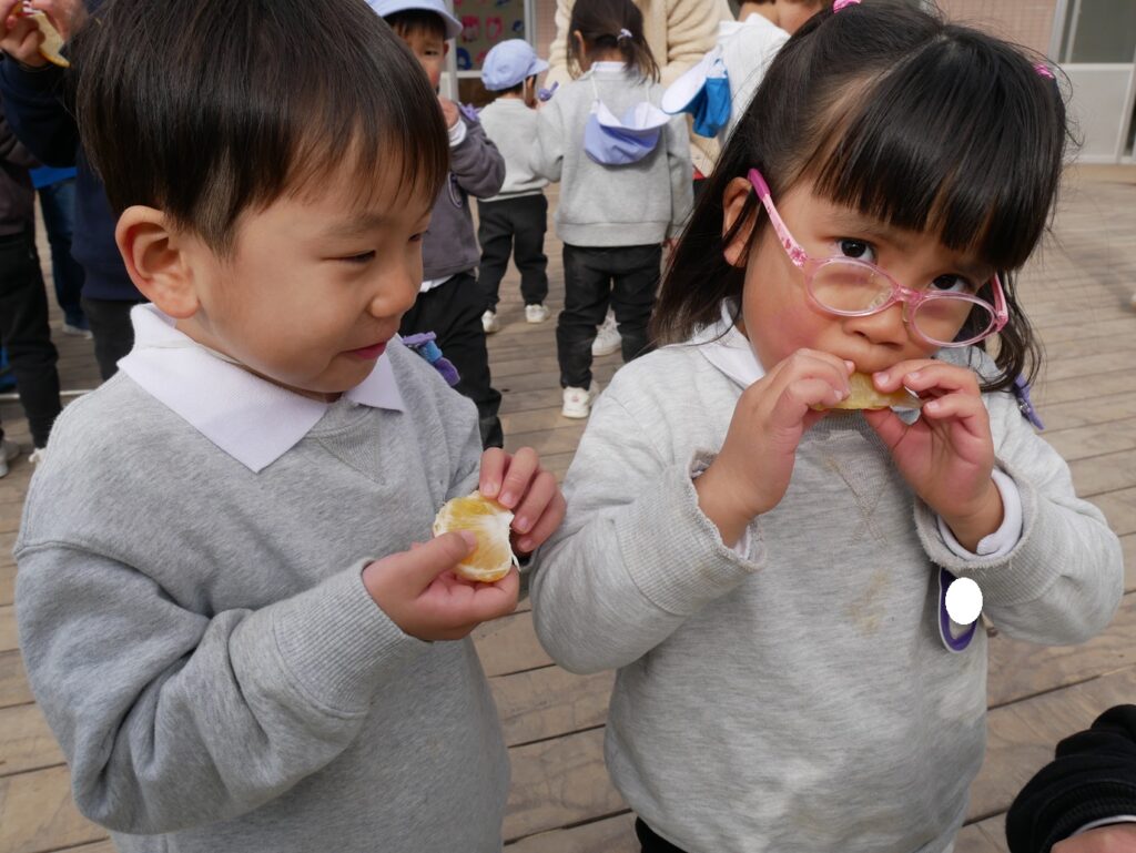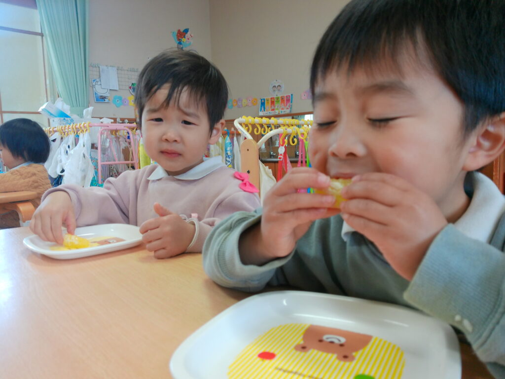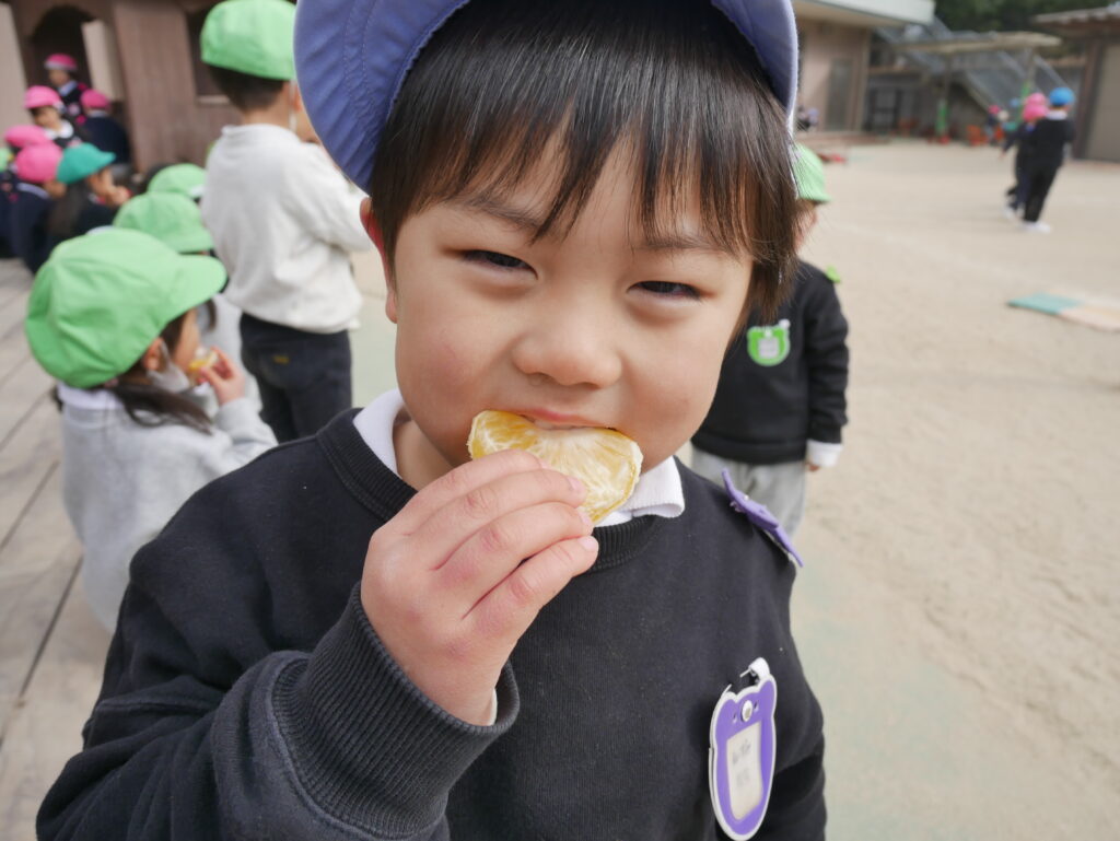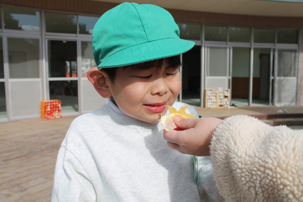 みんなで夏みかんを食べてみると、甘酸っぱくて夢中で食べる様子がありました。おかわりをたくさんしたり、酸っぱくて変な顔になったり、楽しい時間を過ごしました♪