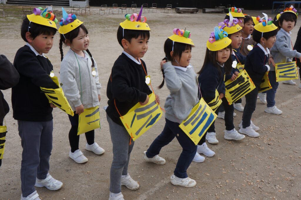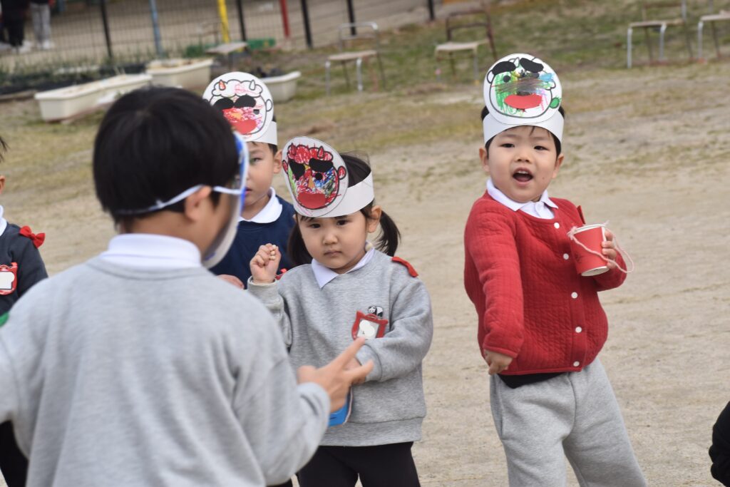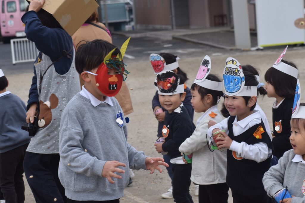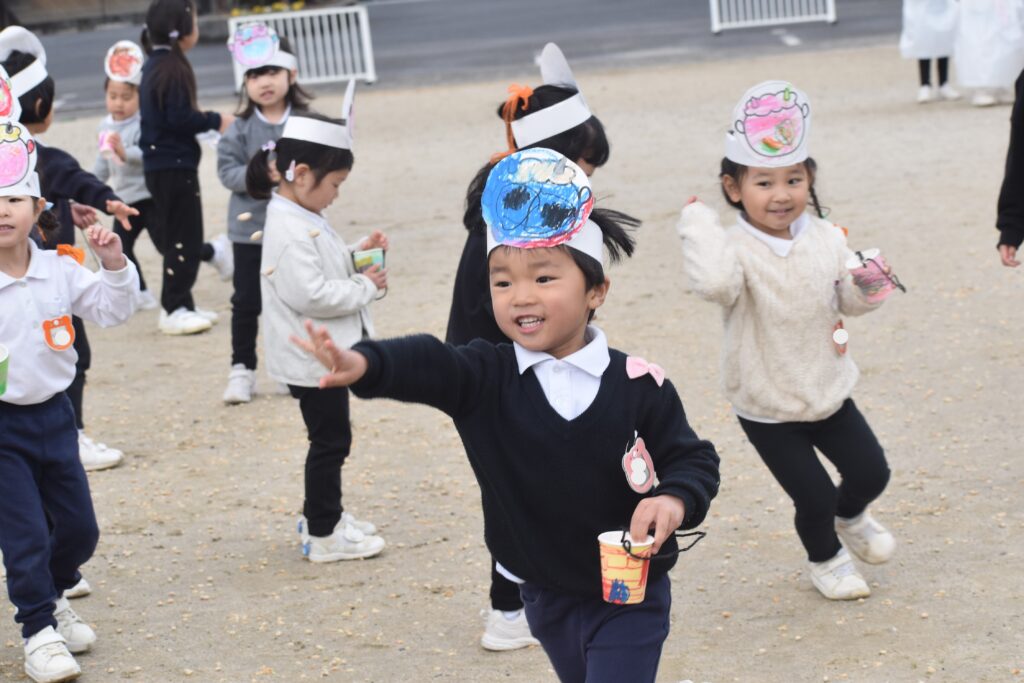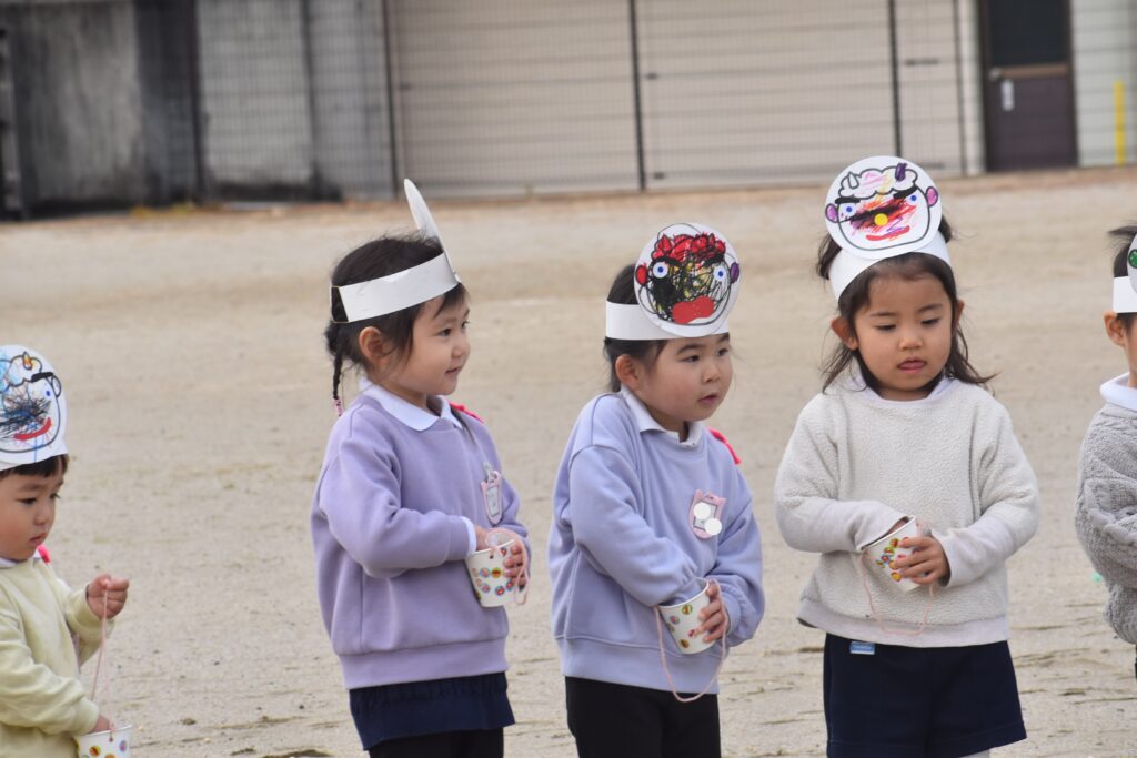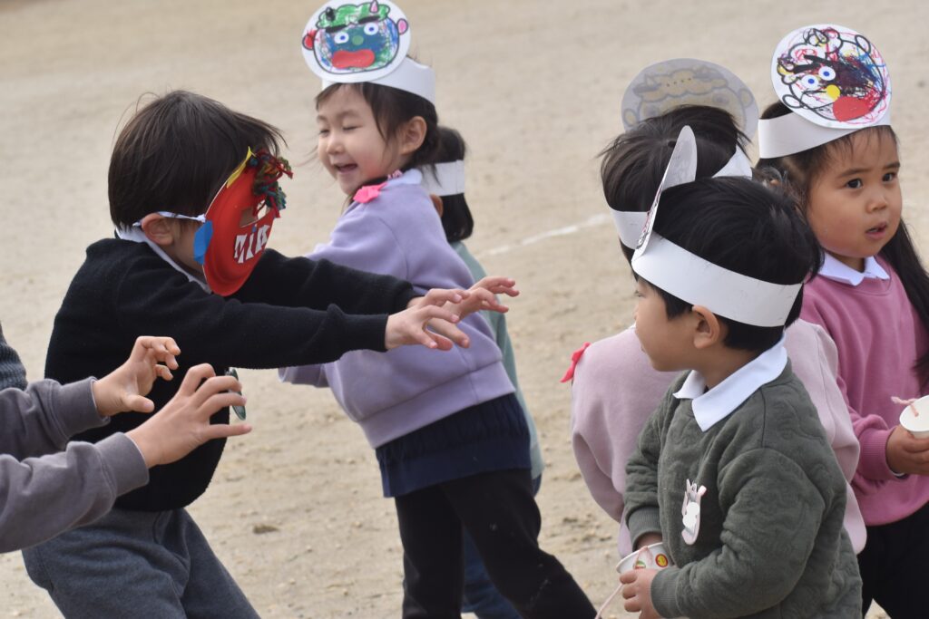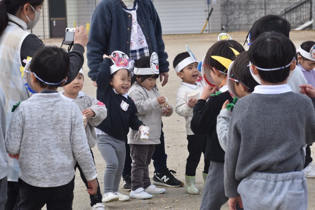 怖くて泣いている子、一生懸命豆を投げている子がいました。