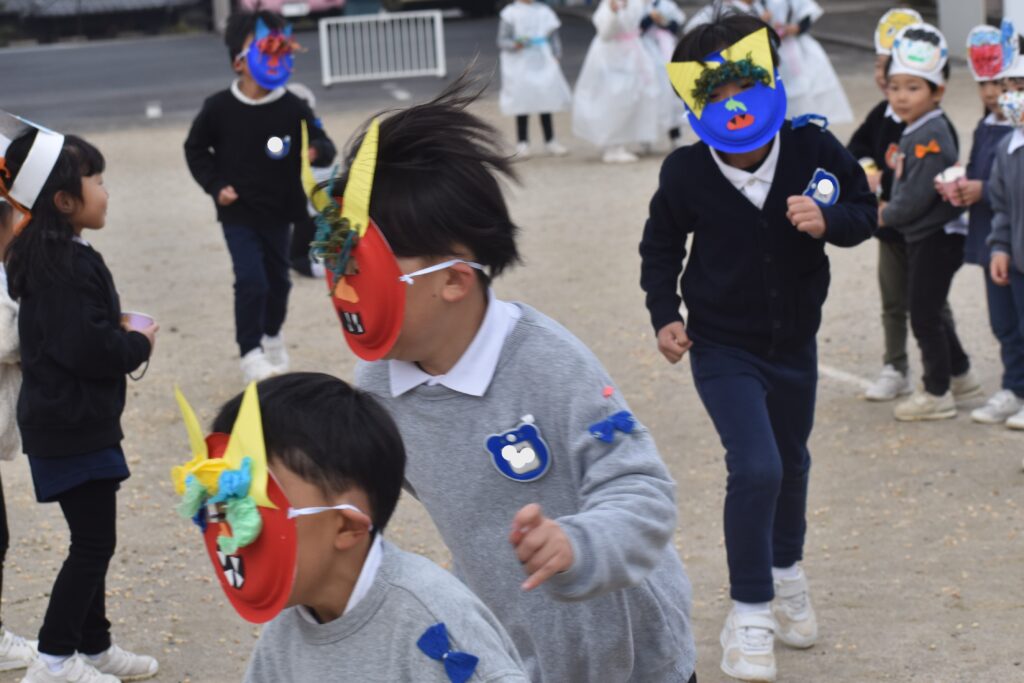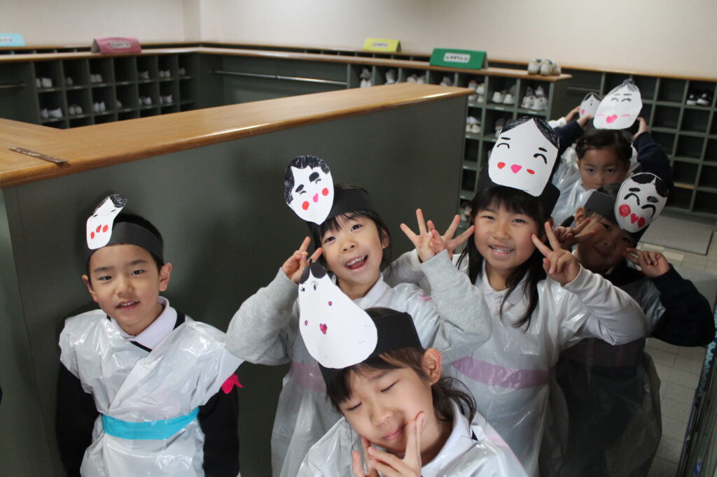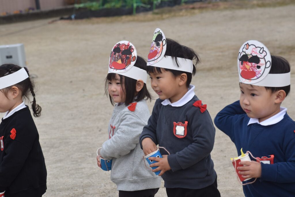 子どもたちは、自分で作ったお面や豆入れを作って準備万端!