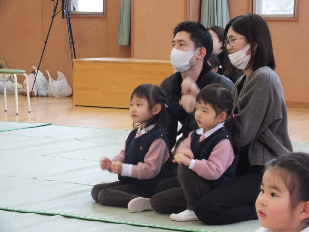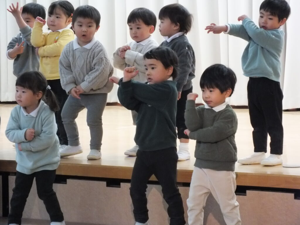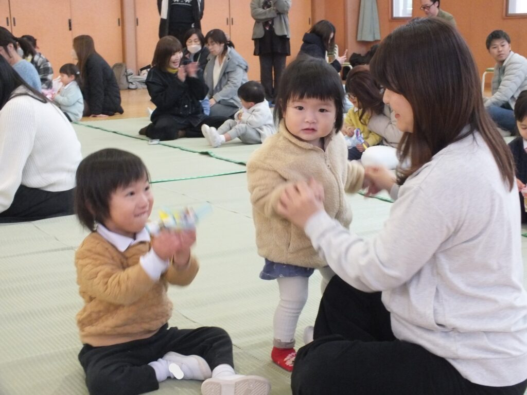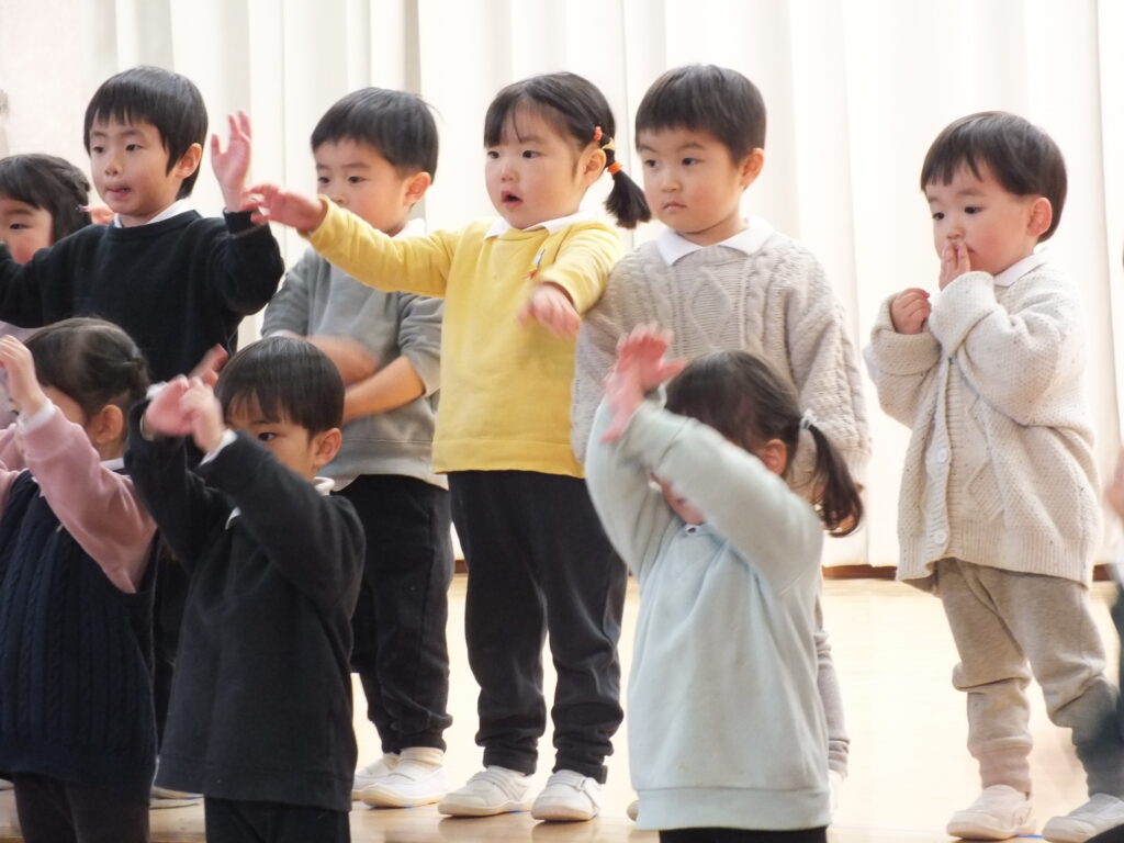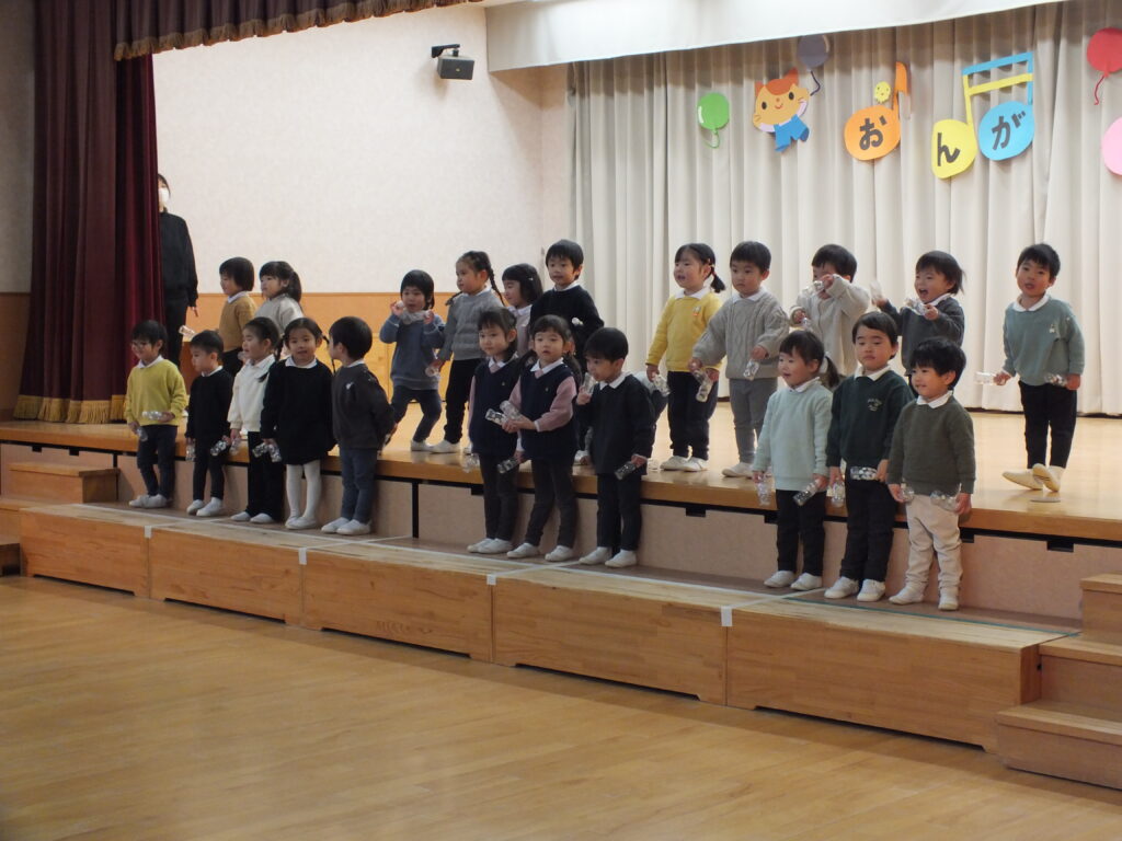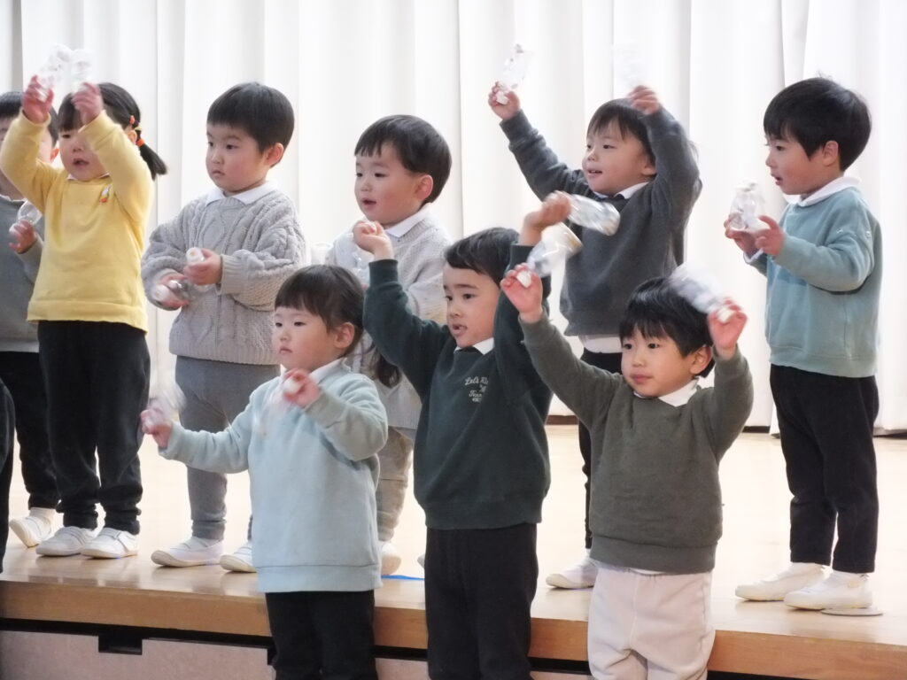 満三歳児もも組の音楽会がありました。歌を歌ったり、手作りのマラカスを鳴らしたり、踊りを踊ったりしました。その後はわらべうたや、ふれあい遊びをお家の方と楽しみました。