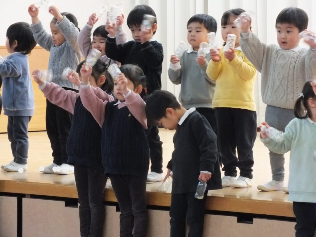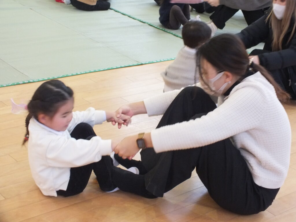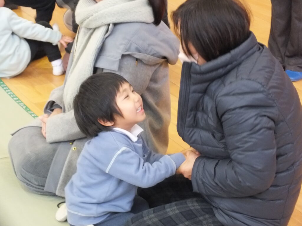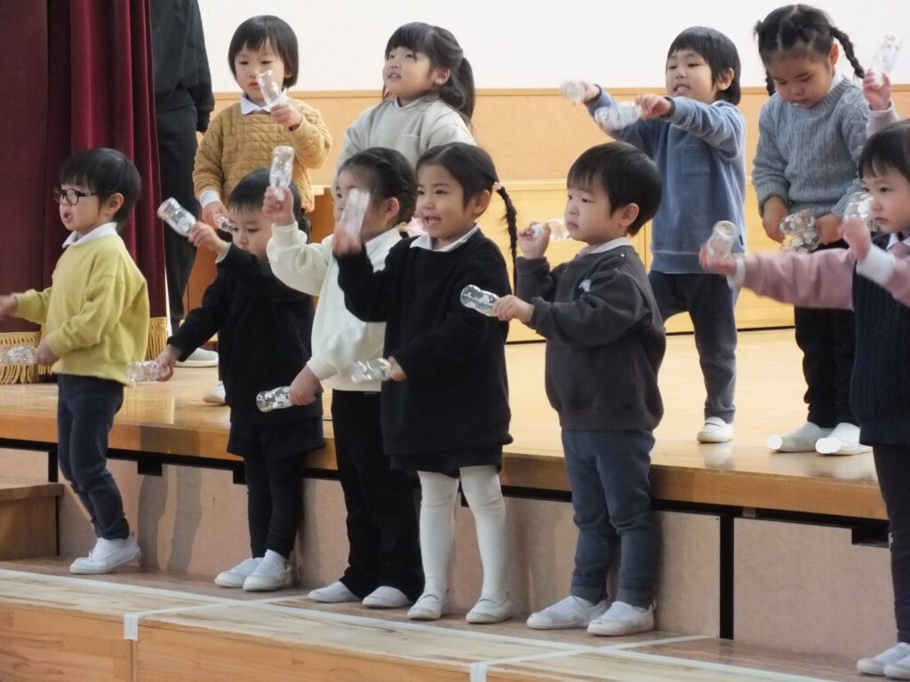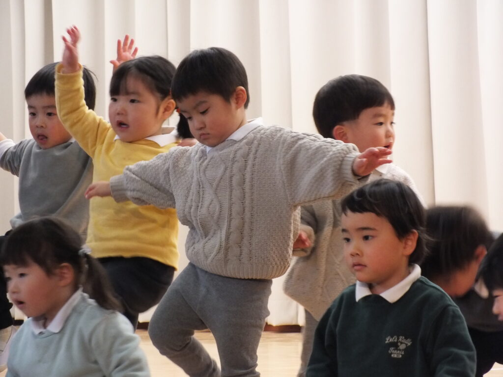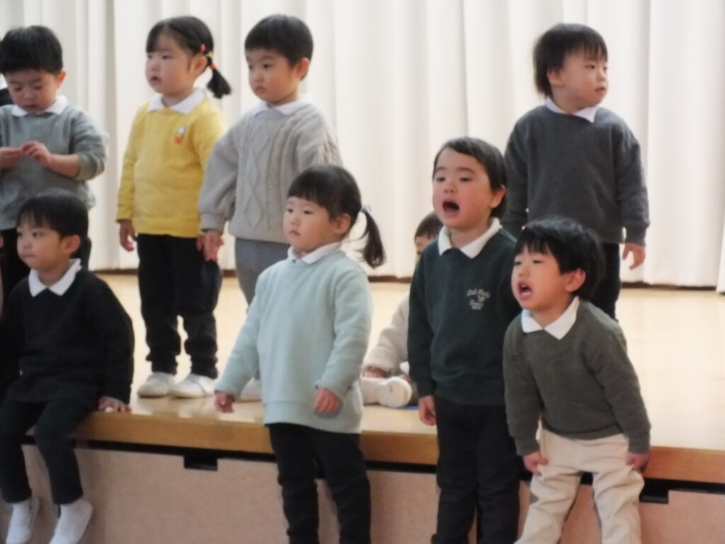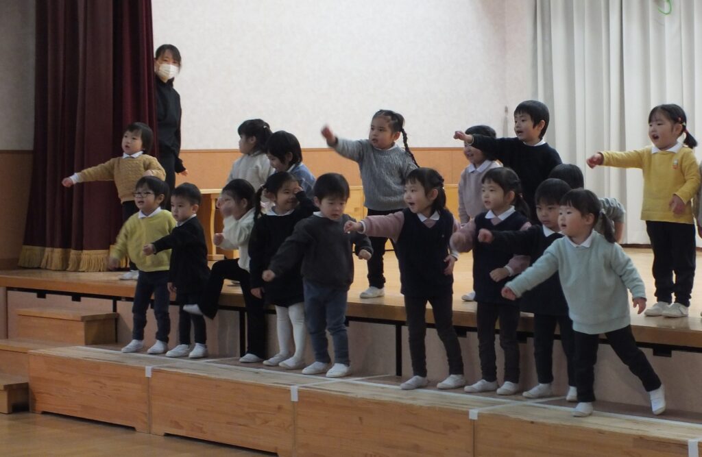 満三歳児もも組の音楽会がありました。歌を歌ったり、手作りのマラカスを鳴らしたり、踊りを踊ったりしました。その後はわらべうたや、ふれあい遊びをお家の方と楽しみました。