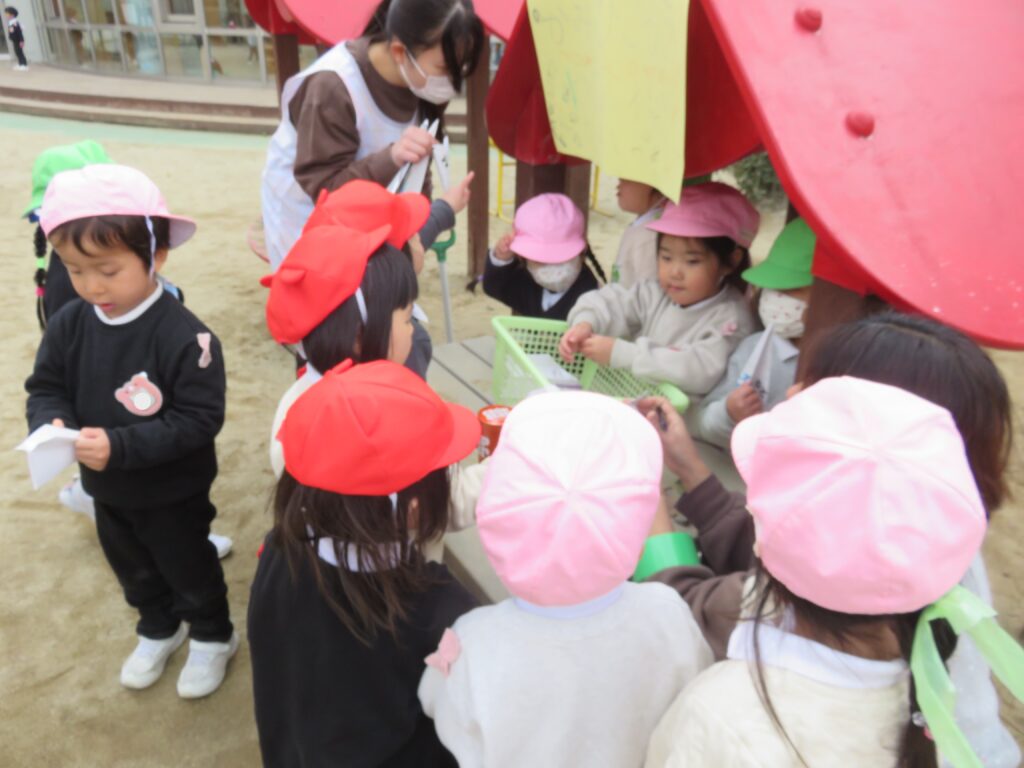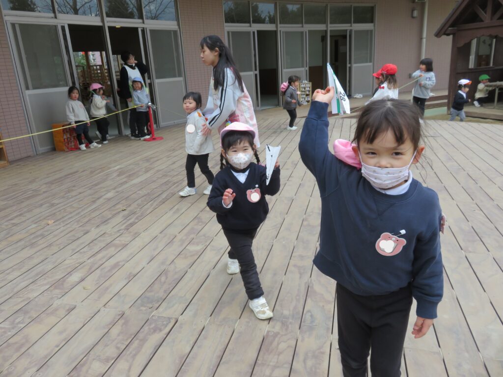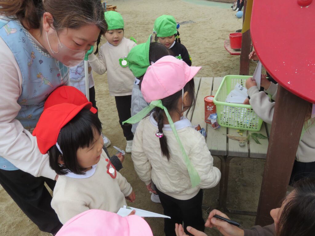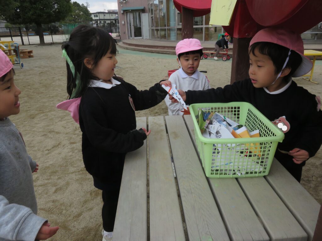 折り紙を折ることが大好きで、紙飛行機がたくさん出来ました。紙飛行機をお友達にもあげたいという声が上がり、かみひこうき屋さんをオープンしました。「いらっしゃいませ、かみひこうき屋さんです!」と呼びかけると、たくさんの子が来てくれて、あっという間に完売しました!