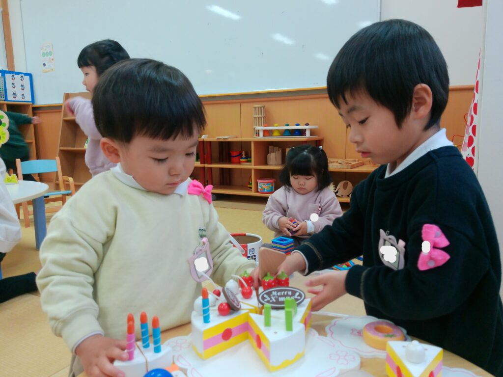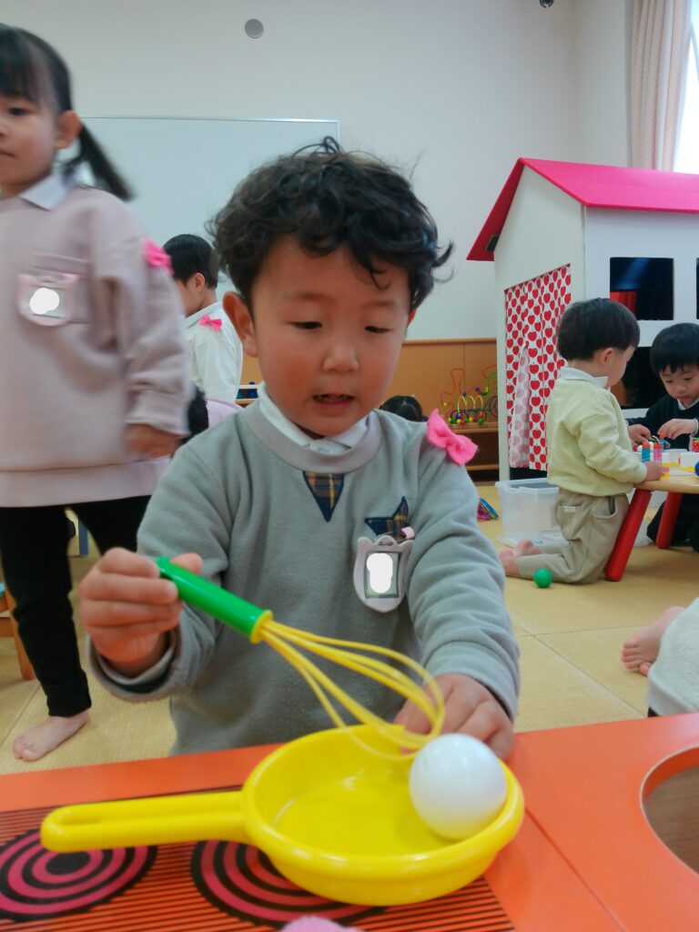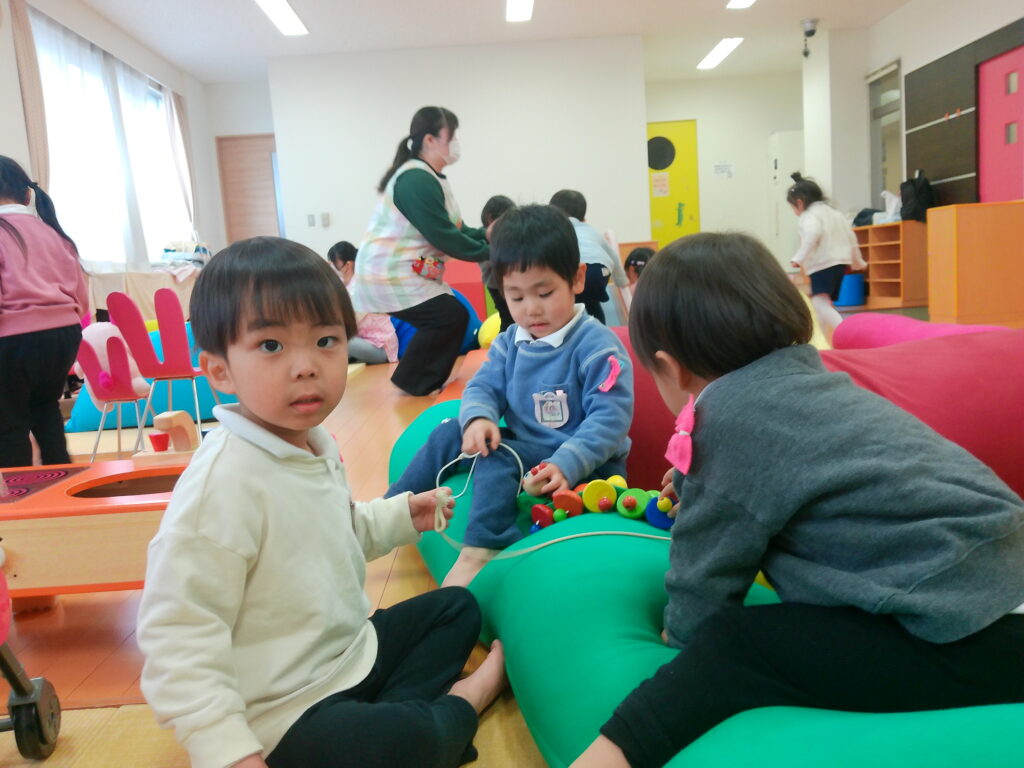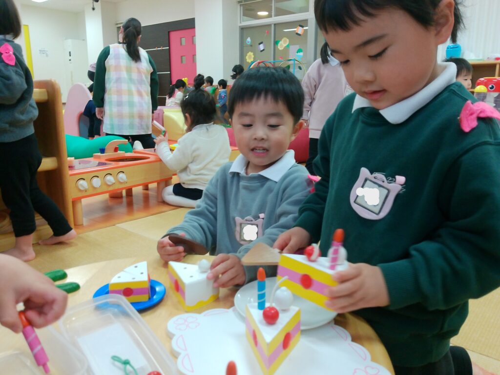 ともそだち広場には、たくさんの玩具があり、ままごとコーナーでケーキを作ったり、ボールを転がす玩具をしたり、積み木でお城を作ったりしました。あそびの箱では、大きな家にネットを使って登るのが人気でした。