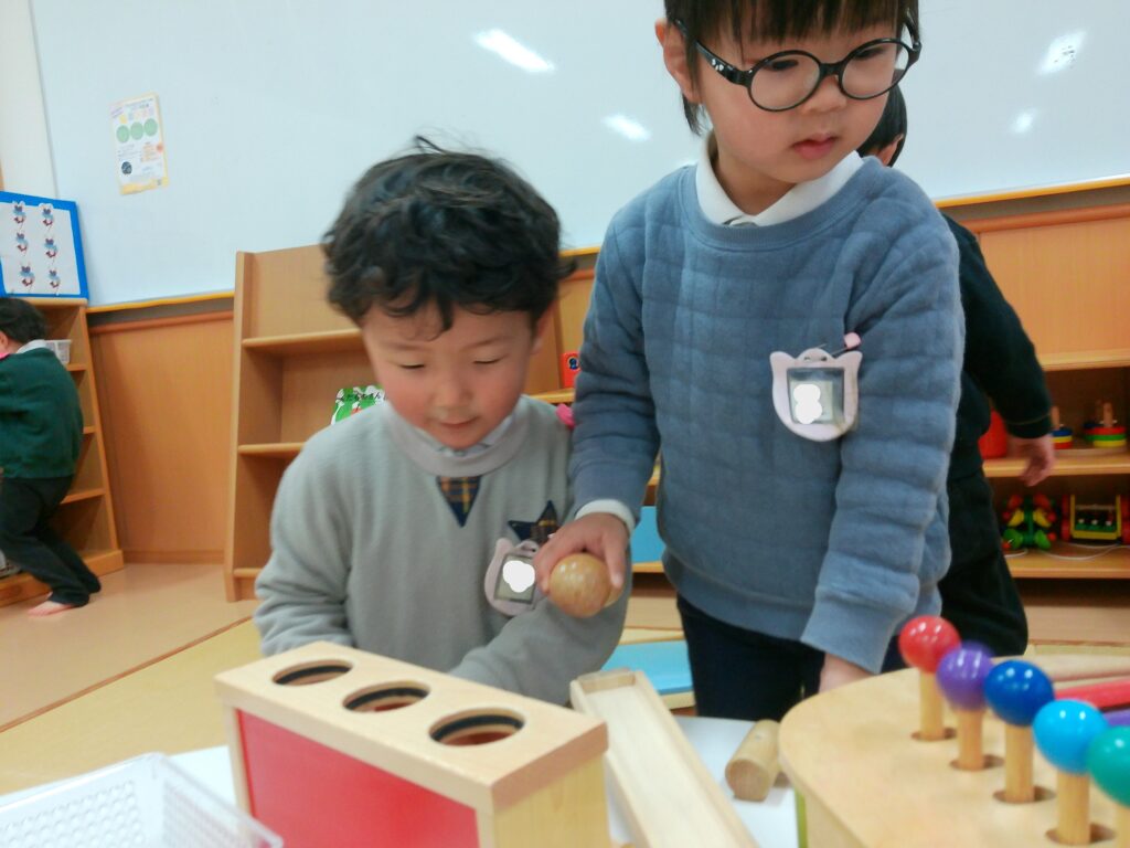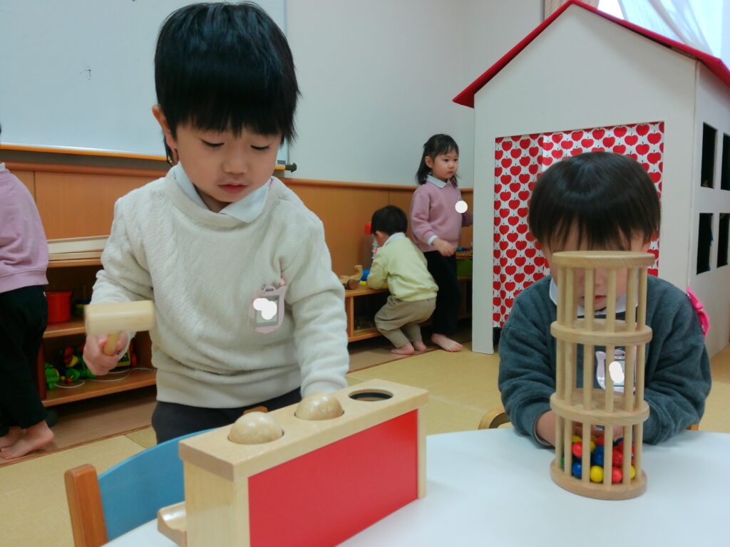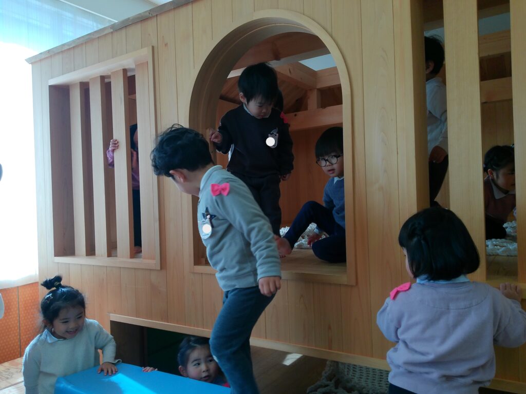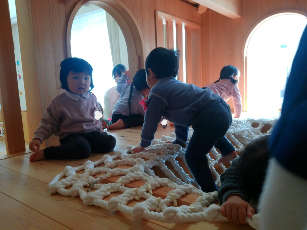 ともそだち広場には、たくさんの玩具があり、ままごとコーナーでケーキを作ったり、ボールを転がす玩具をしたり、積み木でお城を作ったりしました。あそびの箱では、大きな家にネットを使って登るのが人気でした。
