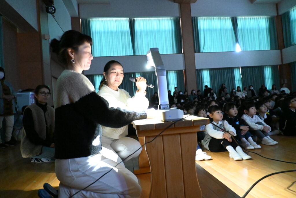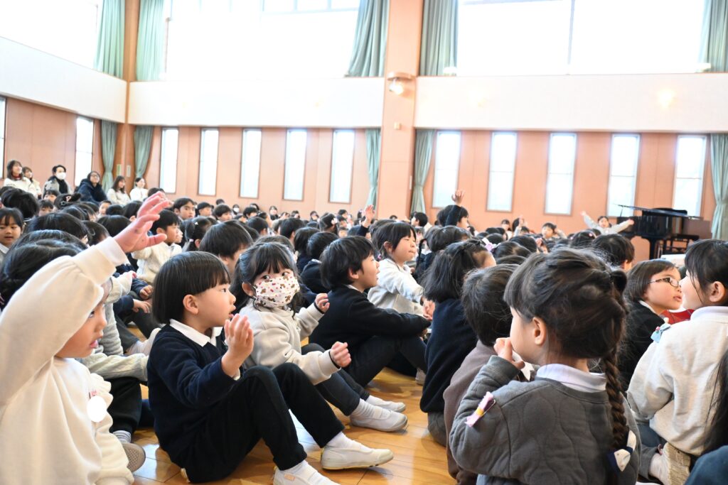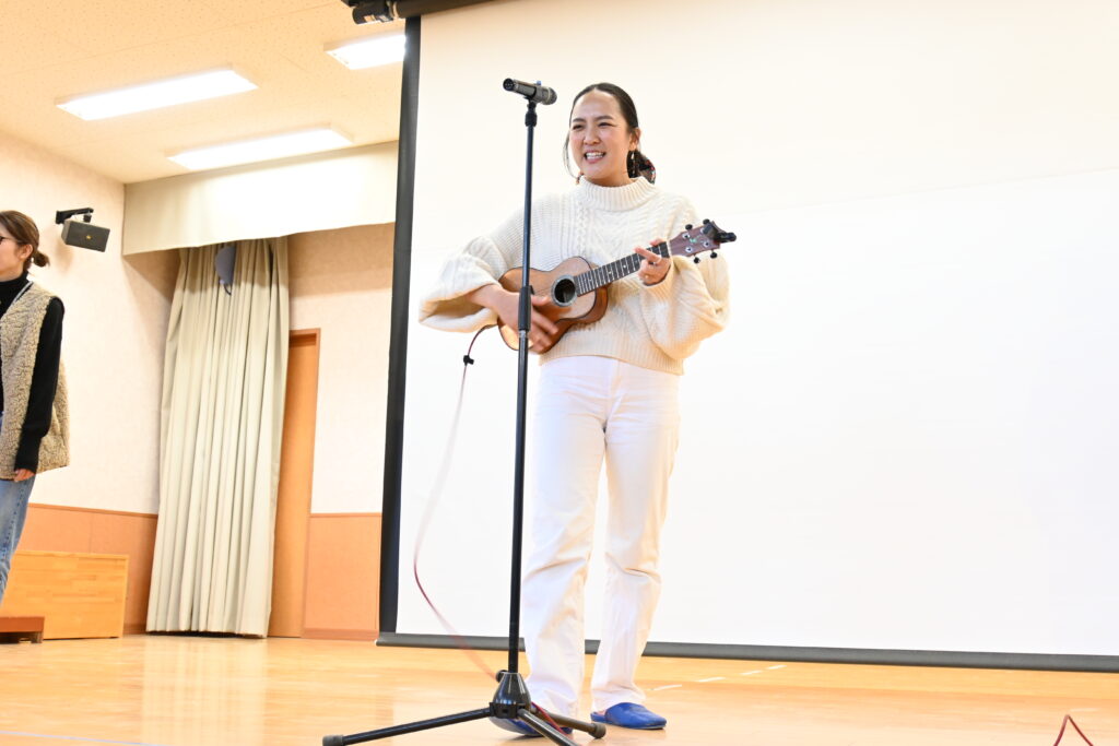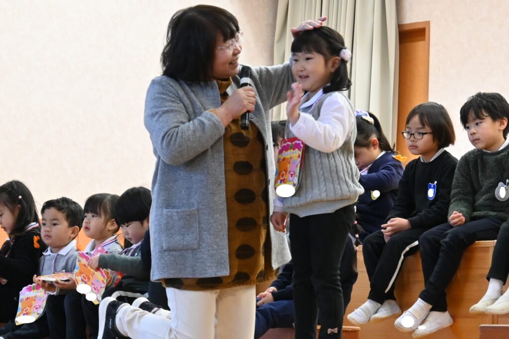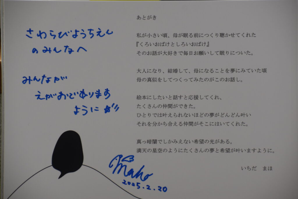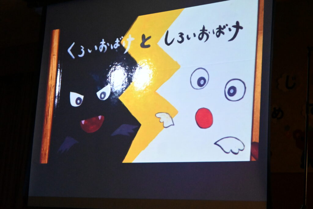 お楽しみでは「くろいおばけとしろいおばけ」という絵本を作ったいちだ まほさんとオラ アイランドのカオリスさんが来てくれました。絵本の読み聞かせをしてくれたり、とても素敵な歌を歌ってくださり、楽しい時間を過ごしました♪