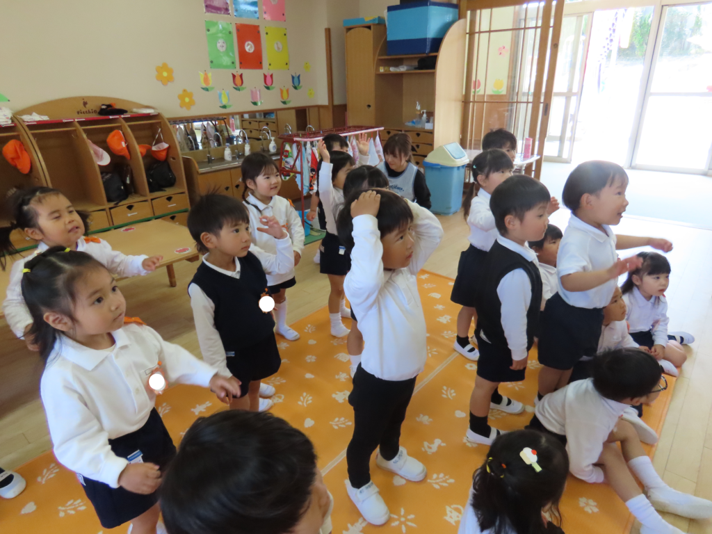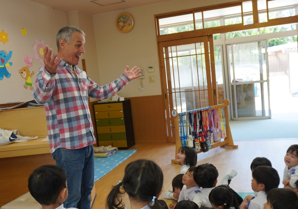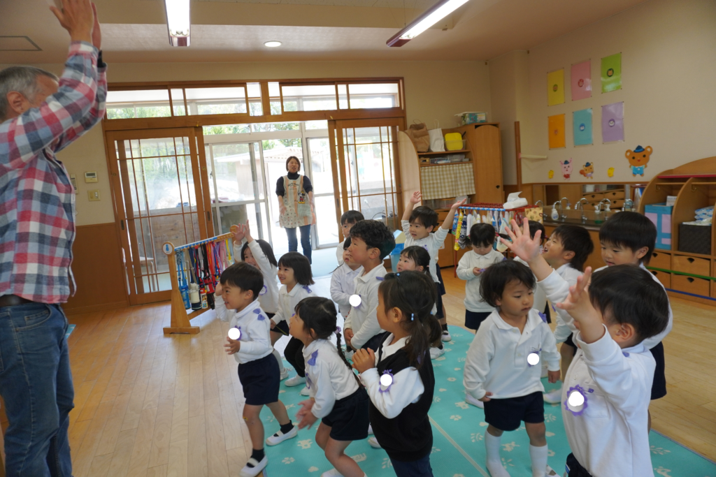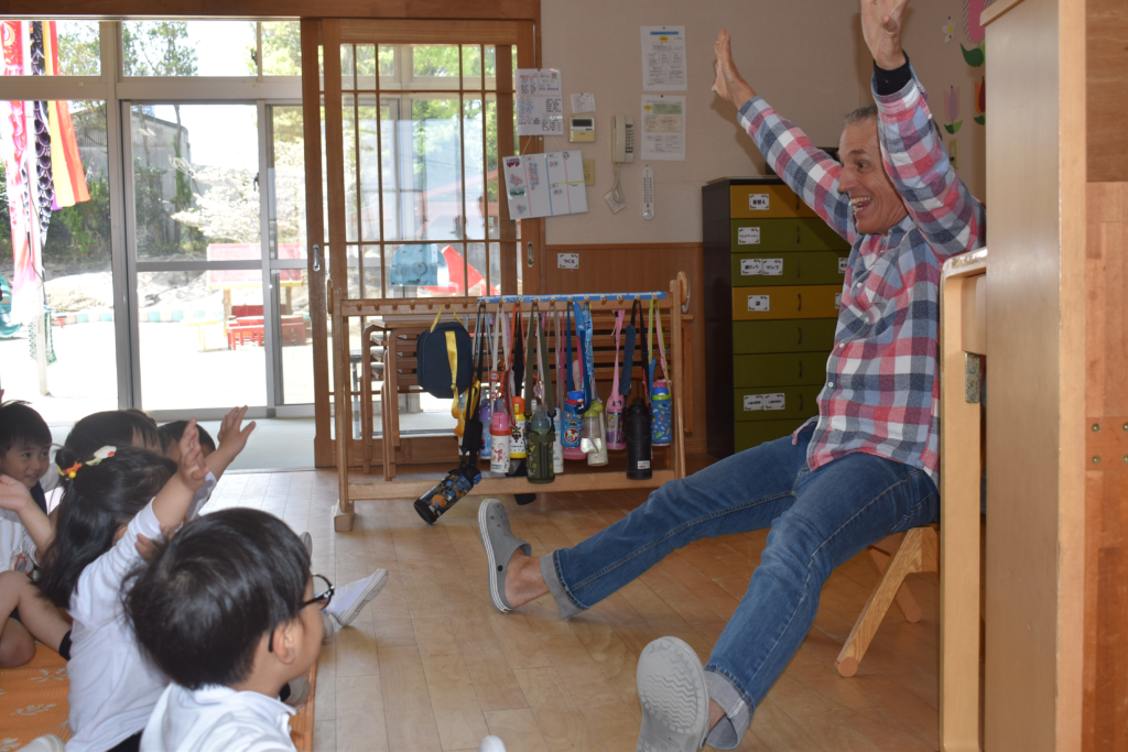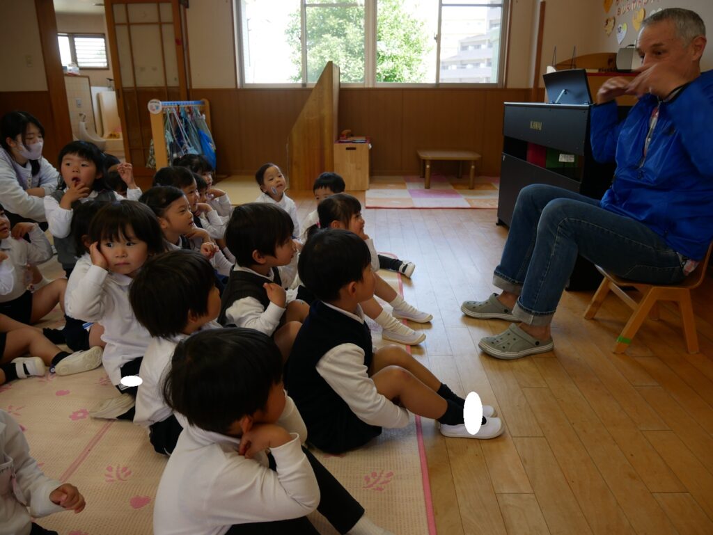 今日は、エルトンさんが素敵な絵本を持ってやってきました。絵本の真似っをこしてポーズをしたりエルトンさんと一緒に言葉遊びをしたりして楽しみました。エルトンさんに会うのが初めての年少組の子どもたちは、エルトンさんの大きな体と元気な声にちょっとびっくりした様子。これからも、登園の時に玄関で子どもたちを迎え入れてくれたり、いっぱい遊んでくれたりします。エルトンさんともお友だちになって一緒に遊ぼうね。