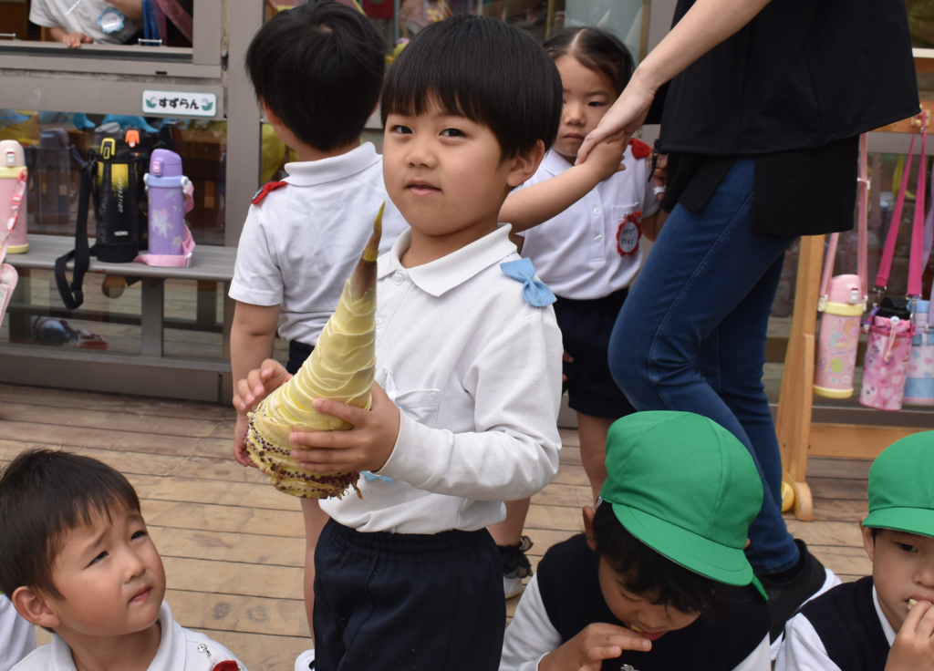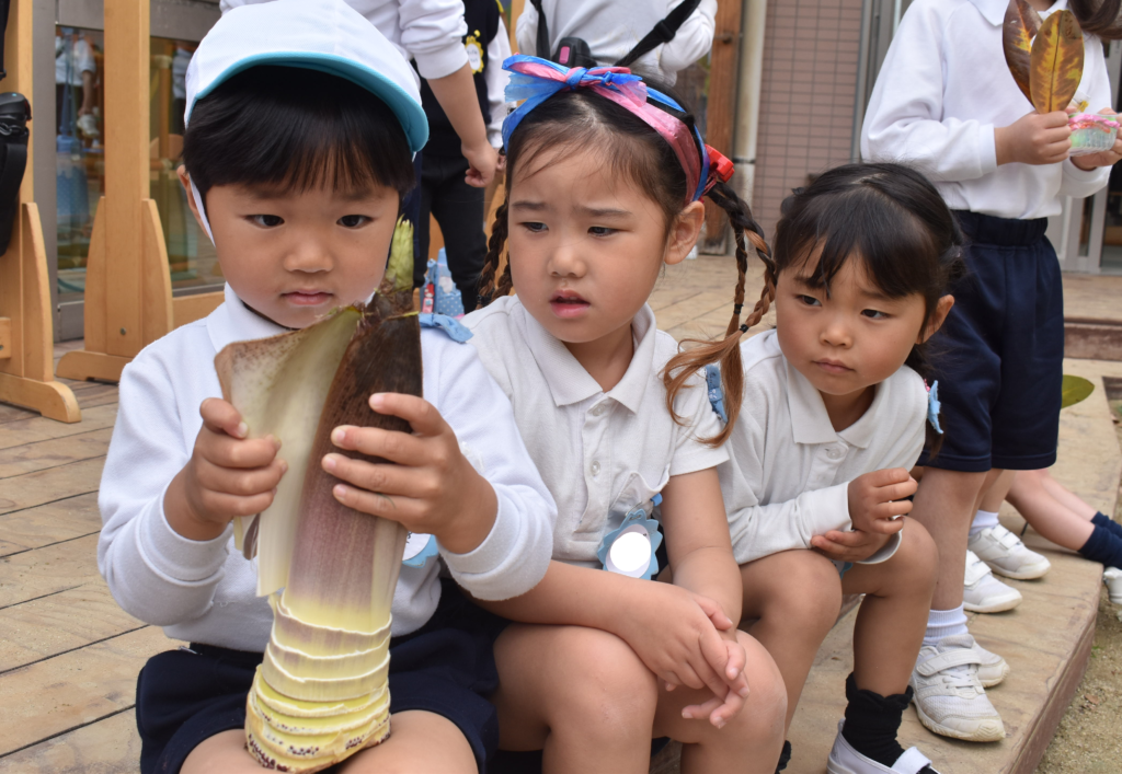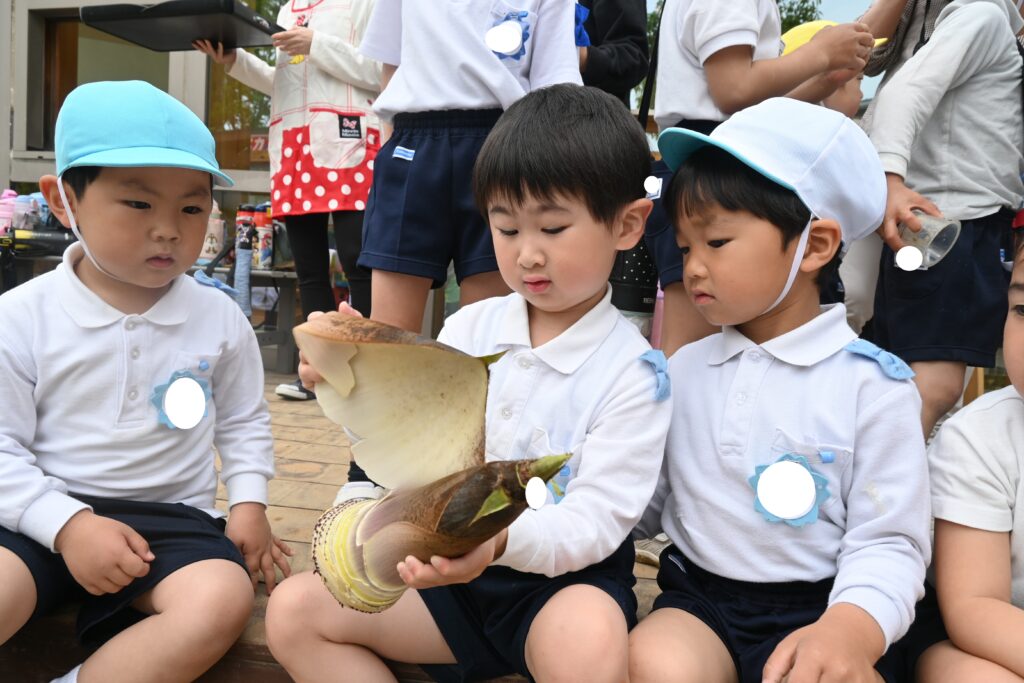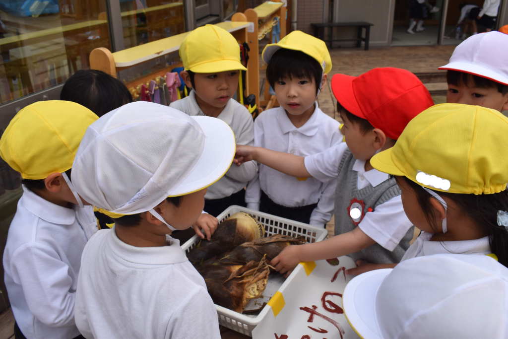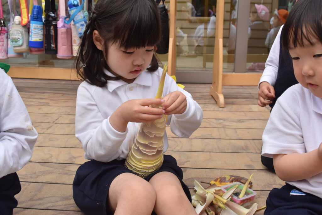 筍の皮も子どもたちがむき、「むいてもむいても皮が出てくる!」「よく見ると毛も生えてるよ!」と発見をしながら、1枚ずつ向いて友達に交代していきました。