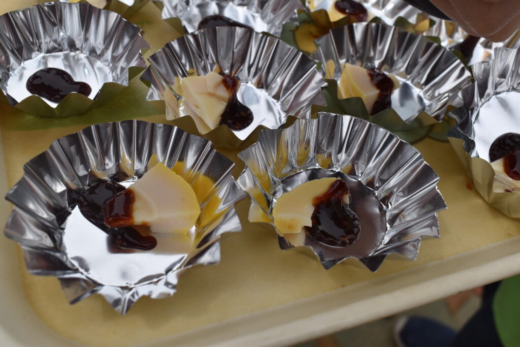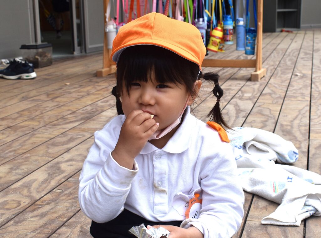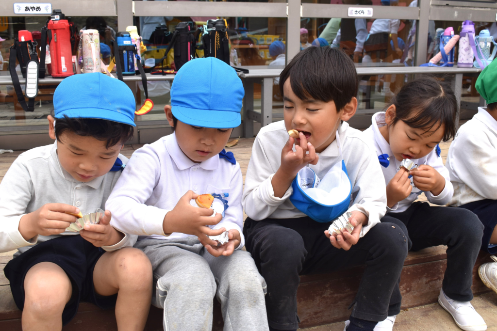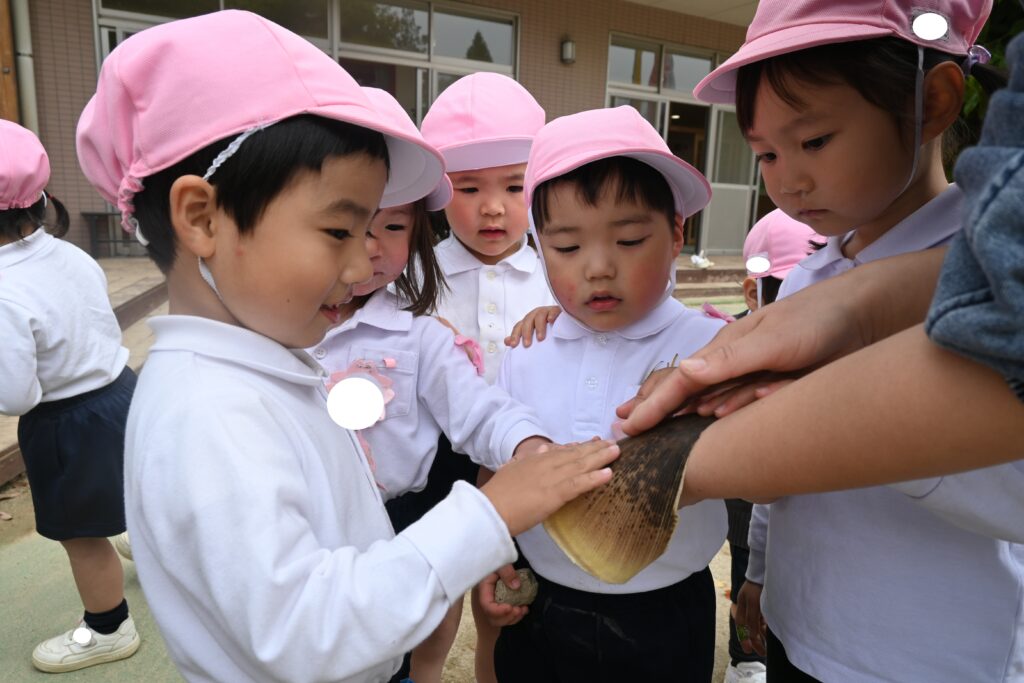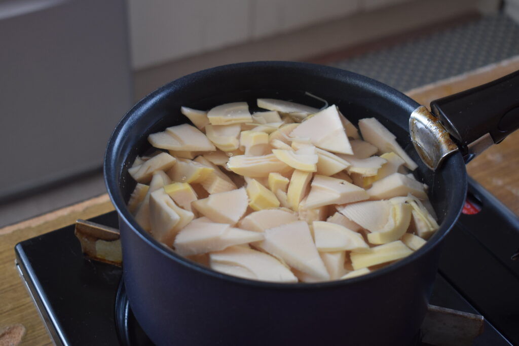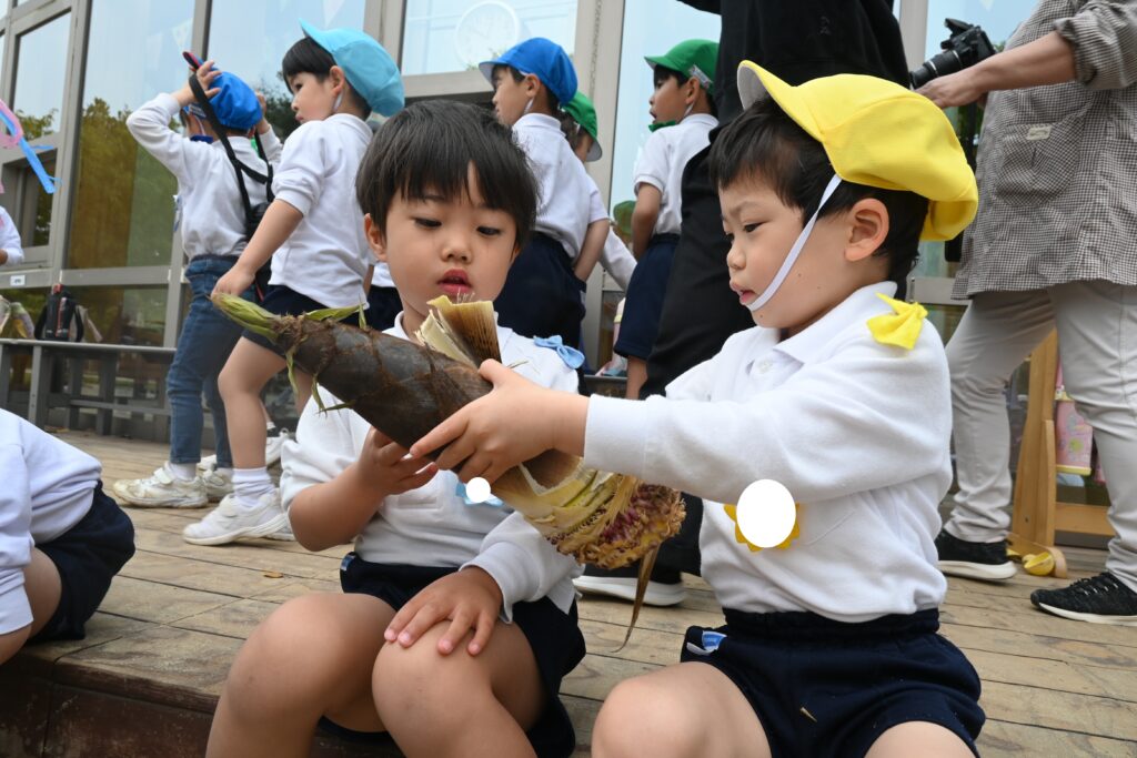 筍の皮も子どもたちがむき、「むいてもむいても皮が出てくる!」「よく見ると毛も生えてるよ!」と発見をしながら、1枚ずつ向いて友達に交代していきました。