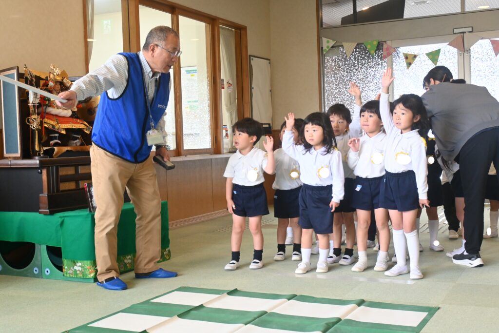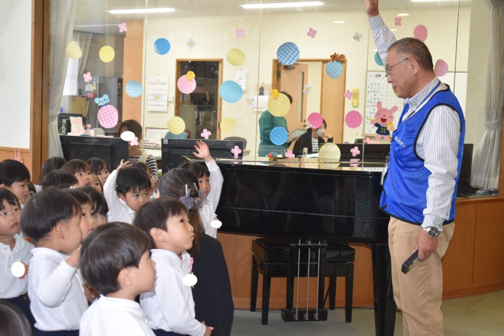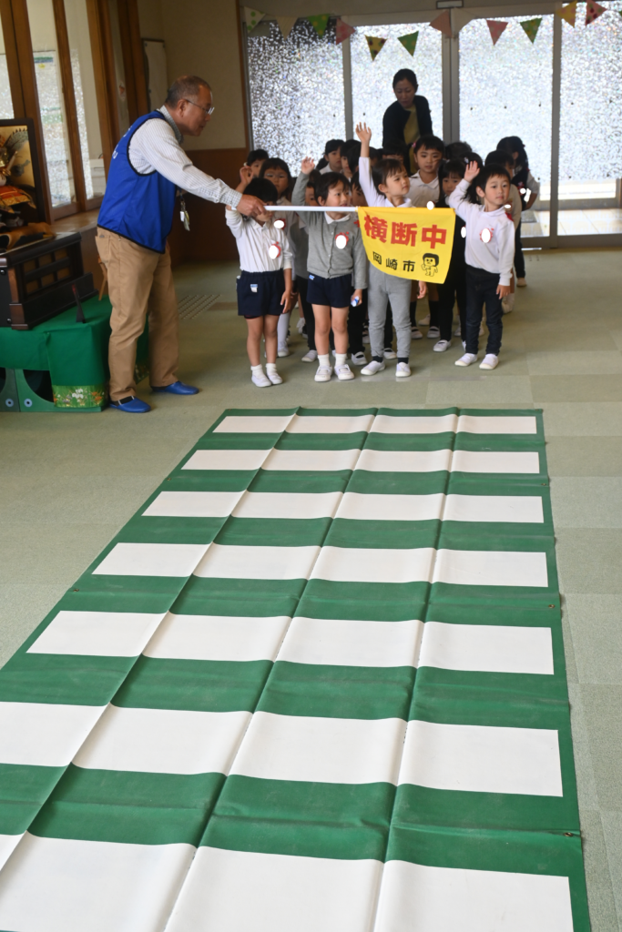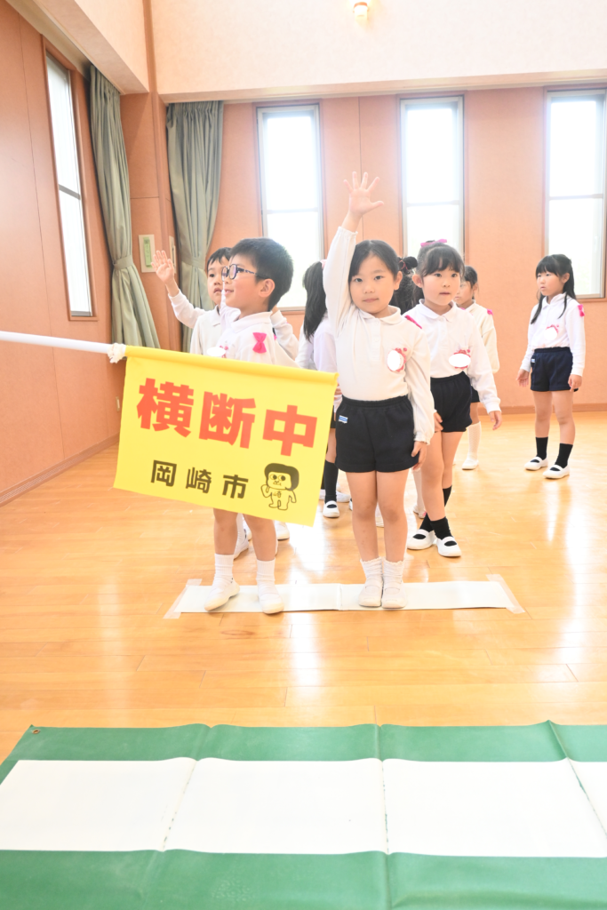 年中、年長組はホールで交通安全についての話を聞いたり、ビデオを見たりして横断歩道の渡り方について教えていただきました。
