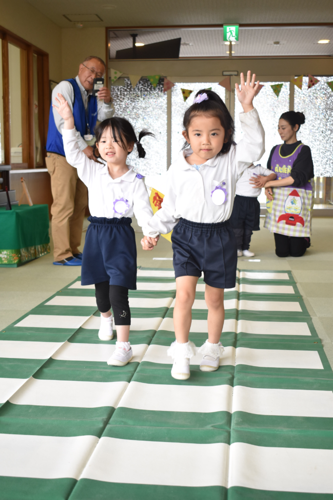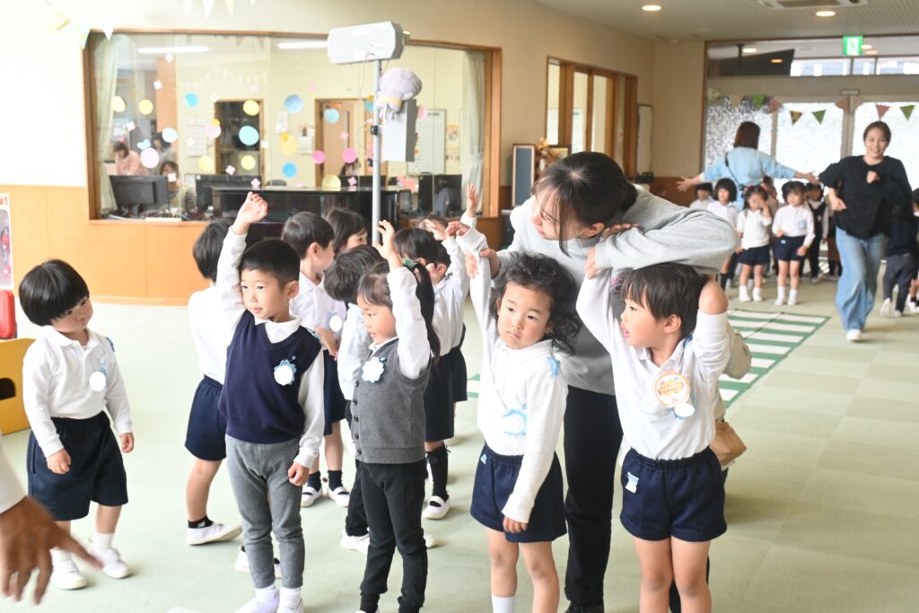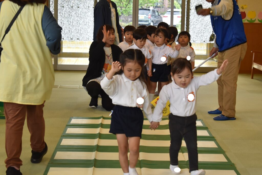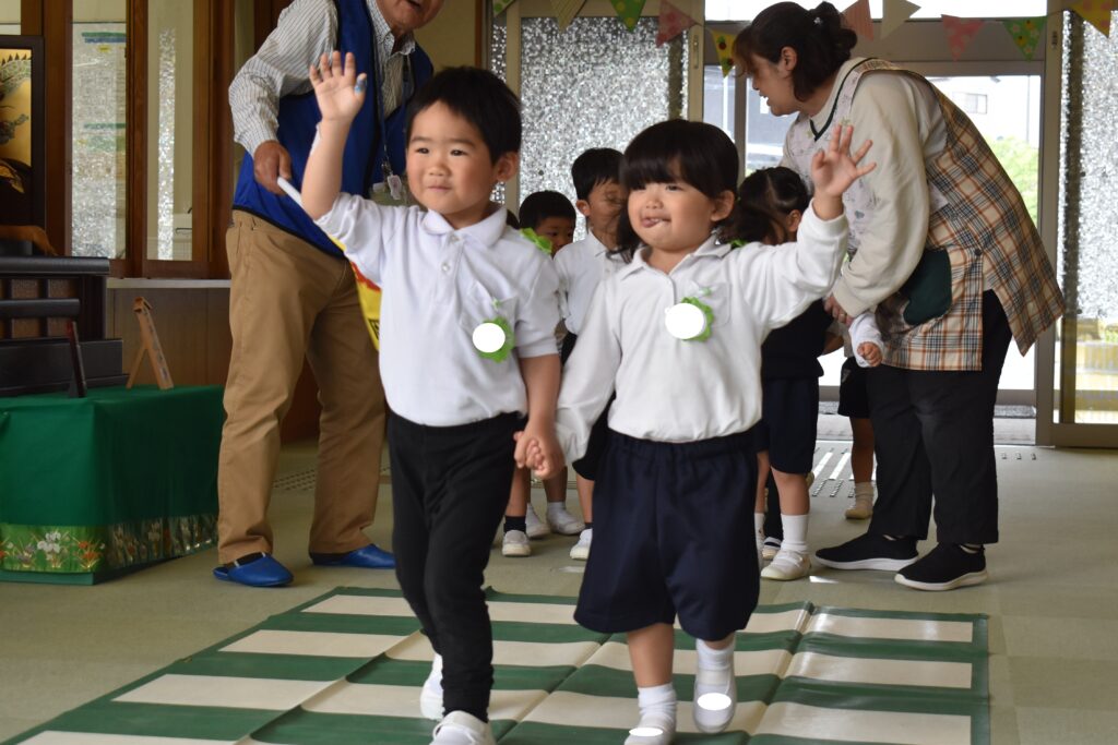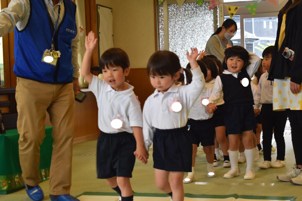 年中、年長組はホールで交通安全についての話を聞いたり、ビデオを見たりして横断歩道の渡り方について教えていただきました。