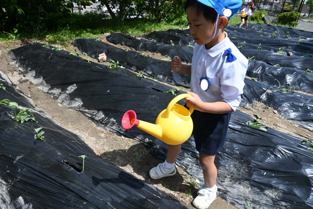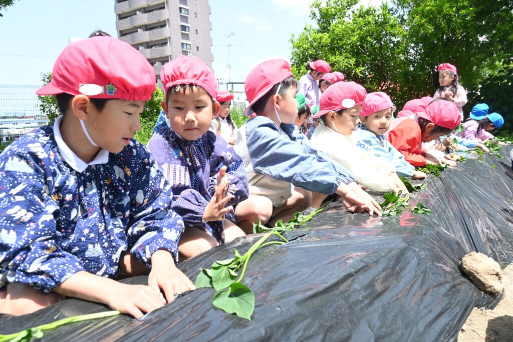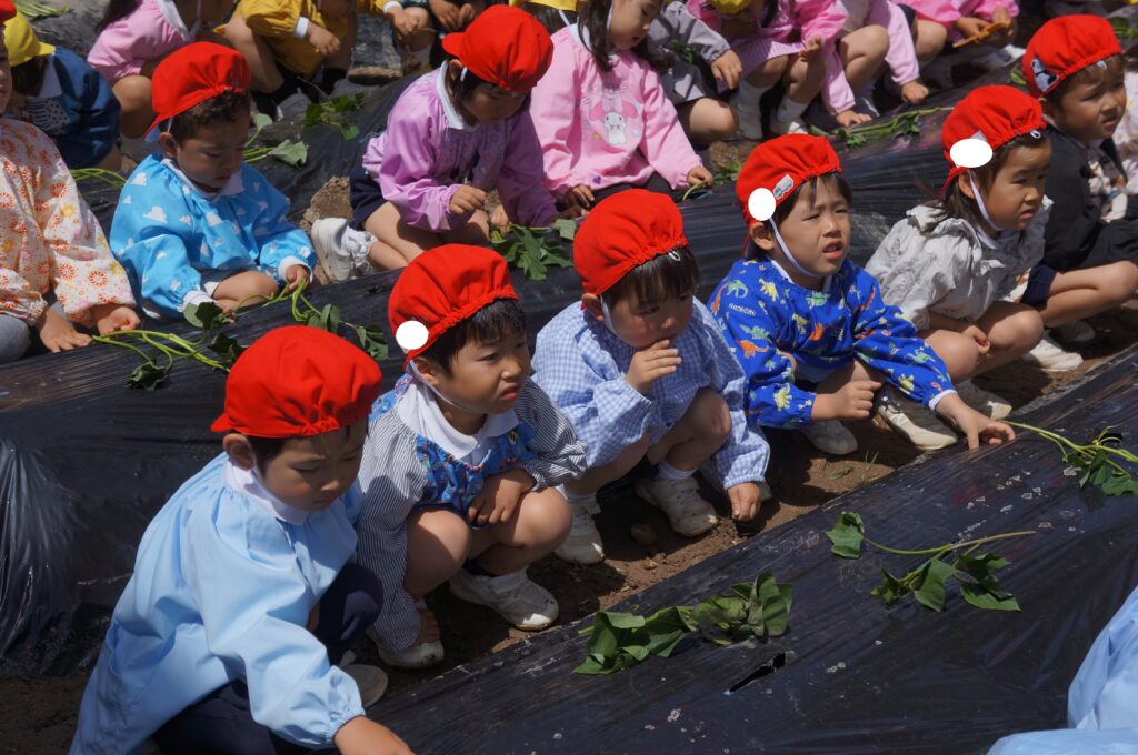 年中、年長組が幼稚園の裏にある畑で、さつまいもの苗差しをしました。