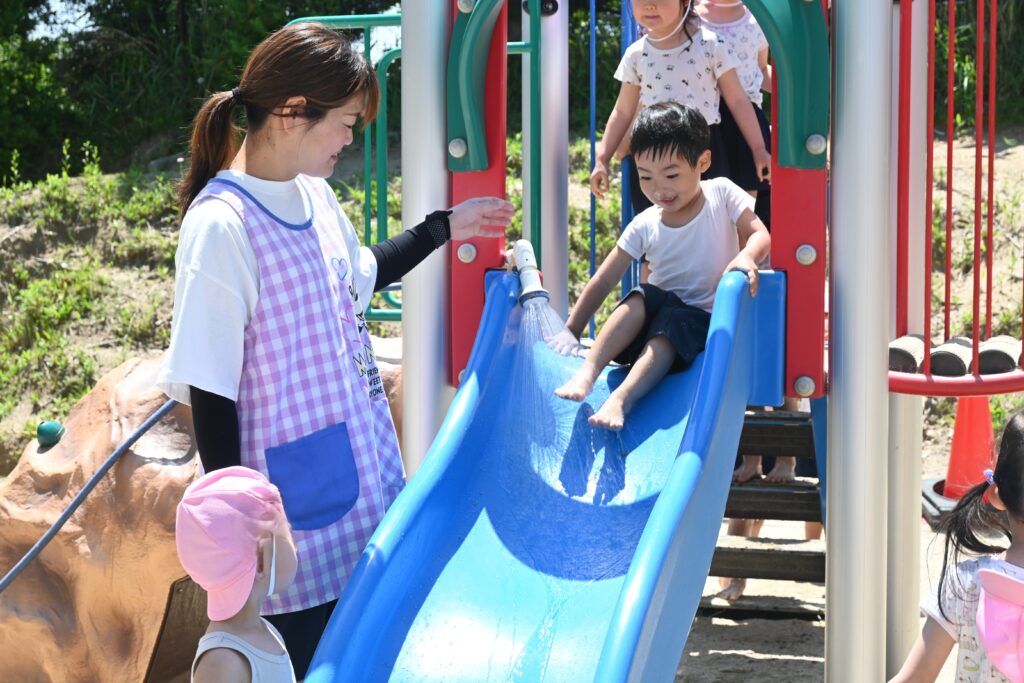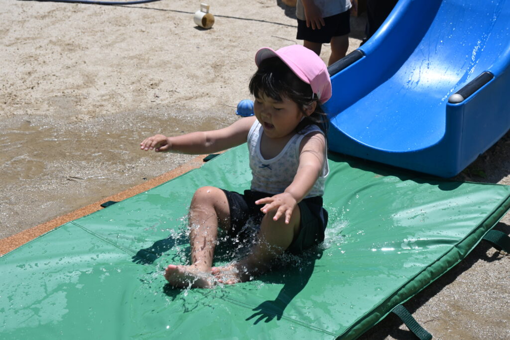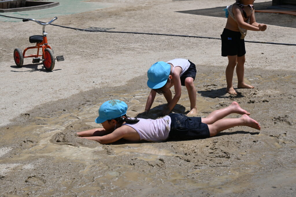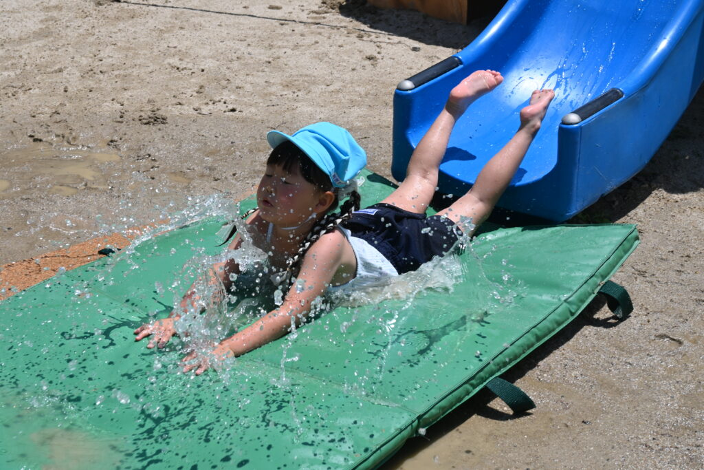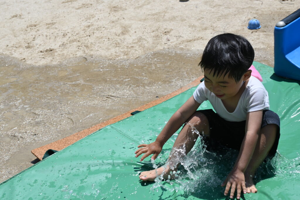 先生たちは迷います。「保育参観もあったし、ウォ-タ-スライダーで遊んでいると、少し給食の始まり時間は遅くなるし・・・」でも、やっぱり「えーい、遊んじゃおう!」と大決心。色々なクラスの子どもたちが飛び出してきました。水と砂、幼児期の子どもたちの成長には欠かせない遊びです。