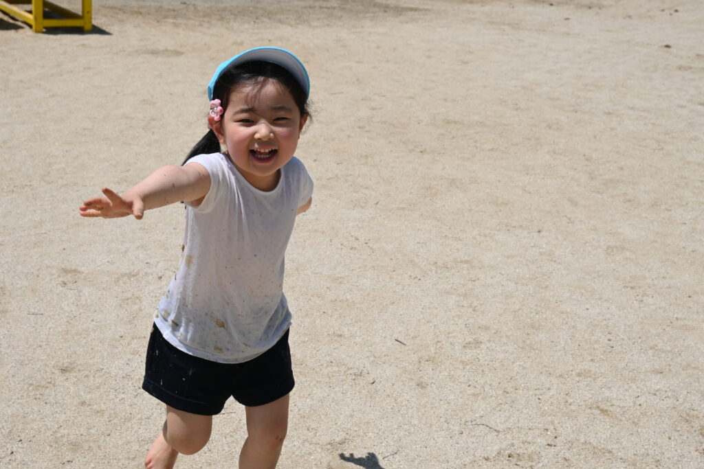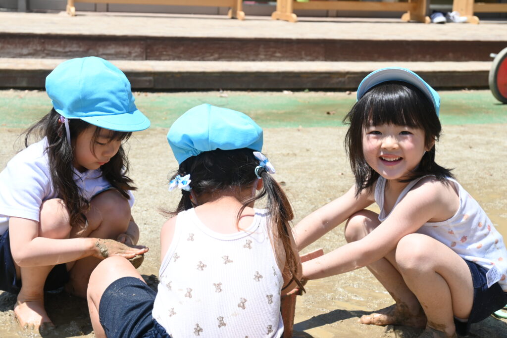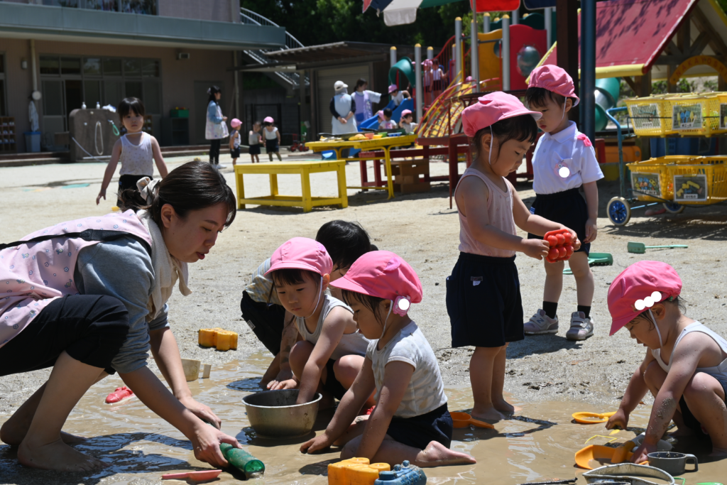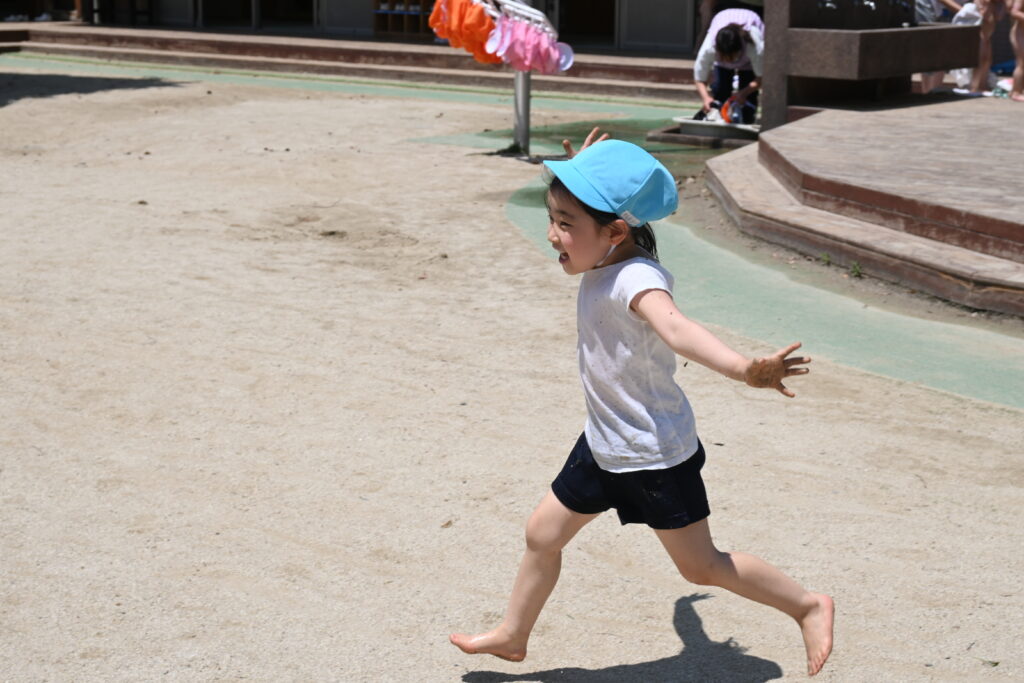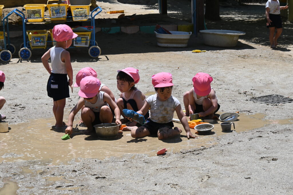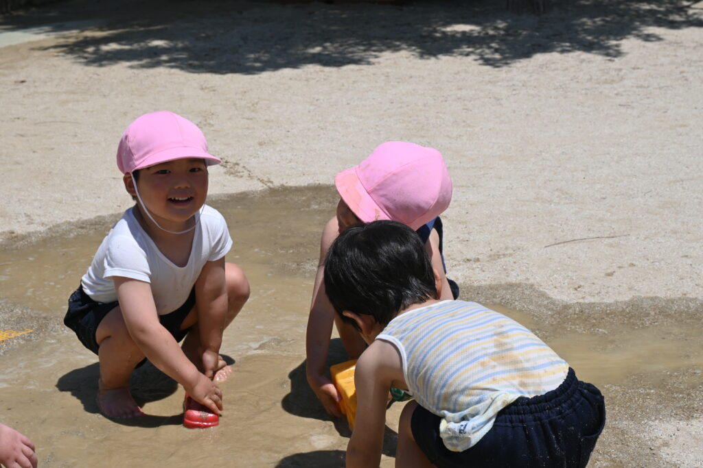 先生たちは迷います。「保育参観もあったし、ウォ-タ-スライダーで遊んでいると、少し給食の始まり時間は遅くなるし・・・」でも、やっぱり「えーい、遊んじゃおう!」と大決心。色々なクラスの子どもたちが飛び出してきました。水と砂、幼児期の子どもたちの成長には欠かせない遊びです。