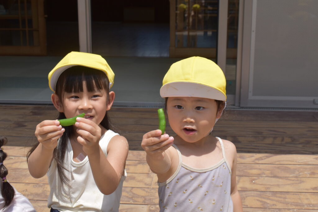 「お豆が大きくなってる!」「本当だ!パンパンに膨らんでるね!」と大きく育ったことを喜びながら収穫しました。