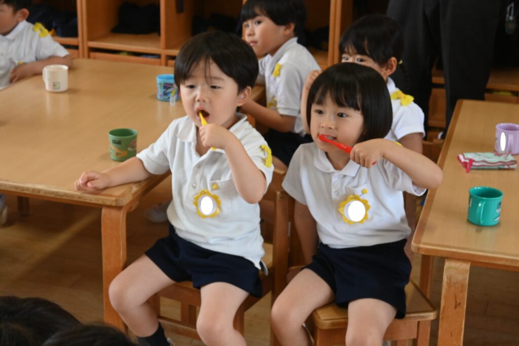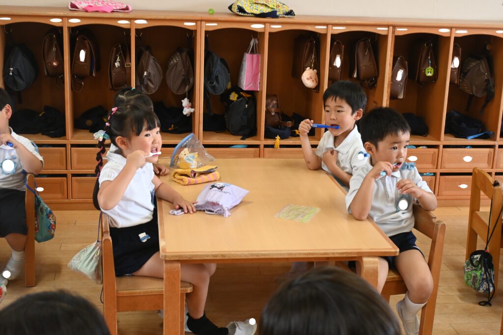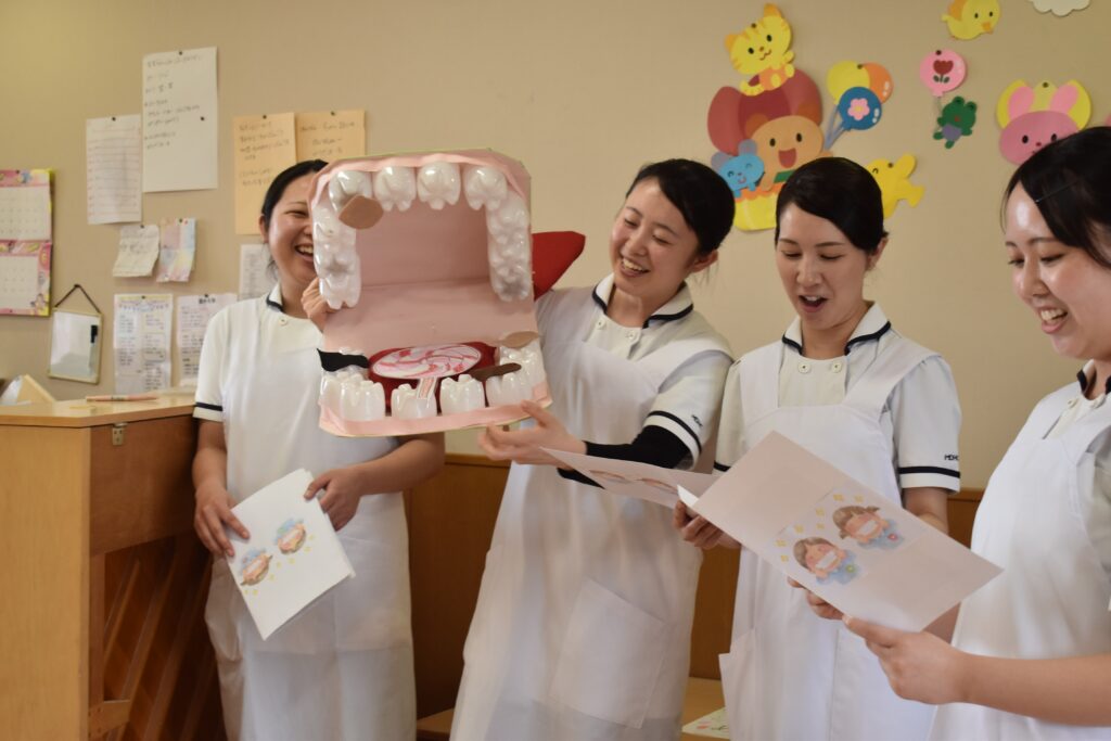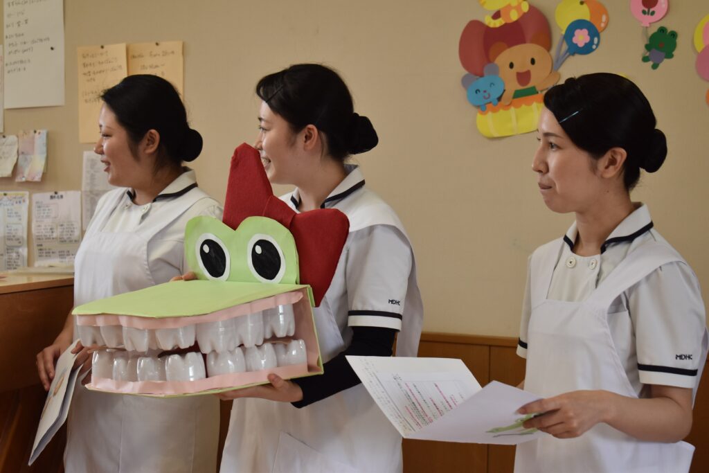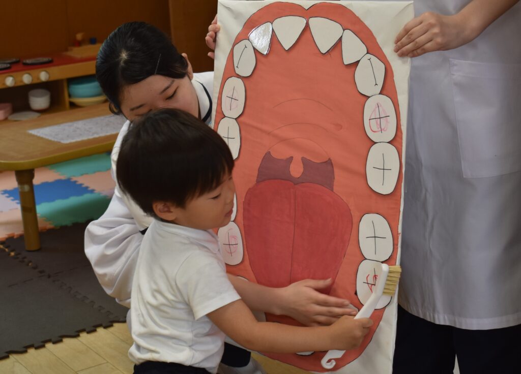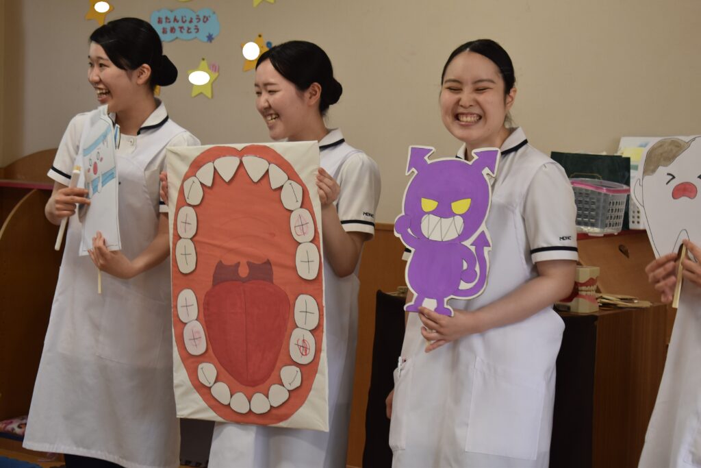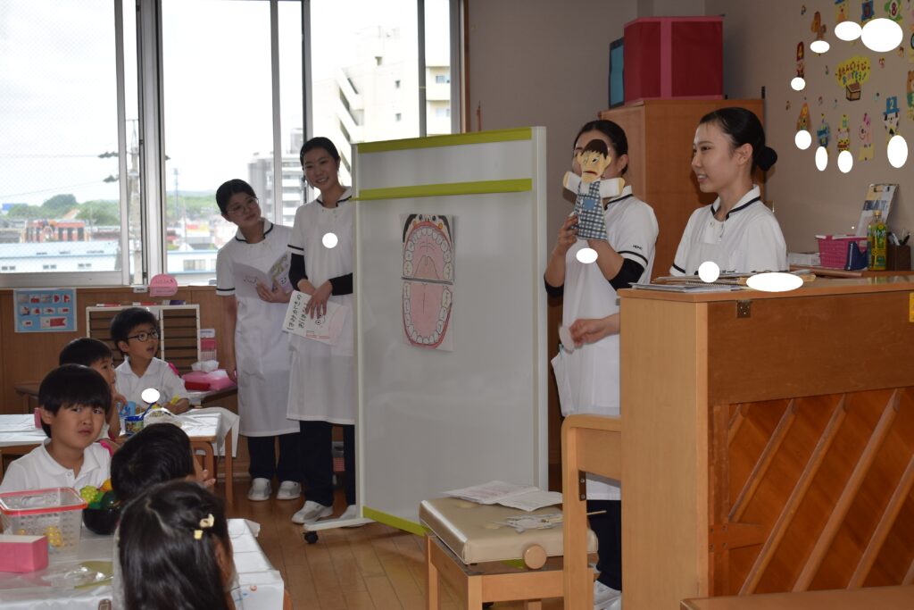手作りの教材で分かりやすく、楽しく、歯磨きの大切さや歯ブラシの持ち方や磨き方を教えてくれました♪優しいお姉さんたち、ありがとう。