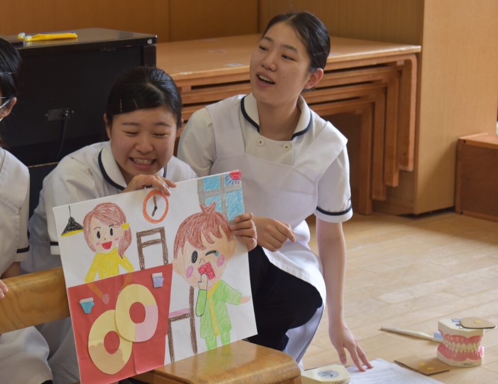歯科検診後には、クラスで三河歯科衛生専門学校の学生さんによる、歯磨き指導がありました。