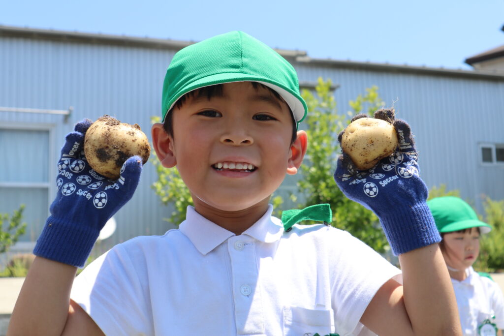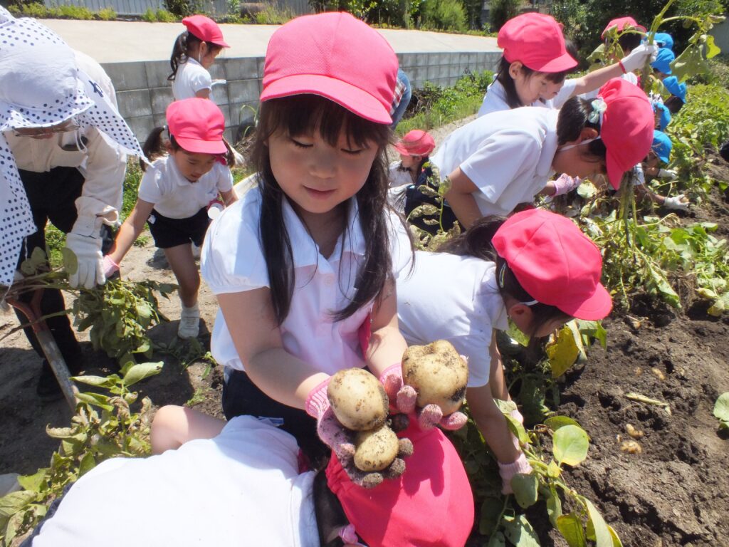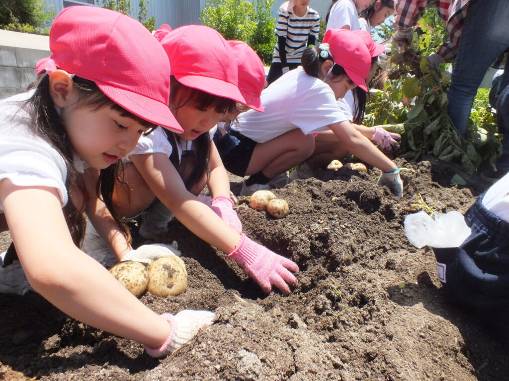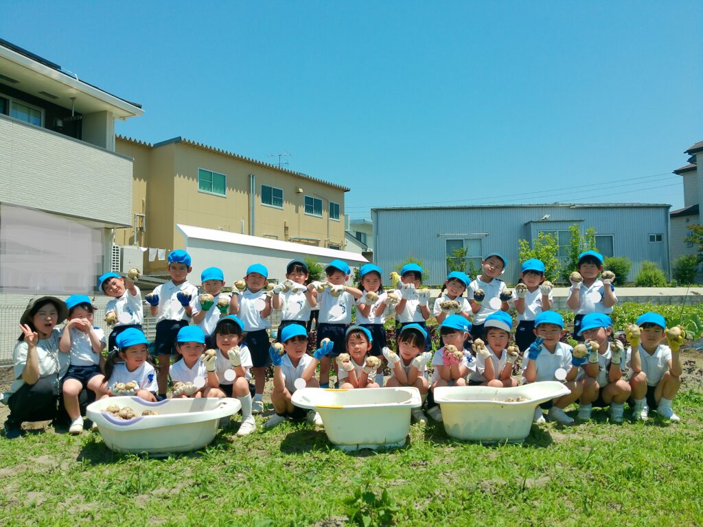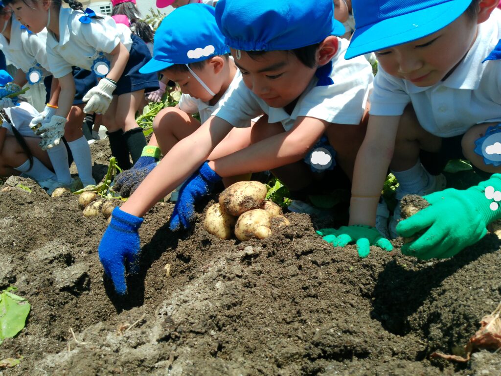 年長児が浅井先生の畑にじゃがいもを堀りに出かけました。葉っぱを抜いて、どんどんほると中から大きなじゃがいもが沢山出てきました。一緒にミミズも出てきて大盛り上がり!!