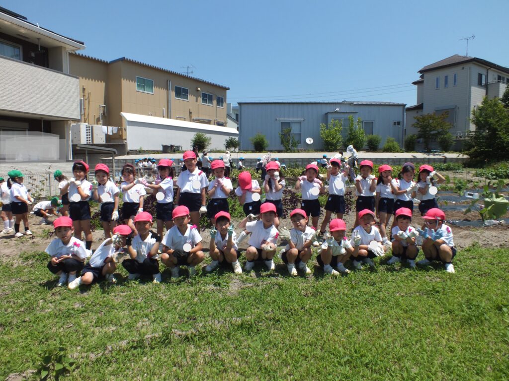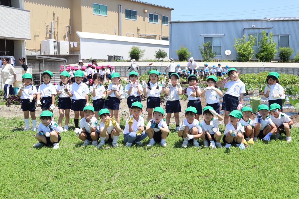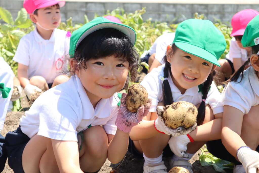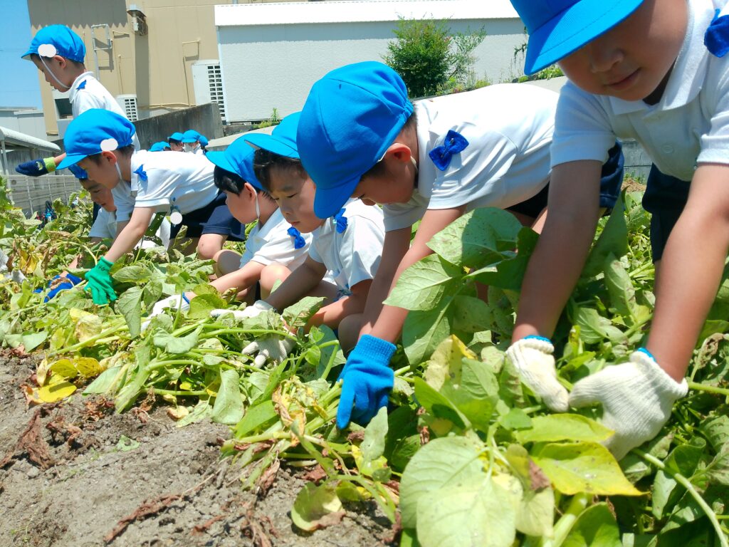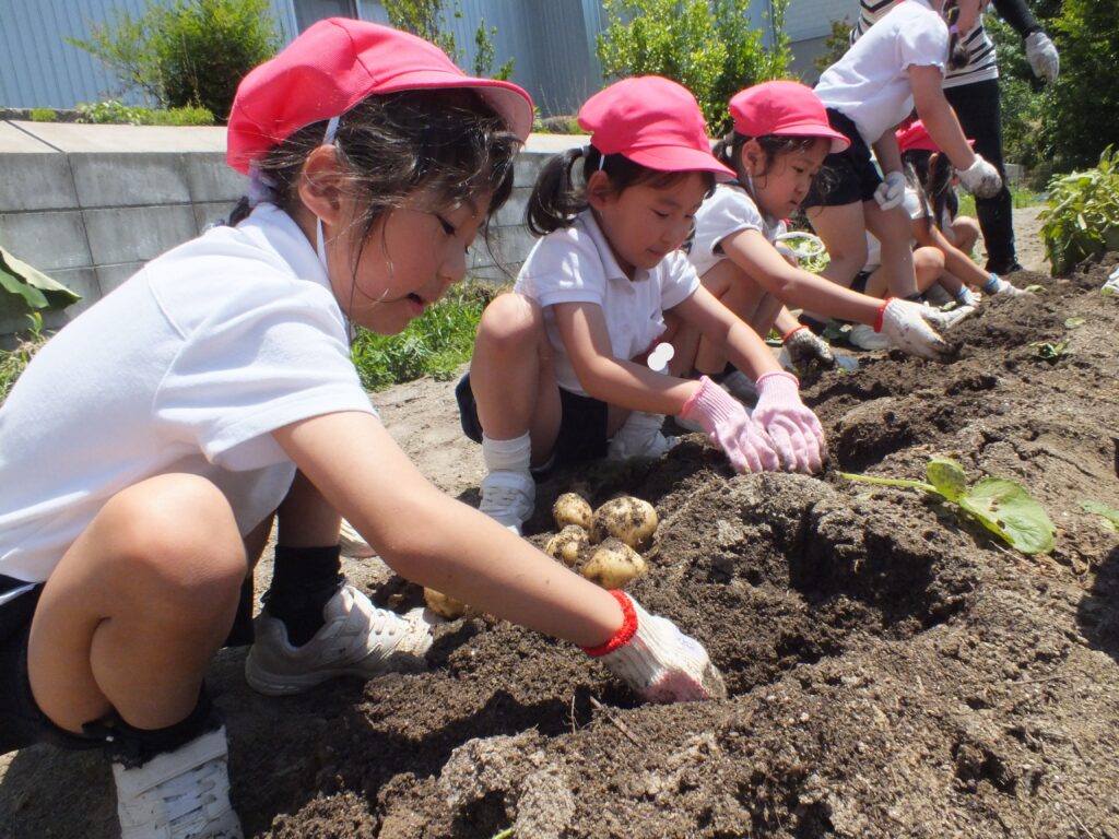 年長児が浅井先生の畑にじゃがいもを堀りに出かけました。葉っぱを抜いて、どんどんほると中から大きなじゃがいもが沢山出てきました。一緒にミミズも出てきて大盛り上がり!!