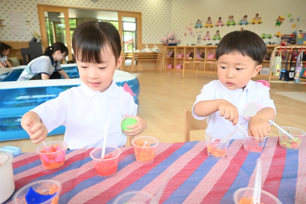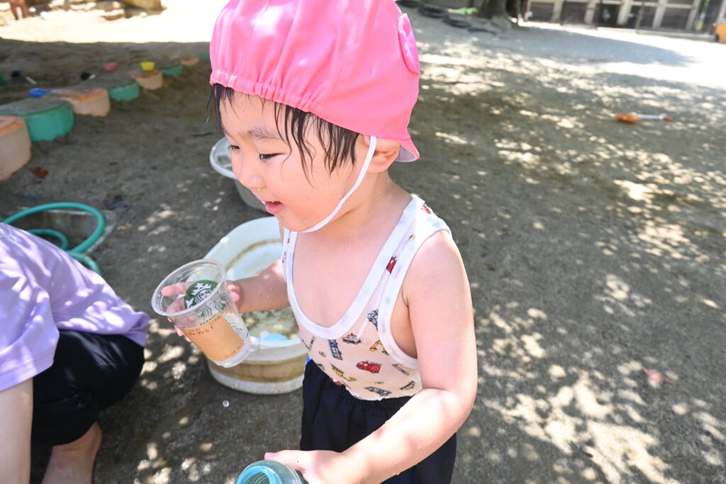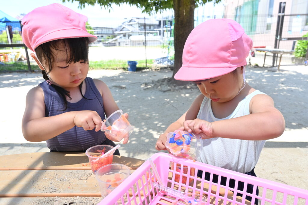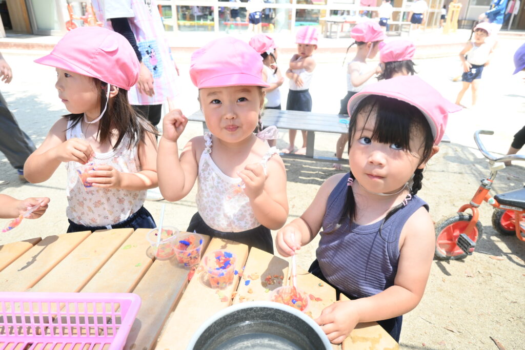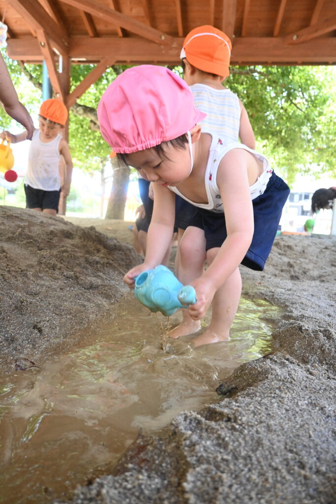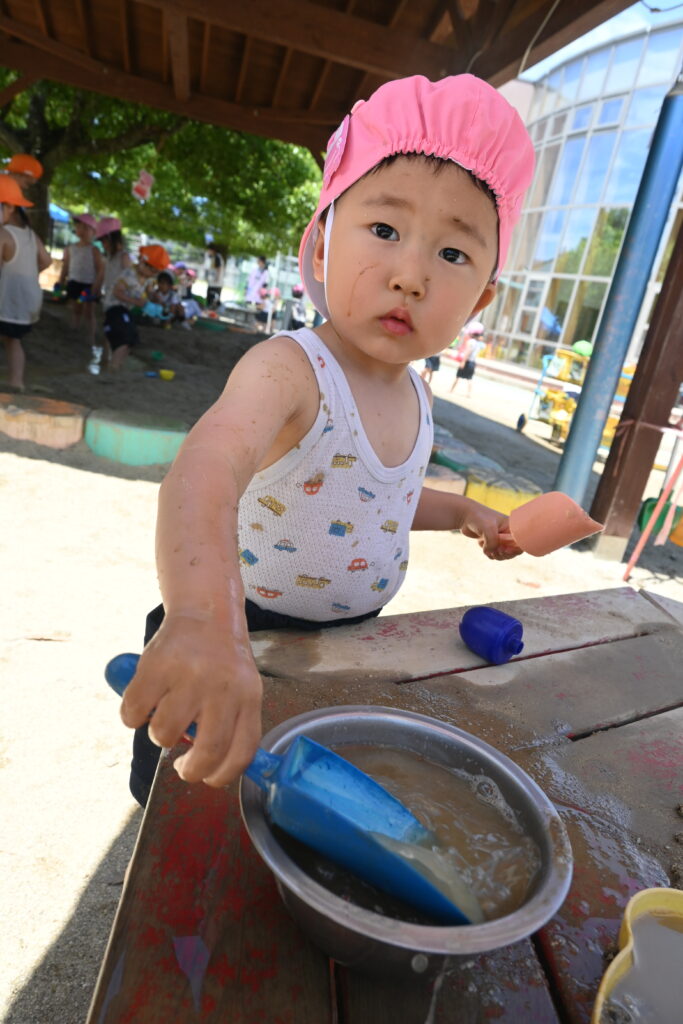 昨日のゼリー屋さんの続きがしたい子、ウォータースライダーを楽しんでいる子、泥に入って感触を確かめている子。毎日にこにこの満3歳児クラスの子どもたち。「楽しすぎ~」そんな声も聞こえてきます。