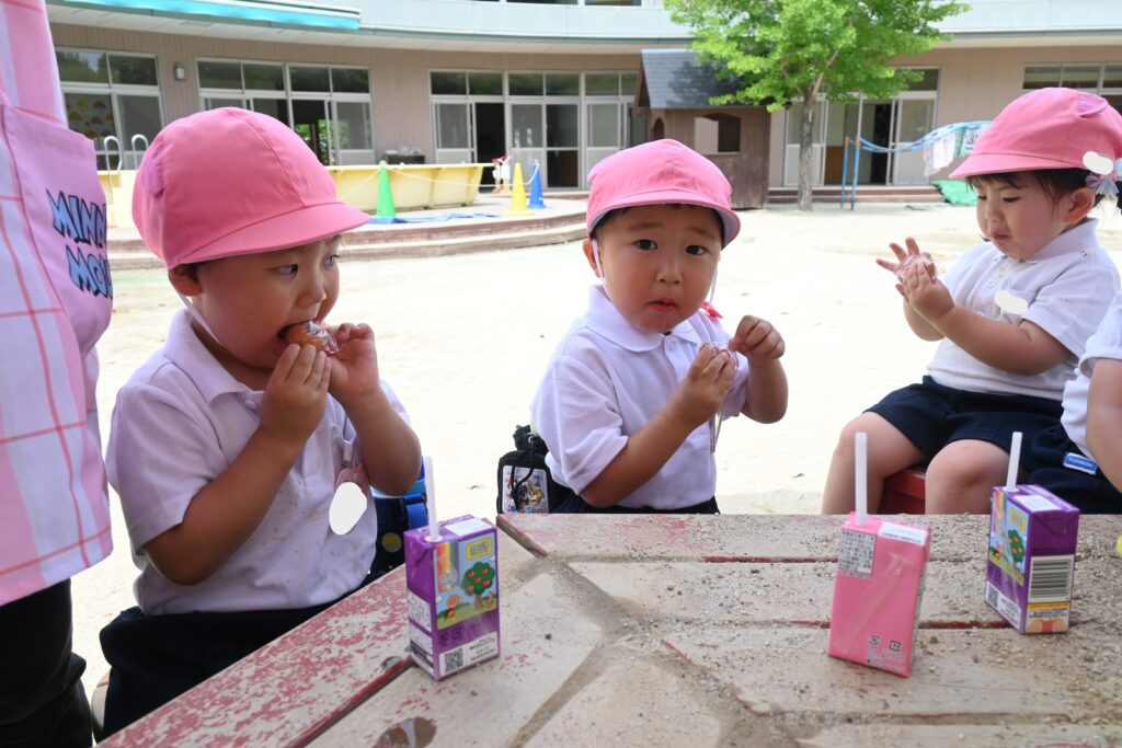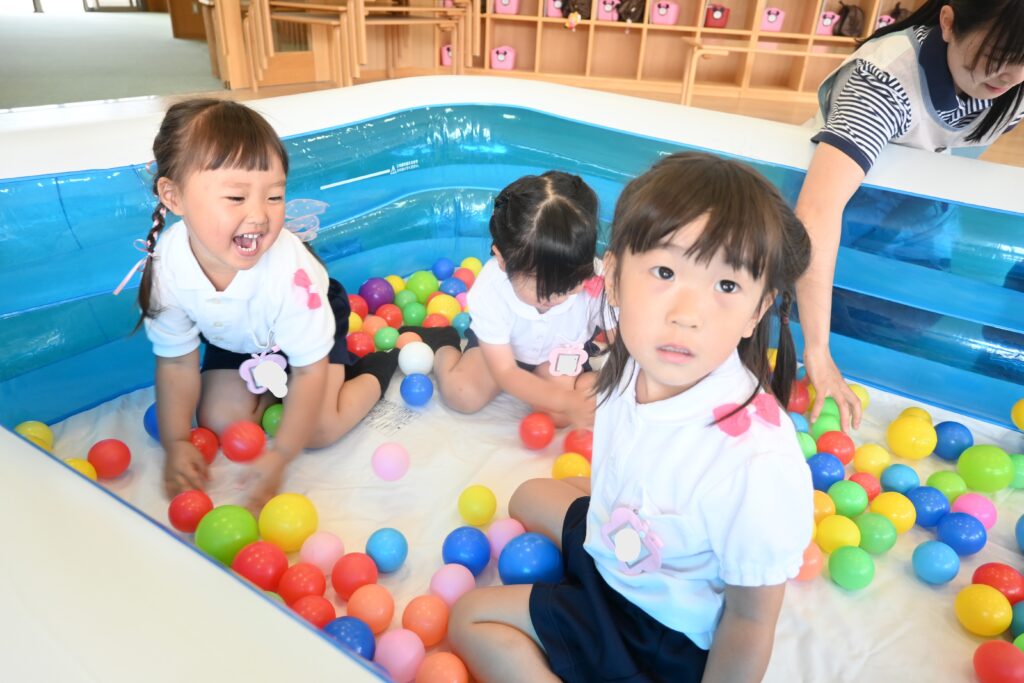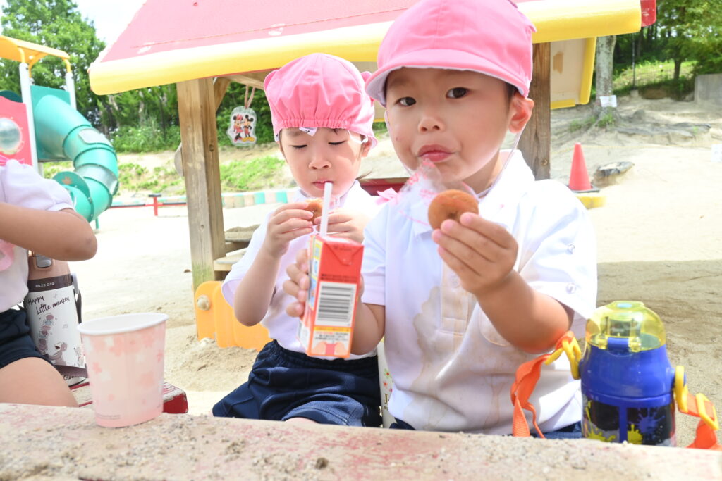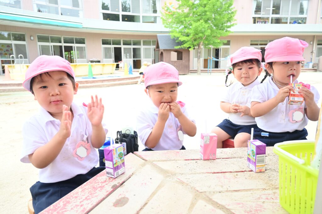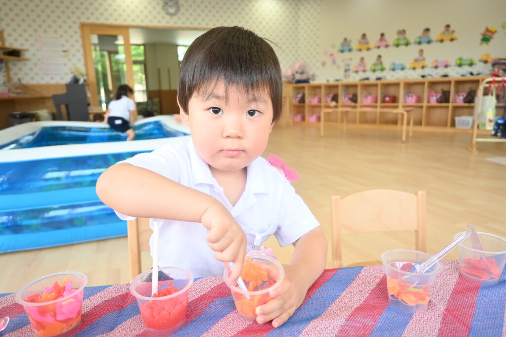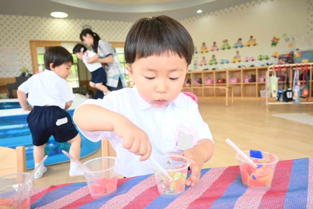 昨日のゼリー屋さんの続きがしたい子、ウォータースライダーを楽しんでいる子、泥に入って感触を確かめている子。毎日にこにこの満3歳児クラスの子どもたち。「楽しすぎ~」そんな声も聞こえてきます。