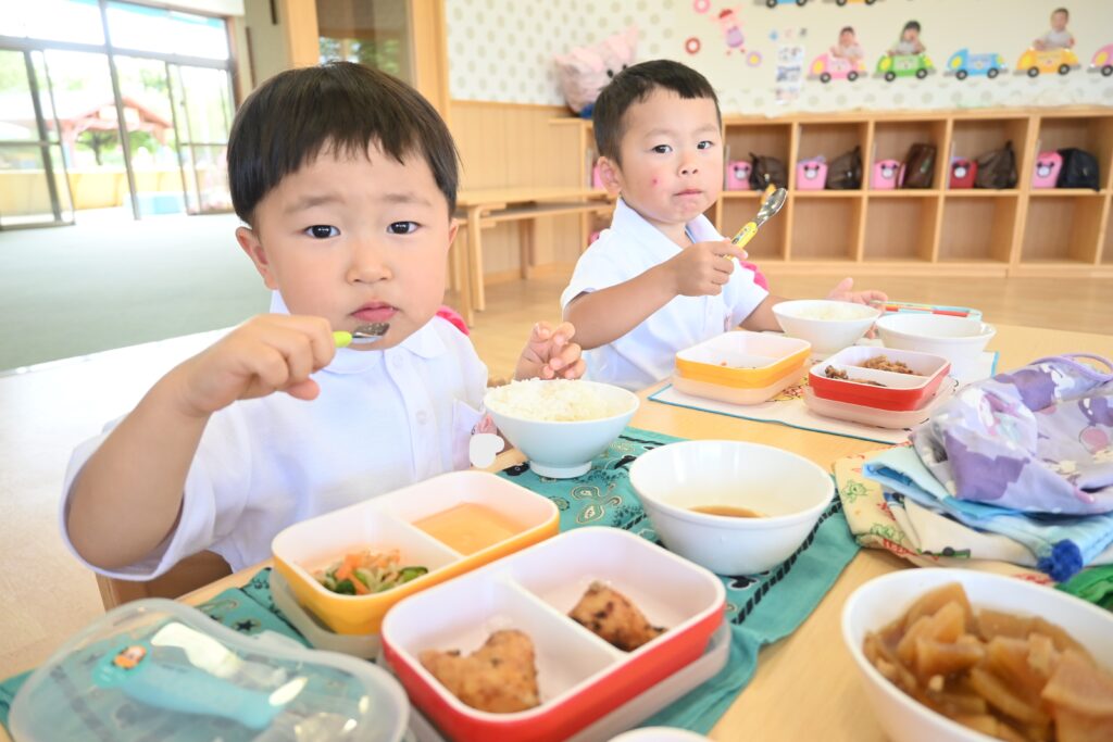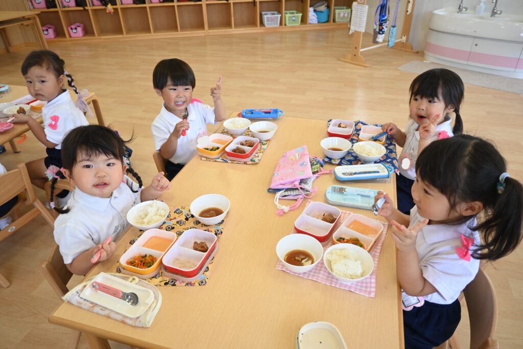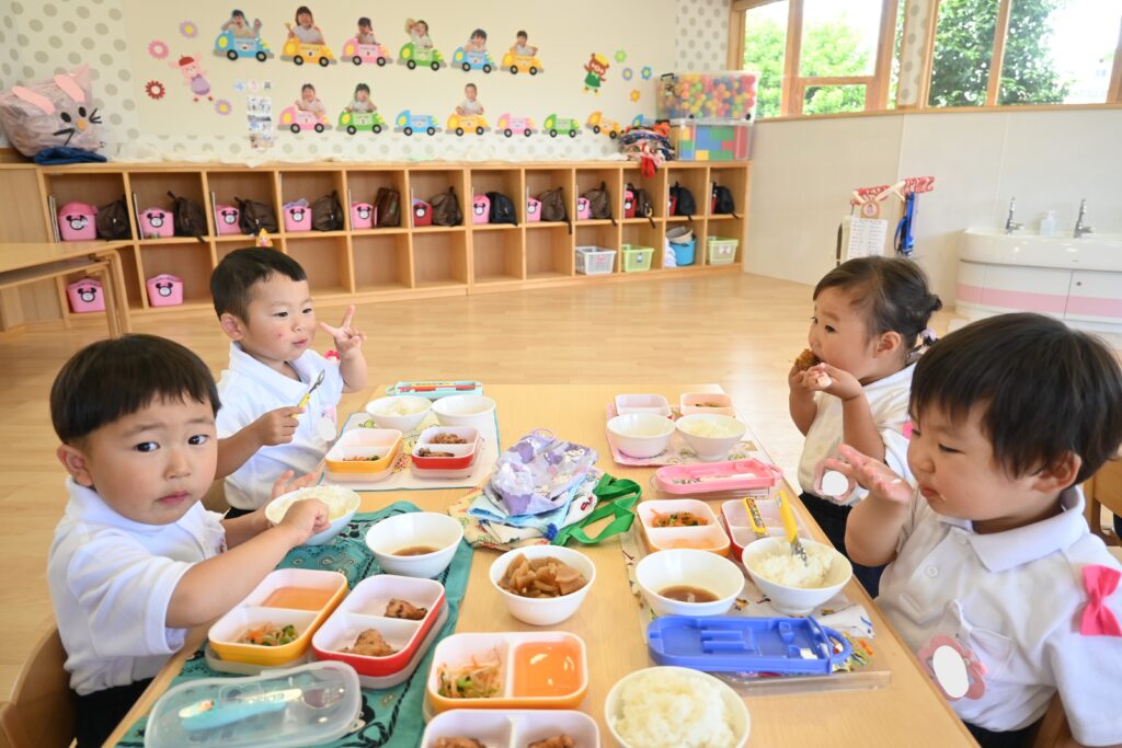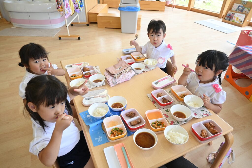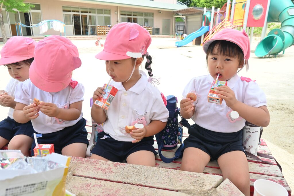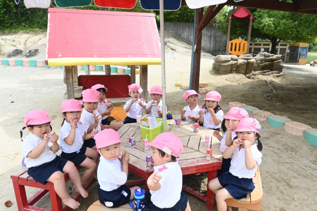 昨日のゼリー屋さんの続きがしたい子、ウォータースライダーを楽しんでいる子、泥に入って感触を確かめている子。毎日にこにこの満3歳児クラスの子どもたち。「楽しすぎ~」そんな声も聞こえてきます。