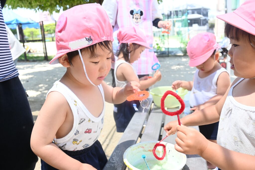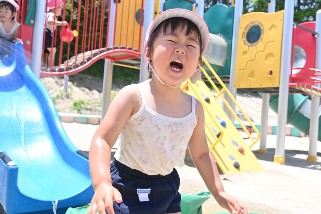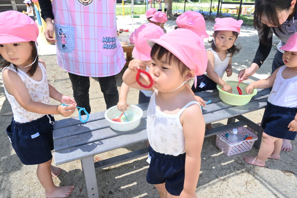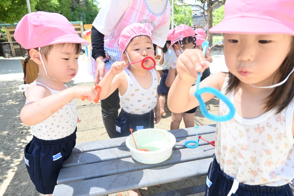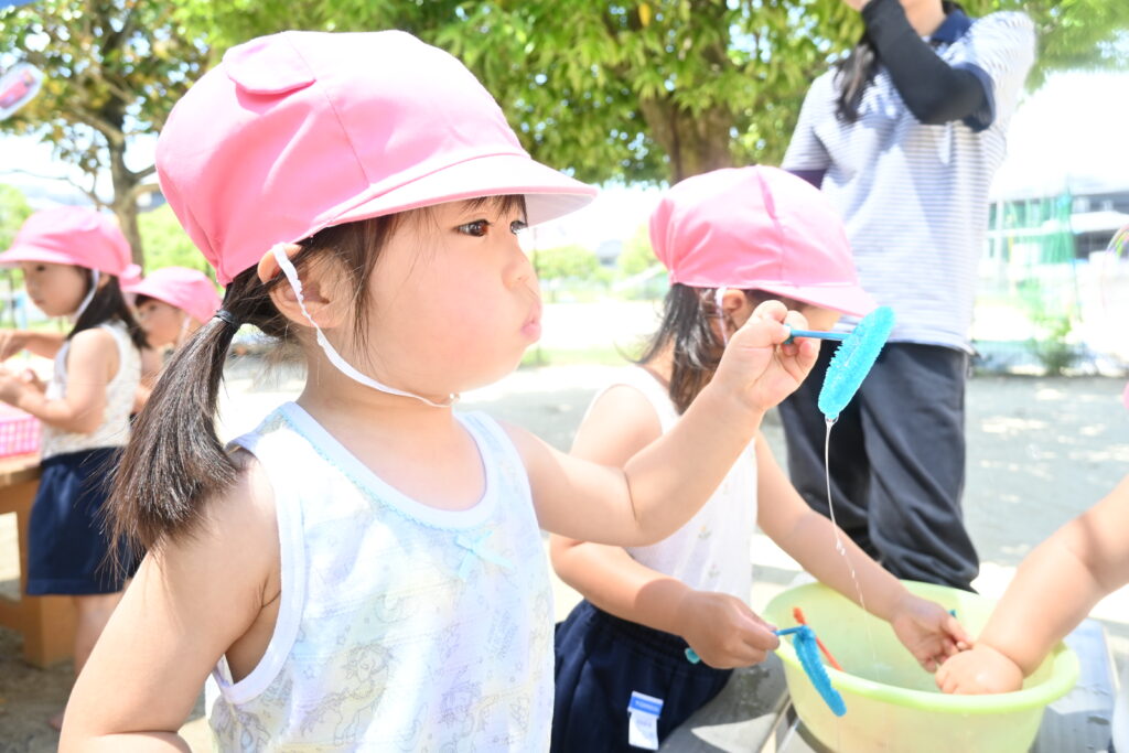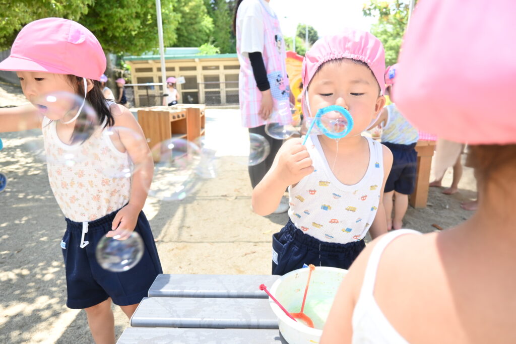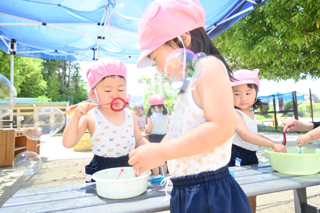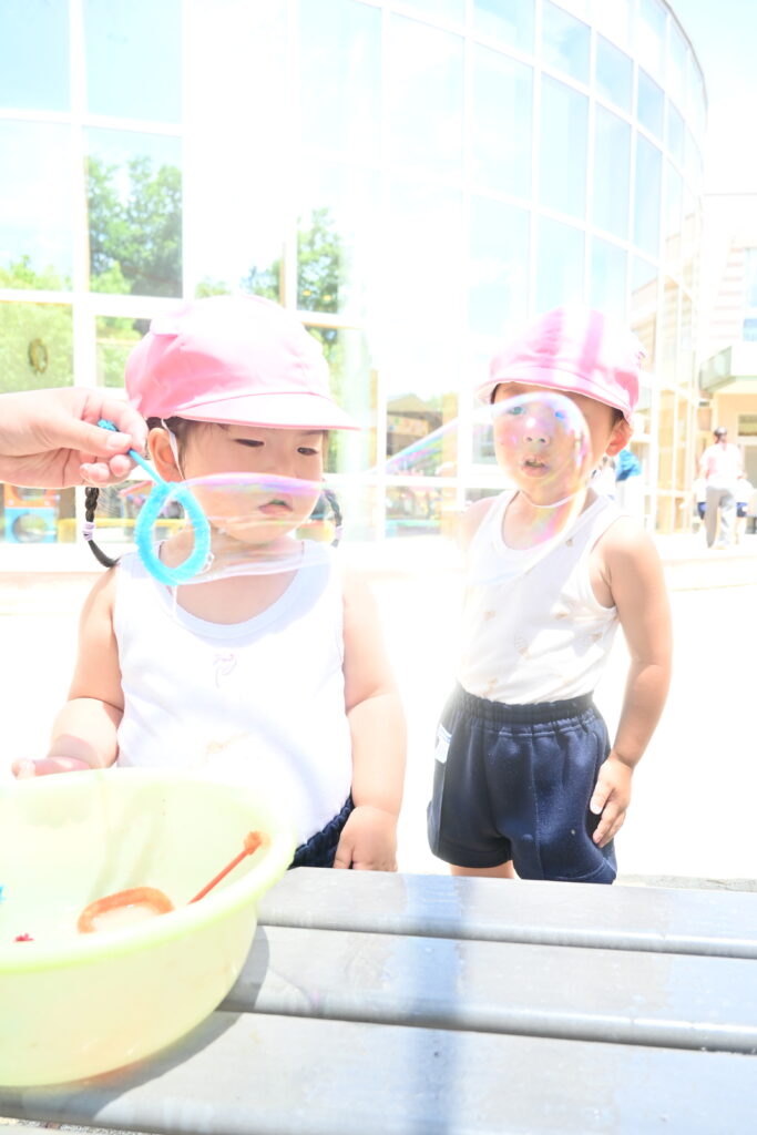 「楽しすぎ~!」 しゃぼん玉、ウォータースライダーに挑戦♪(満3歳うさぎ組)