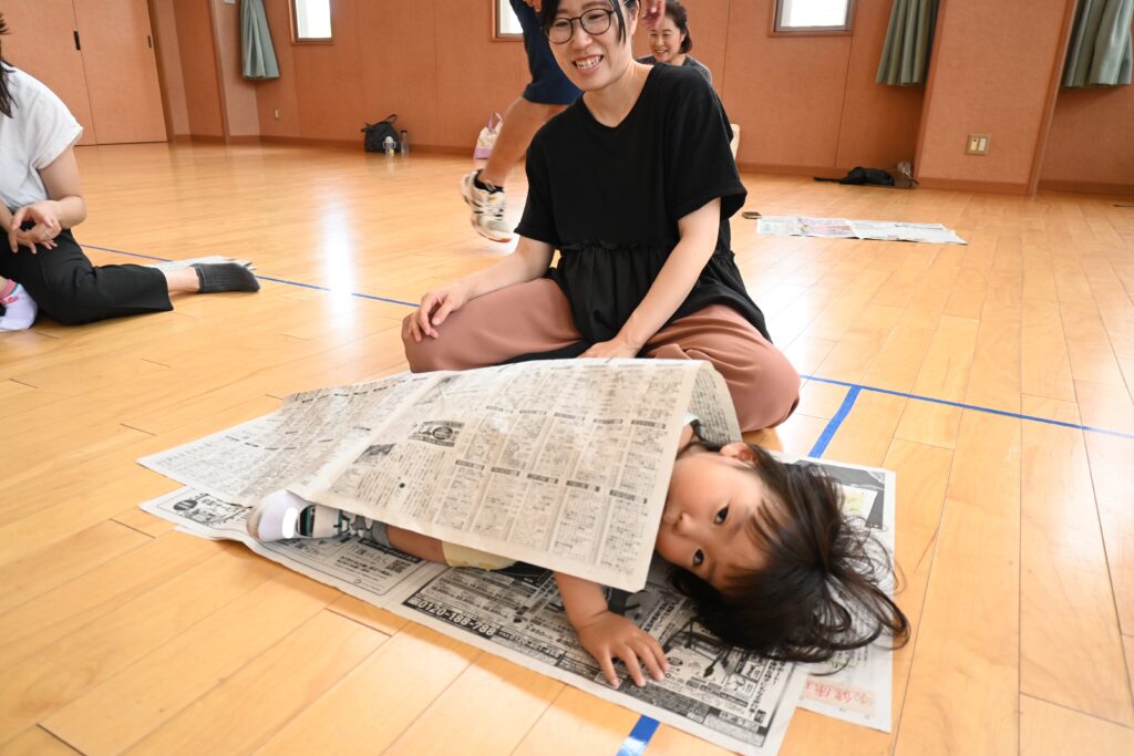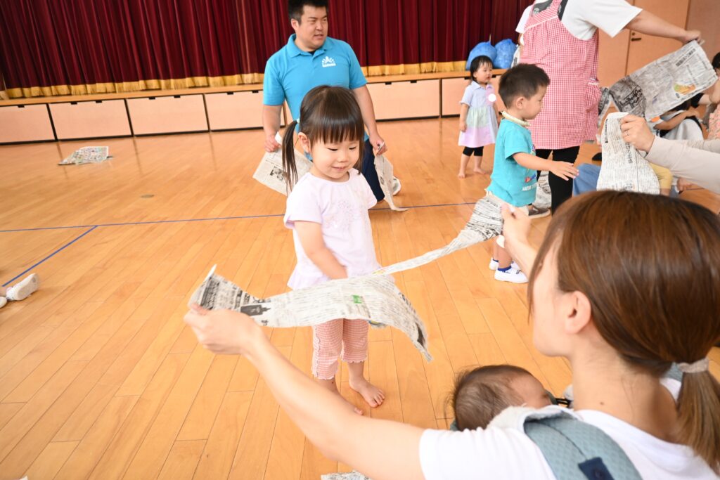 今日のさわらび広場は新聞紙遊びと身体を動かして遊ぼうをしました。新聞紙に座ったり、棒にしたり、破いて遊んだりしました!破いた新聞紙は雨のように降らしてみました☆
