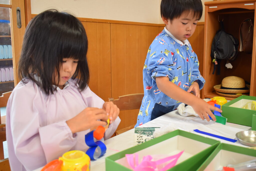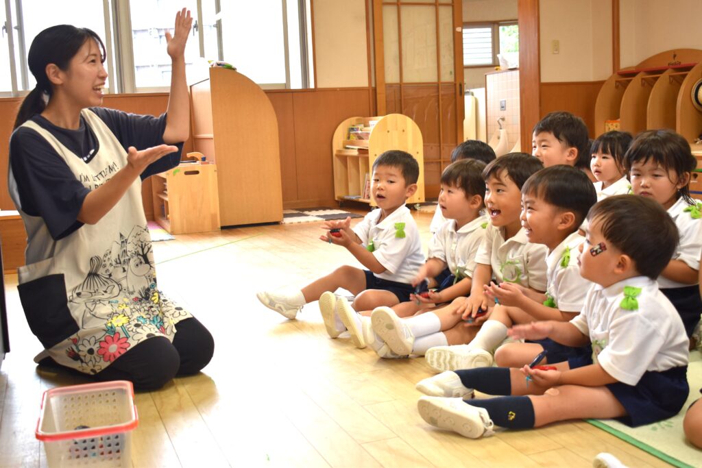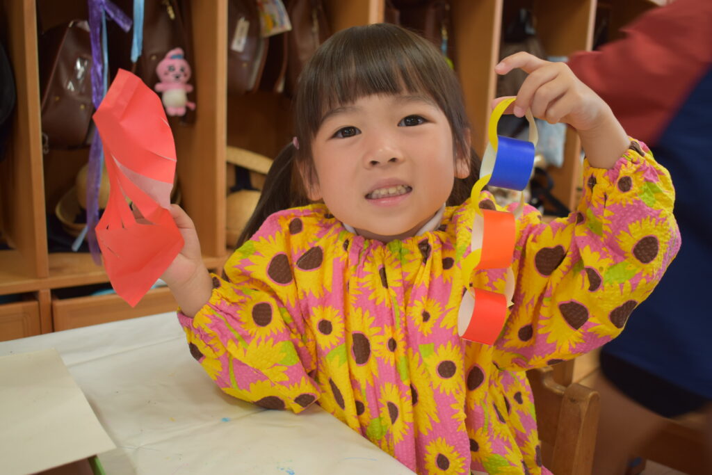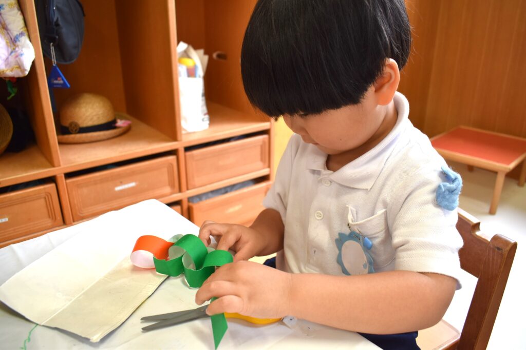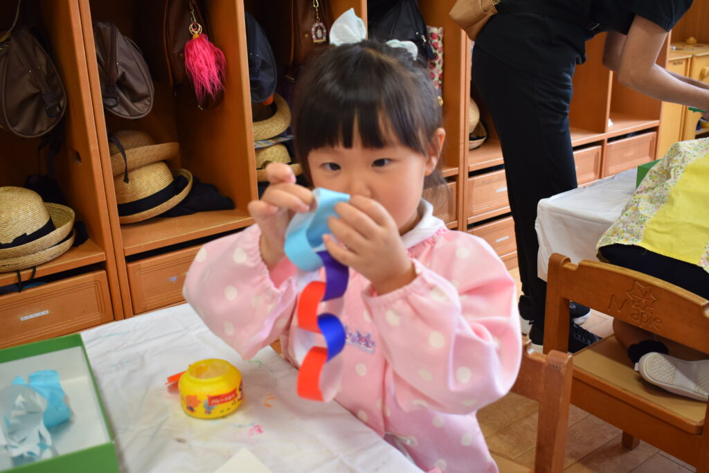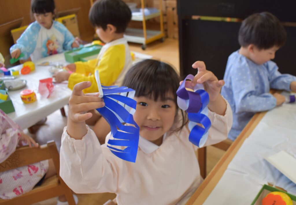 午前中は雨模様。部屋の中をのぞいてみると、カスタネット遊びや七夕制作に一生懸命な表情の子どもたち。