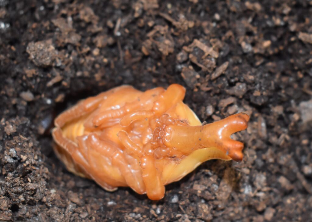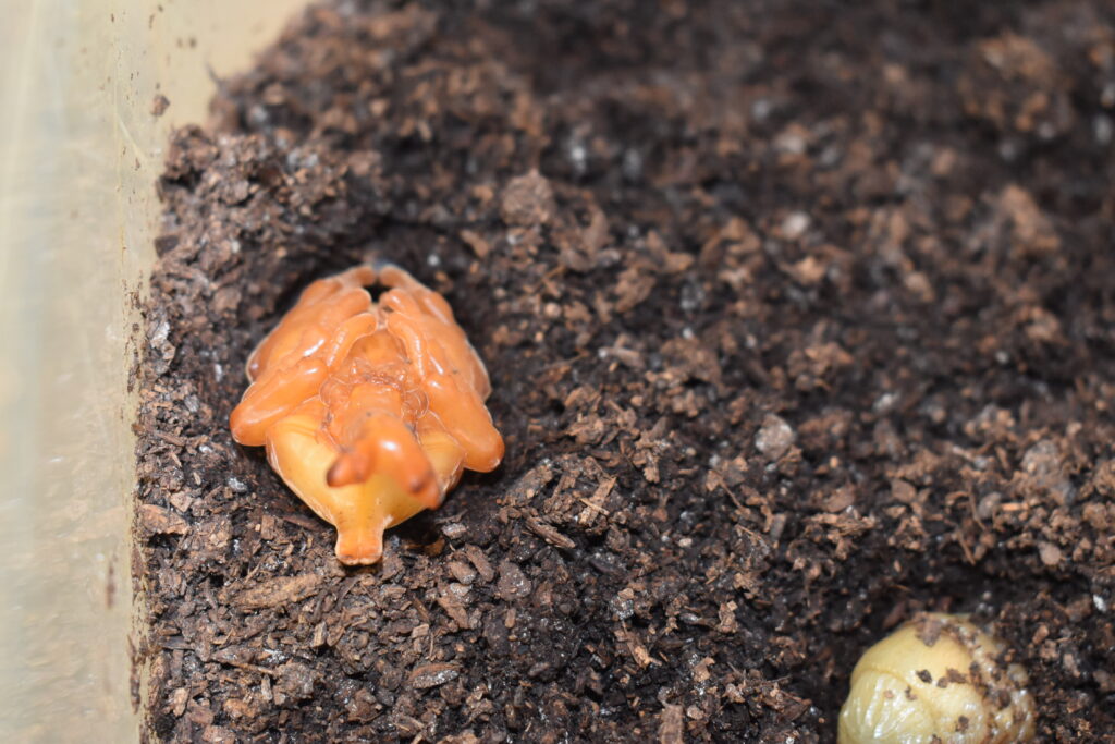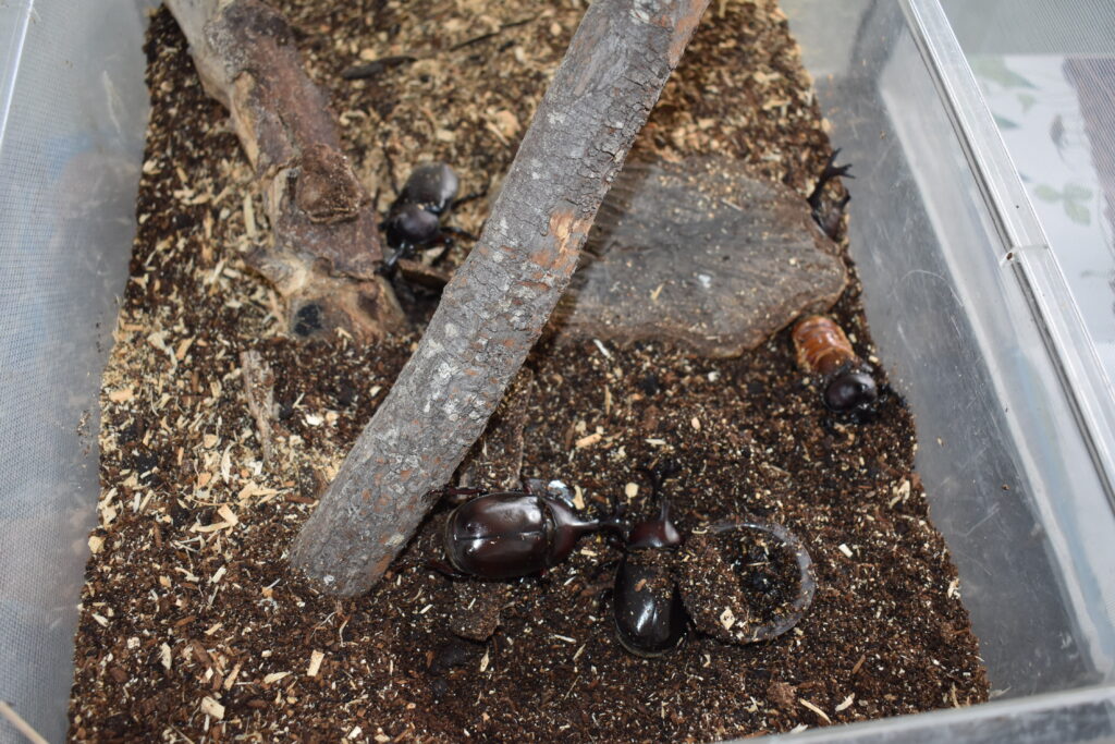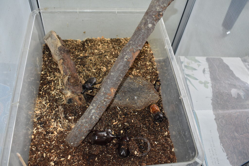 冬の間には土が乾燥しないようにしたり、汚れた土を取り替えたりしながら大切に世話をしてきました。幼虫からさなぎになり、先日、りっぱなかぶとむしがたくさん生まれてきました。