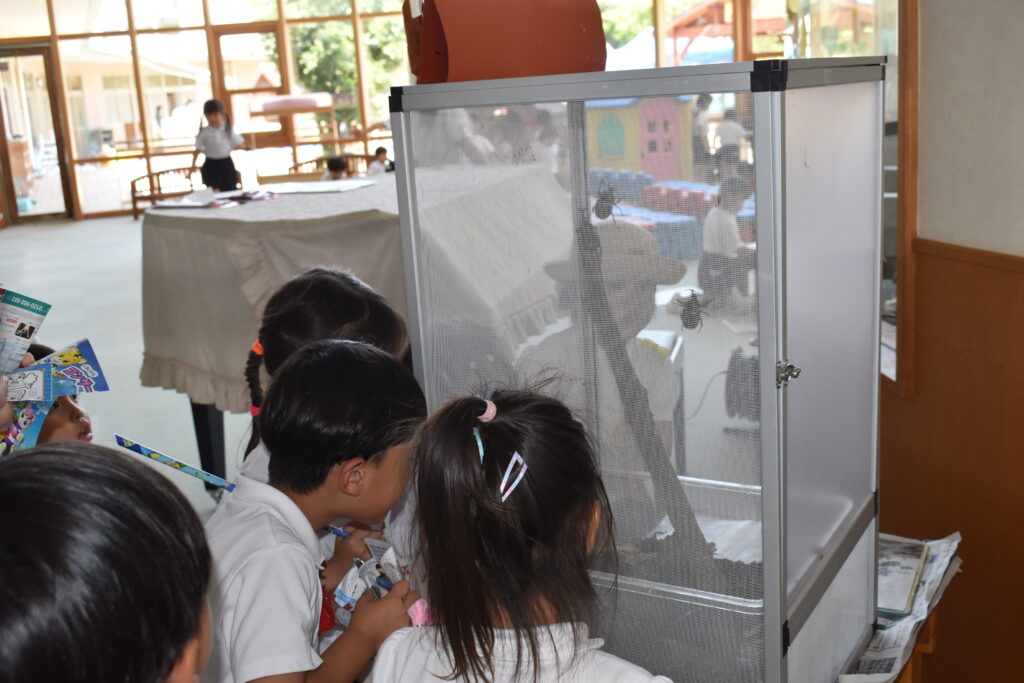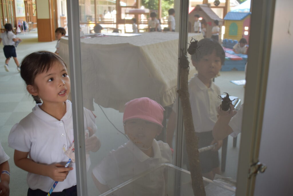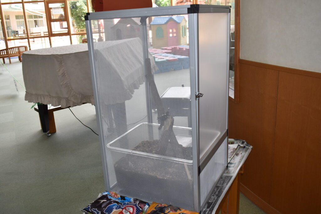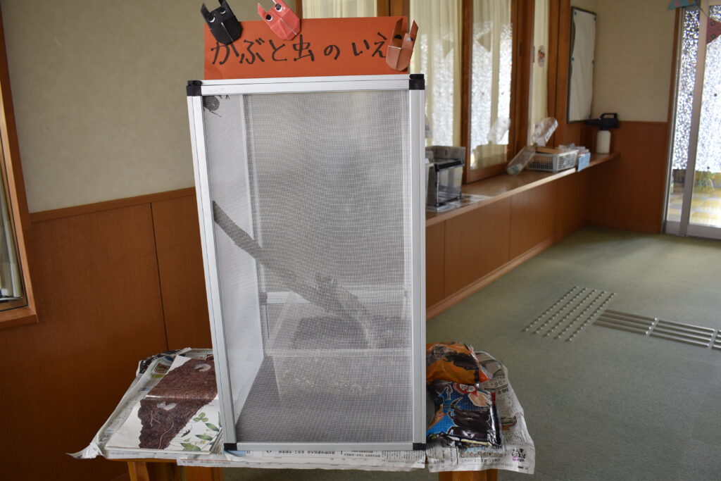 早速子どもたちにもみてもらいたいと思っていたところ、今度は別の卒園児の方が子どもたちのためにと大きなかぶとむし小屋をプレゼントしてくださいました。これからも大切に世話をして、命の不思議さや大切さを感じていきたいと思っています。