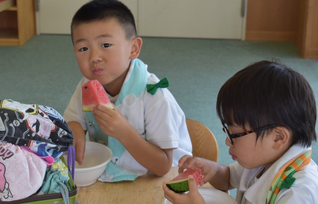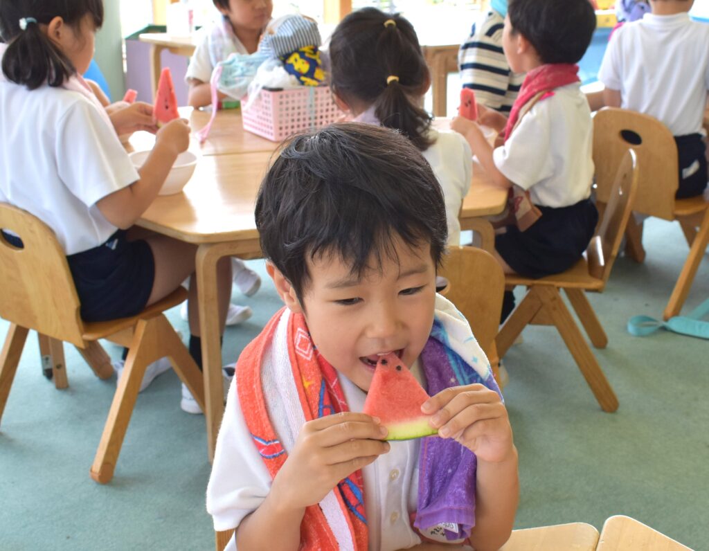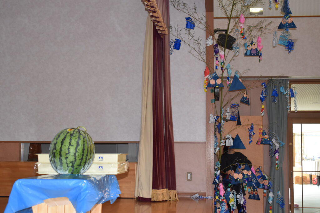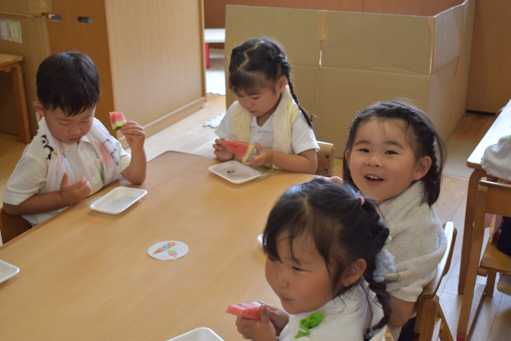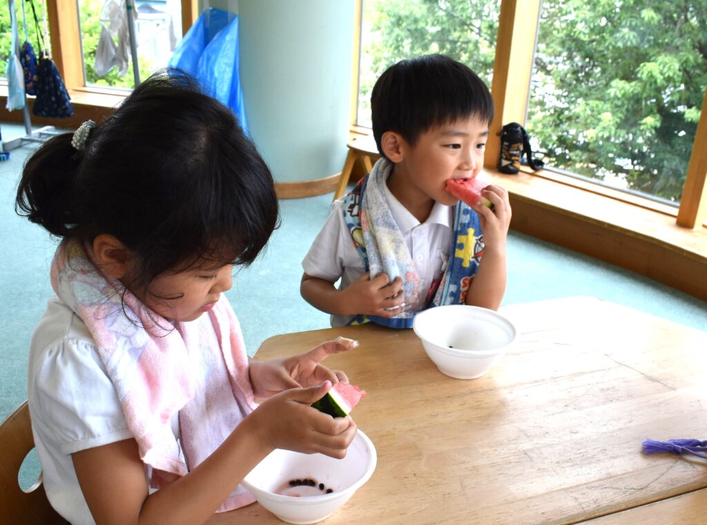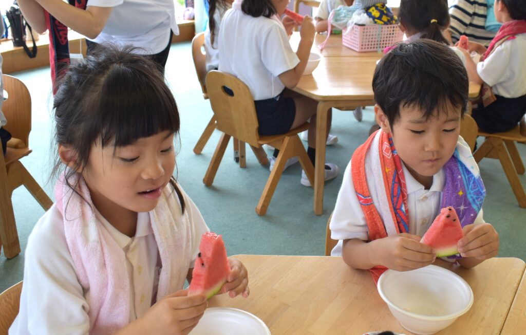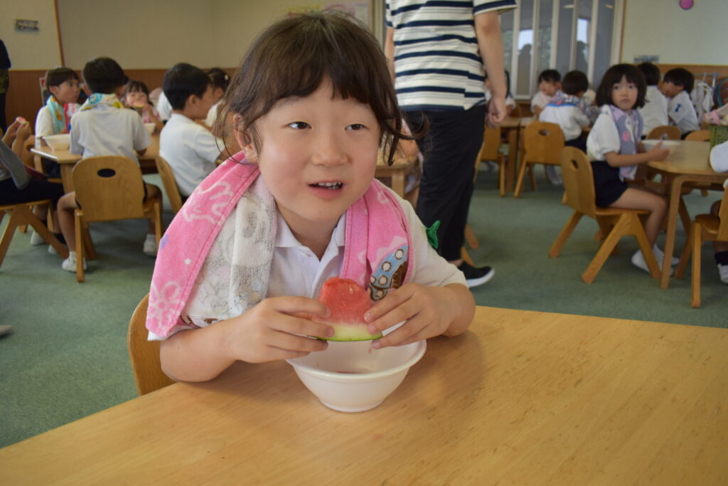 7月7日、七夕の日です。笹飾りを眺めながら、七夕会を行いました。ホールに集まって七夕の話を聞いたり、七夕の由来の映画を見たり、じゃんけんゲームをしたりしました。ホールではお供えの大きなスイカを先生たちが切ってくれて、うまくスイカが2つになった瞬間に、子どもたちから大きな拍手。そして園長先生とじゃんけんゲームをして勝ったお友だちには、1番最初のスイカのプレゼント。楽しい七夕会のひと時を過ごしました。その後は、食物の豊作に感謝して、友だちと一緒にスイカを食べました。みんなで食べるスイカは特別に美味しかったですね。