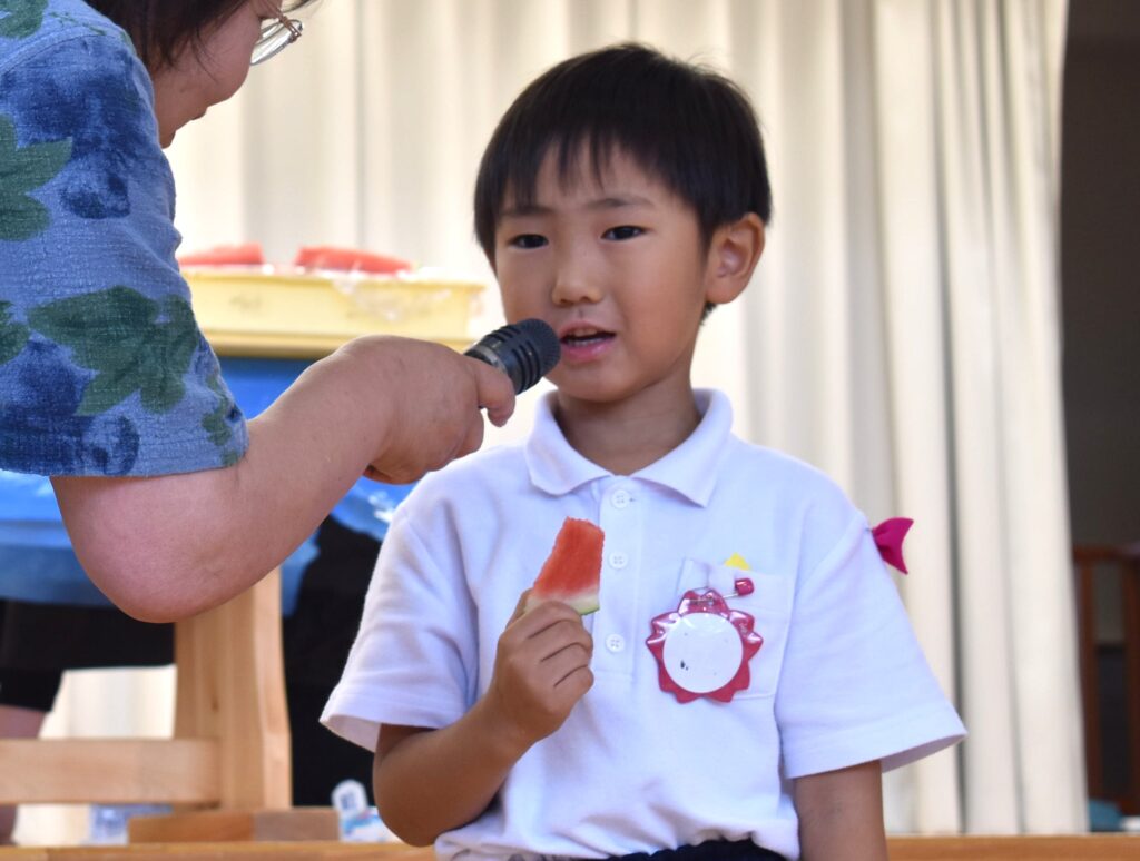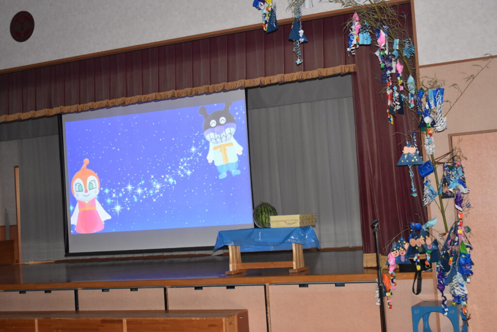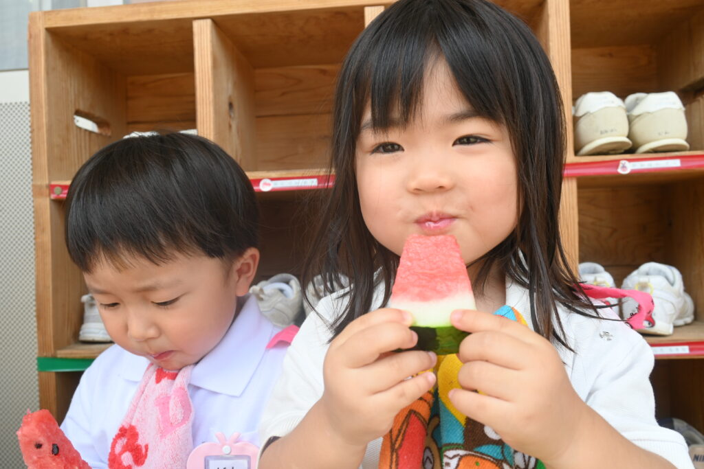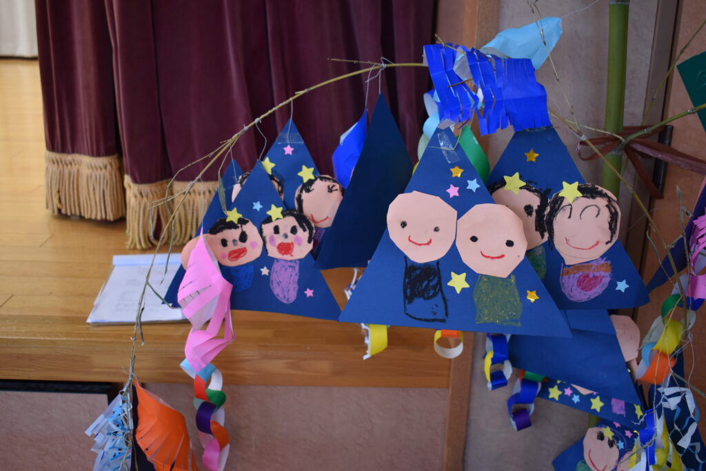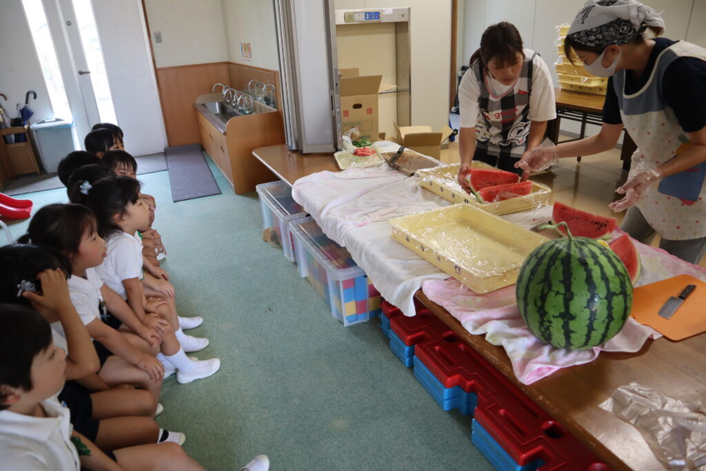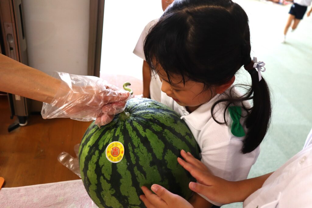 7月7日、七夕の日です。笹飾りを眺めながら、七夕会を行いました。ホールに集まって七夕の話を聞いたり、七夕の由来の映画を見たり、じゃんけんゲームをしたりしました。ホールではお供えの大きなスイカを先生たちが切ってくれて、うまくスイカが2つになった瞬間に、子どもたちから大きな拍手。そして園長先生とじゃんけんゲームをして勝ったお友だちには、1番最初のスイカのプレゼント。楽しい七夕会のひと時を過ごしました。その後は、食物の豊作に感謝して、友だちと一緒にスイカを食べました。みんなで食べるスイカは特別に美味しかったですね。