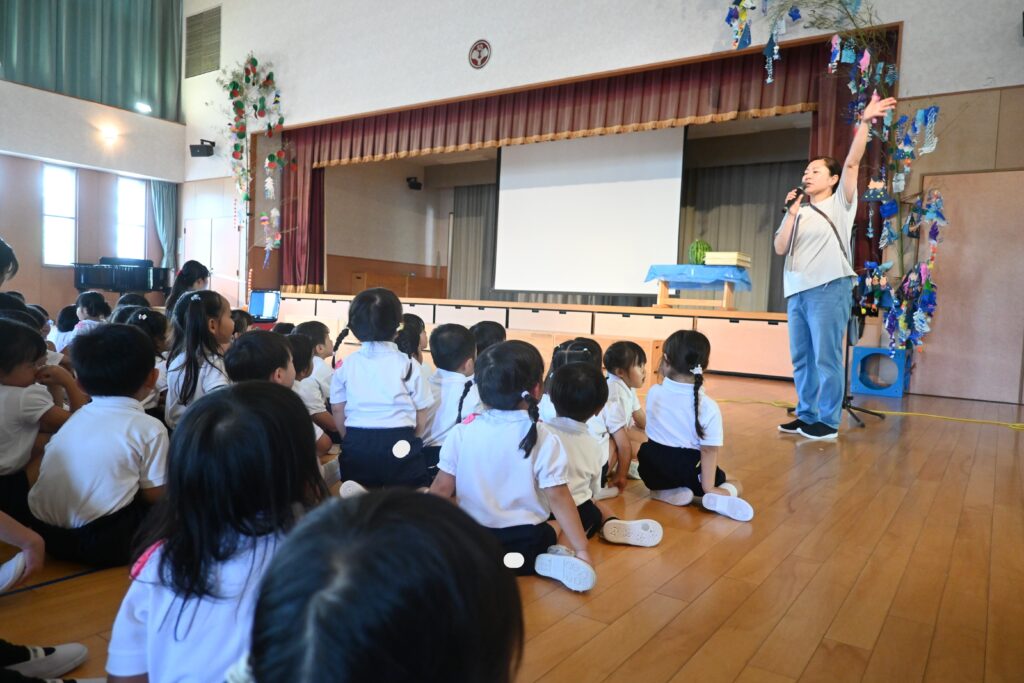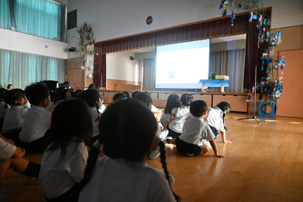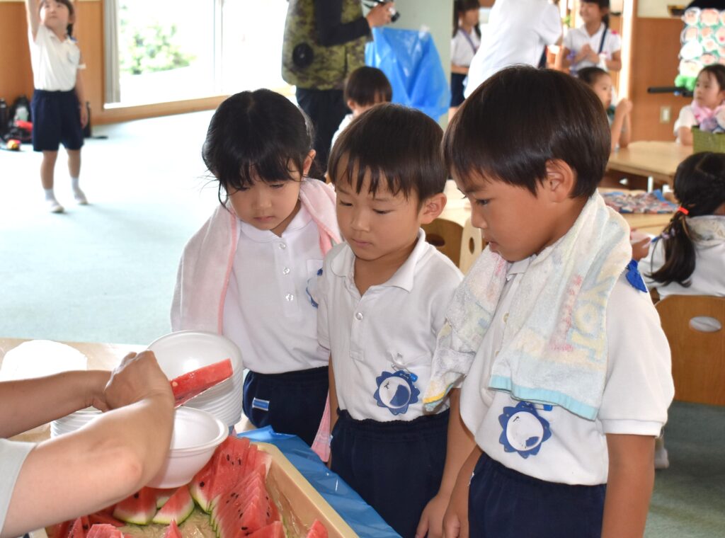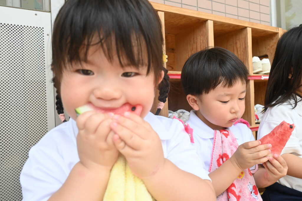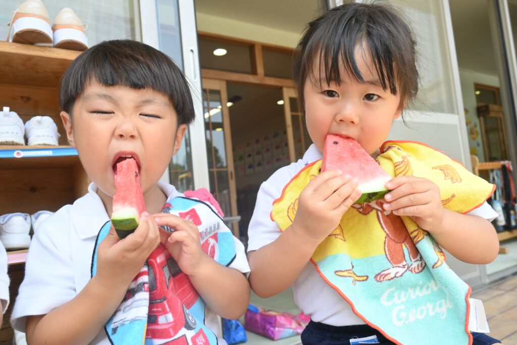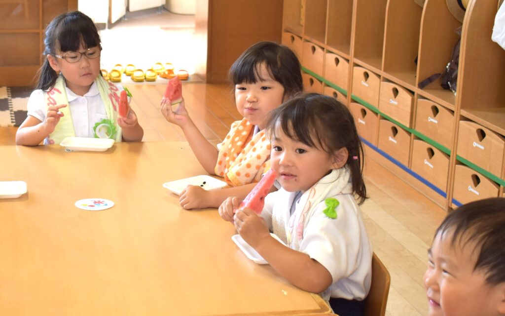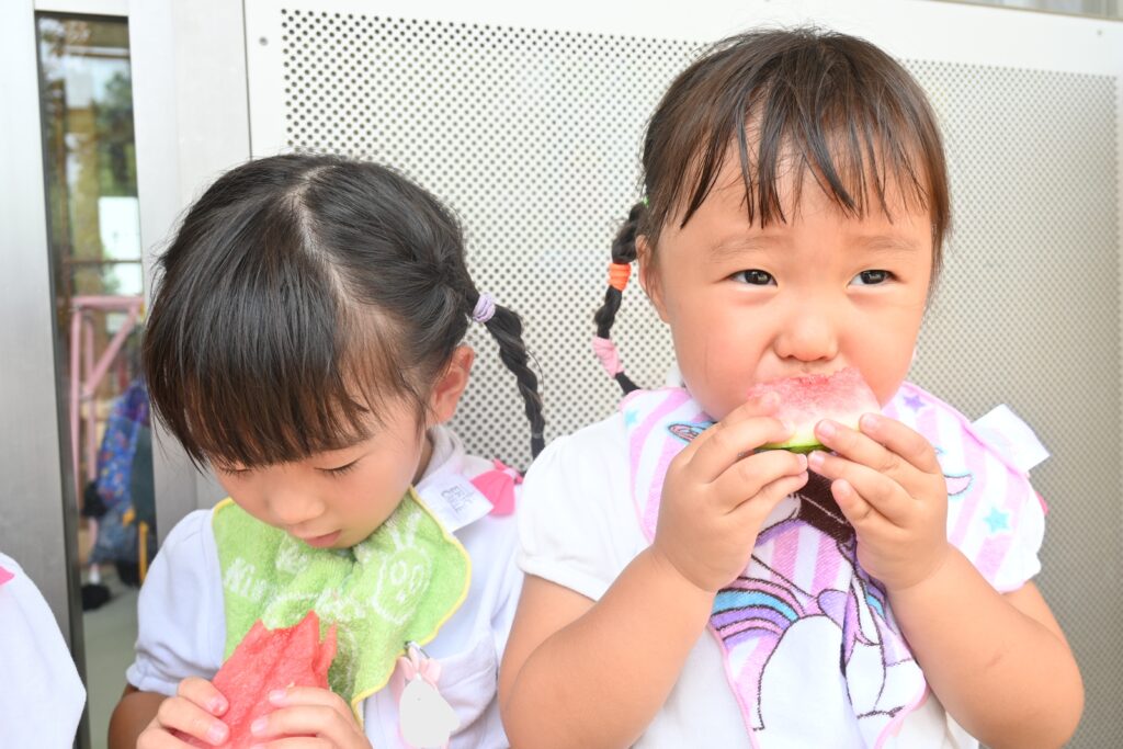 7月7日、七夕の日です。笹飾りを眺めながら、七夕会を行いました。ホールに集まって七夕の話を聞いたり、七夕の由来の映画を見たり、じゃんけんゲームをしたりしました。ホールではお供えの大きなスイカを先生たちが切ってくれて、うまくスイカが2つになった瞬間に、子どもたちから大きな拍手。そして園長先生とじゃんけんゲームをして勝ったお友だちには、1番最初のスイカのプレゼント。楽しい七夕会のひと時を過ごしました。その後は、食物の豊作に感謝して、友だちと一緒にスイカを食べました。みんなで食べるスイカは特別に美味しかったですね。