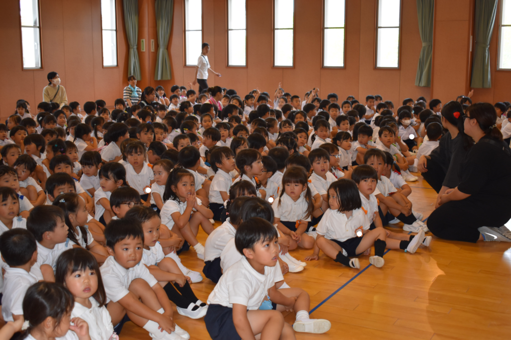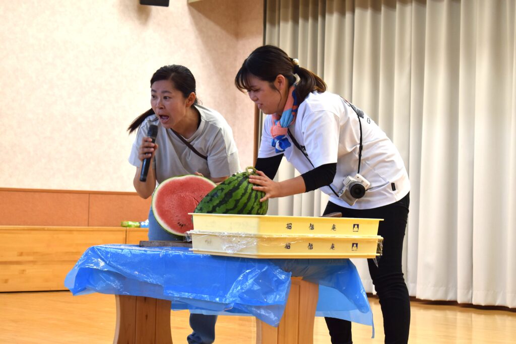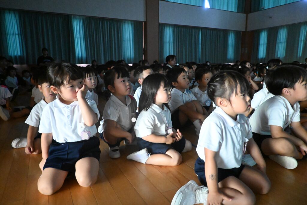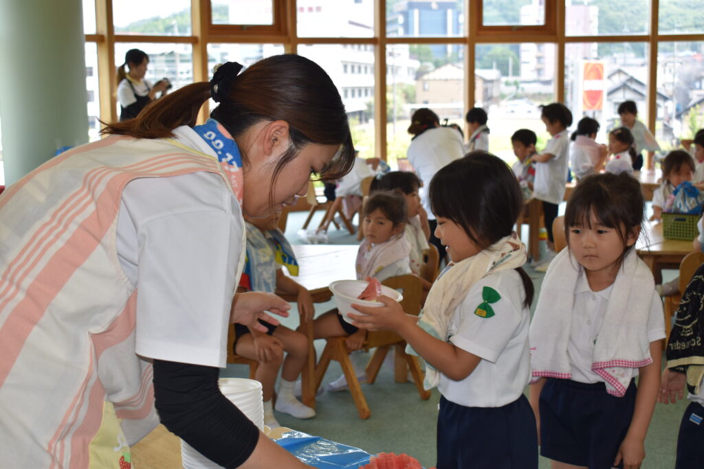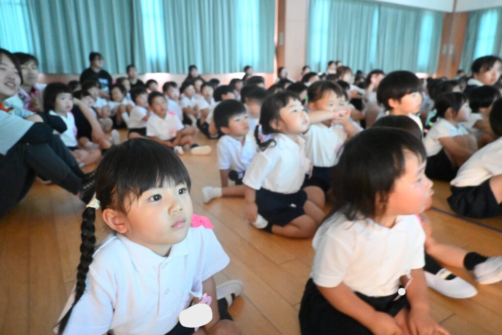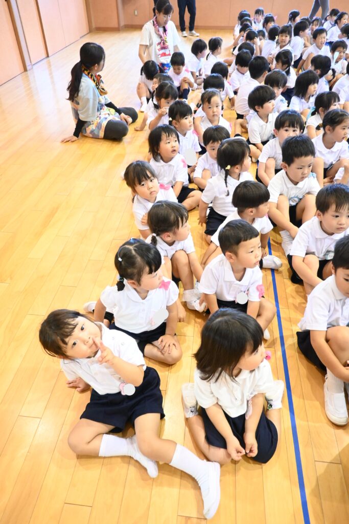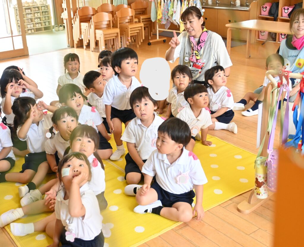 7月7日、七夕の日です。笹飾りを眺めながら、七夕会を行いました。ホールに集まって七夕の話を聞いたり、七夕の由来の映画を見たり、じゃんけんゲームをしたりしました。ホールではお供えの大きなスイカを先生たちが切ってくれて、うまくスイカが2つになった瞬間に、子どもたちから大きな拍手。そして園長先生とじゃんけんゲームをして勝ったお友だちには、1番最初のスイカのプレゼント。楽しい七夕会のひと時を過ごしました。その後は、食物の豊作に感謝して、友だちと一緒にスイカを食べました。みんなで食べるスイカは特別に美味しかったですね。