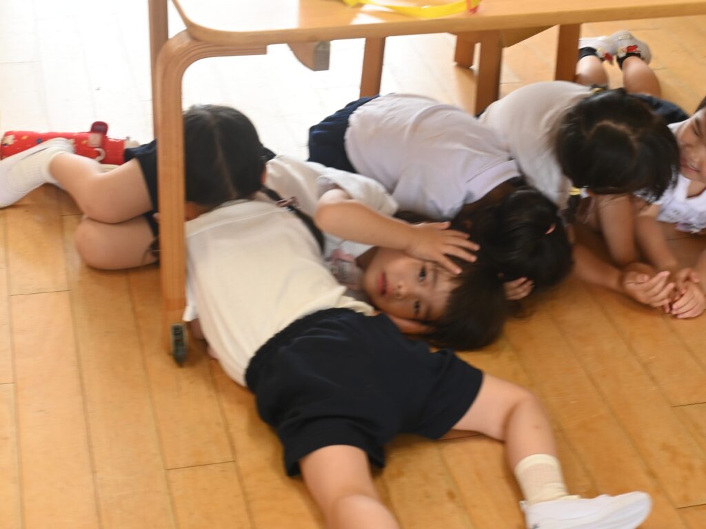 本園でも、大きな地震に備えて、色々な状況を想定しながら定期的に避難訓練を行っています。訓練だと分かっていても、怖くて泣けてしまう子もいます。子どもたちの命を守る準備をしっかりしていきたいと思います。