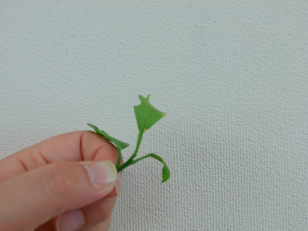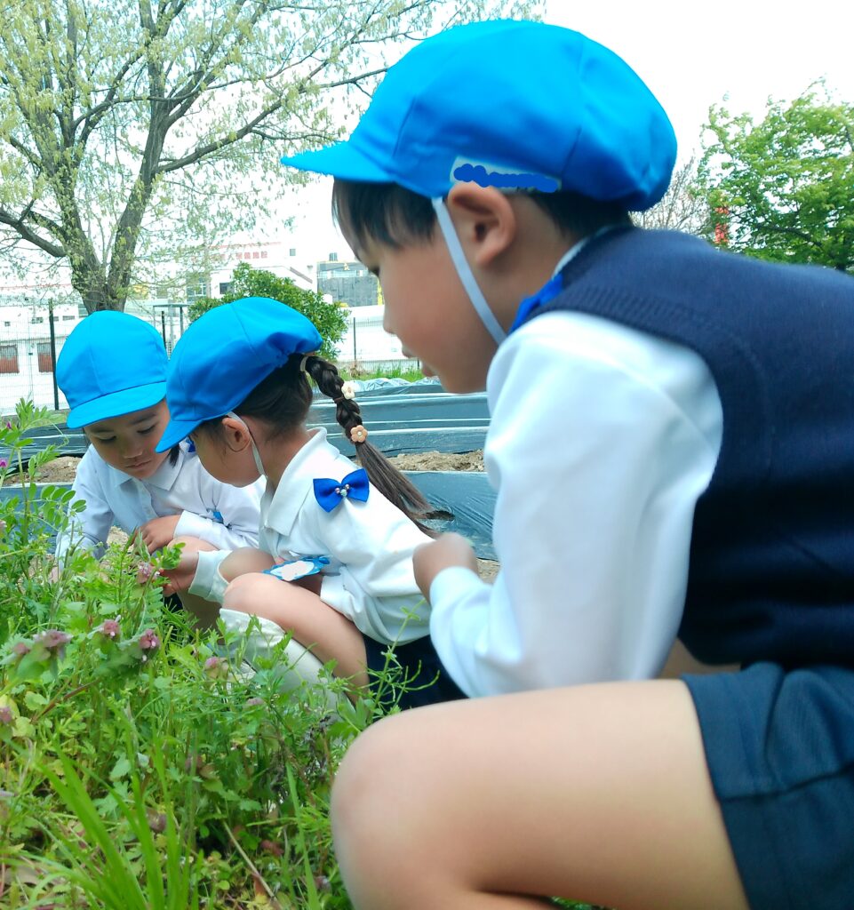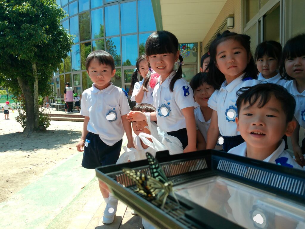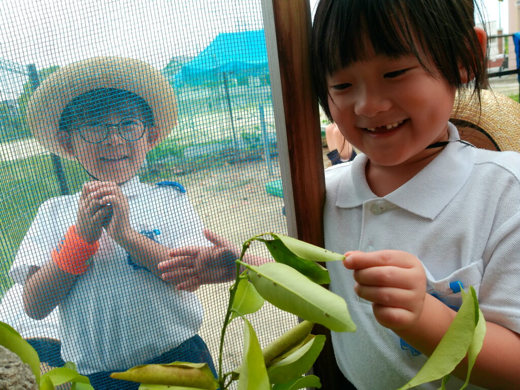 5月ミカンの木に黄色いたまごが・・・調べてみると蝶の卵のようでした。毎日幼虫の変化を楽しみにしていた子ども達。6月、じゃがいも堀りから帰ってくると、幼虫は羽化をしてアゲハ蝶に変身していました。図鑑を見て『透き通ってきたらもうすぐって書いてあるから、もうすぐな気がする!!』と楽しみにしていた事もあり子ども達は大興奮☆