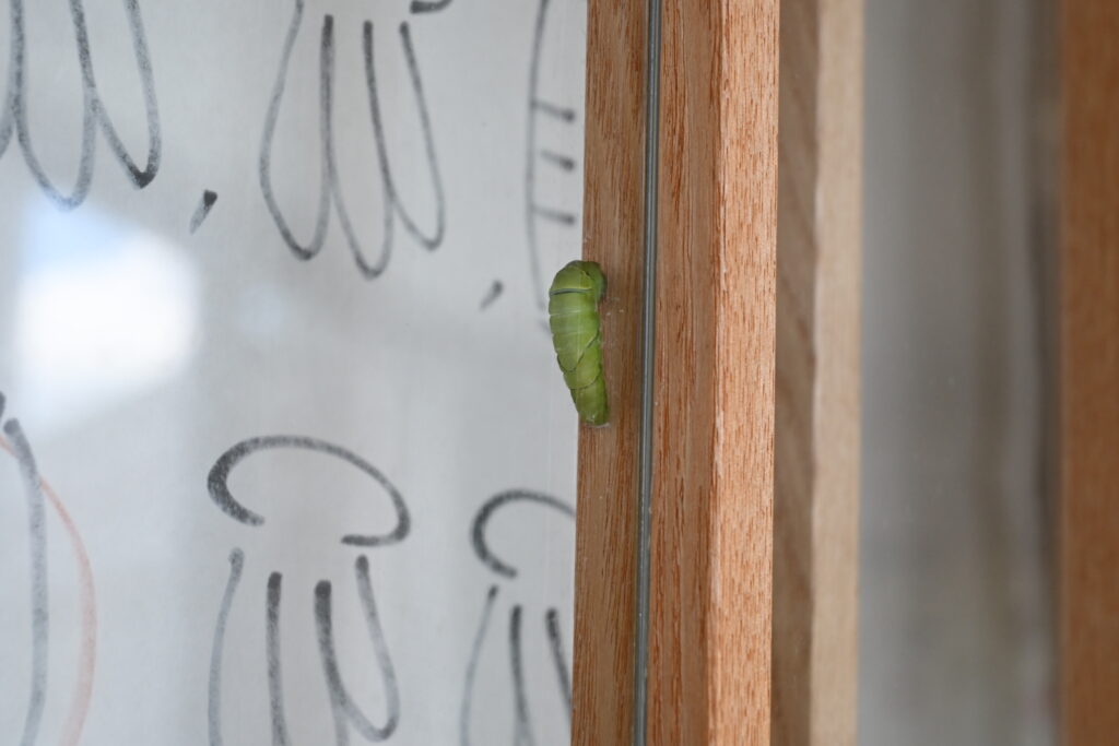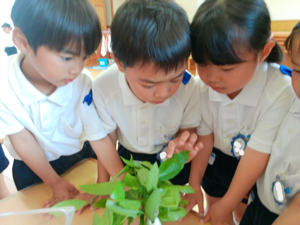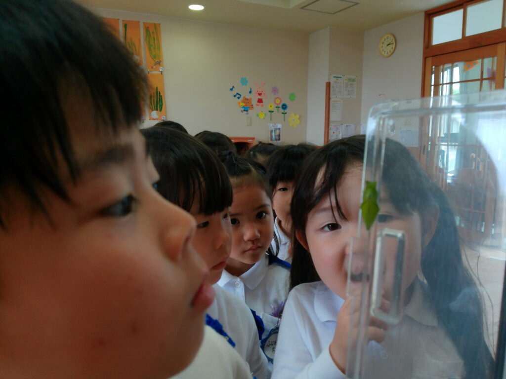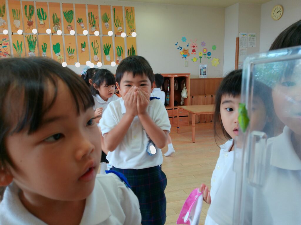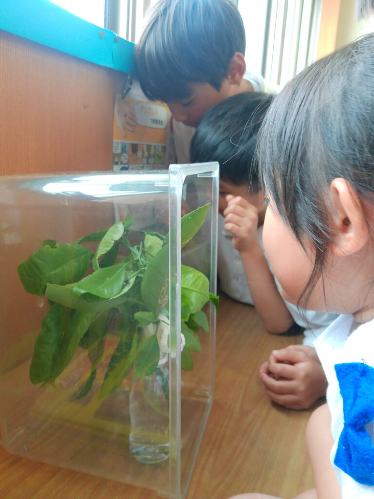 それからまた幼虫の観察が始まりました。『緑になったね!』『フンがいっぱいだね!!』気づいた事で会話が弾んだり、幼虫の変化を楽しみにしている子もいました。