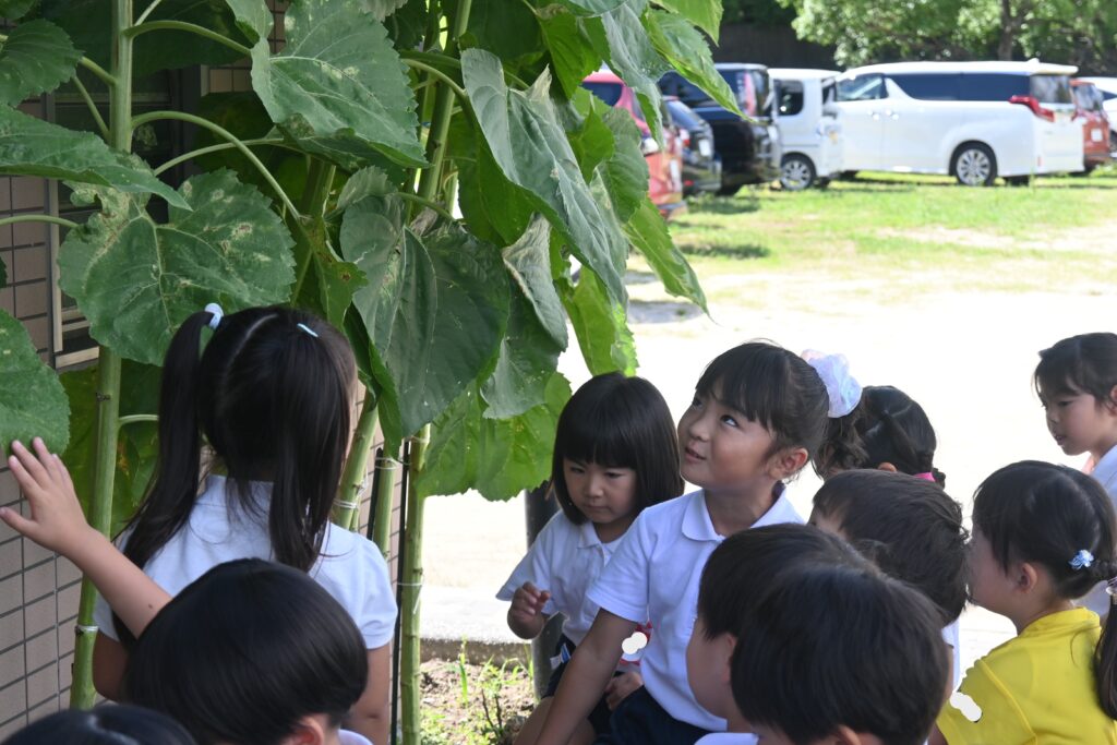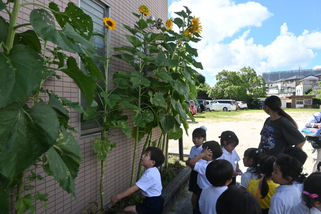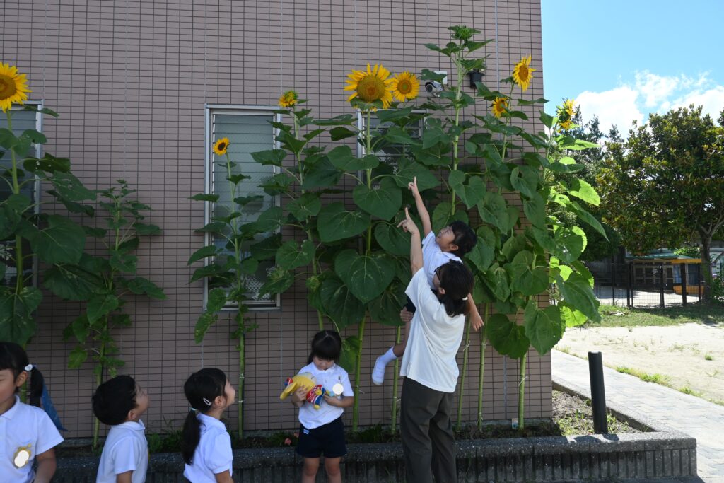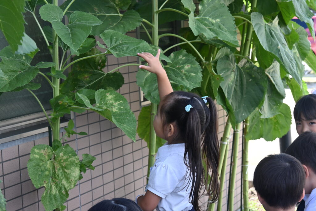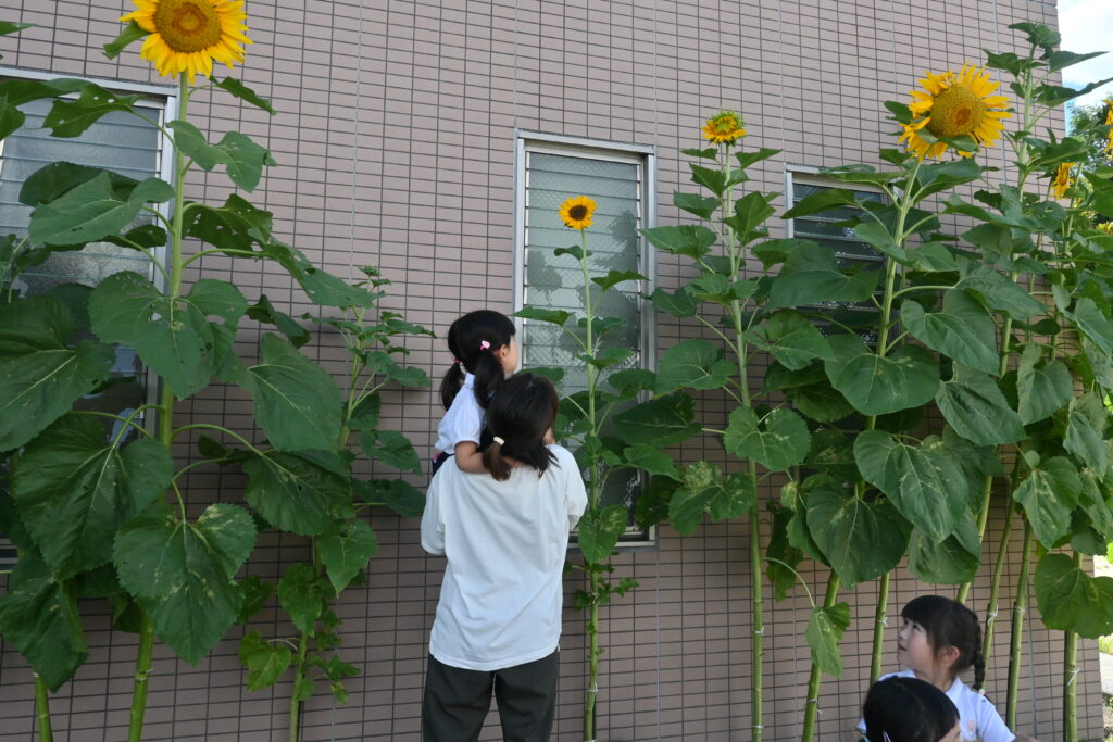 5月に種をまいた『ひまわり』。少し前から蕾ができ始めて、「もうすぐ咲くね!」と楽しみにしていました。見事に咲いた『ひまわりの花』を見上げて、「わぁ!大きい!!」「手が届かないよ!」と嬉しそう。