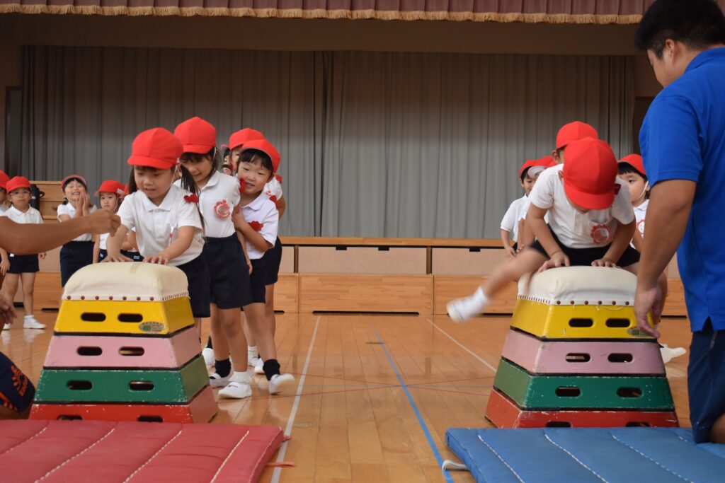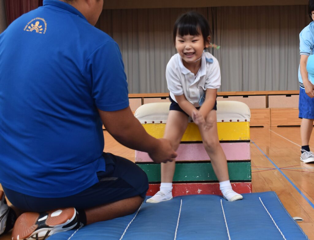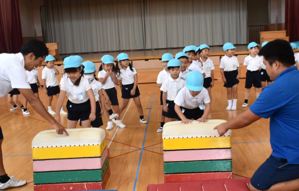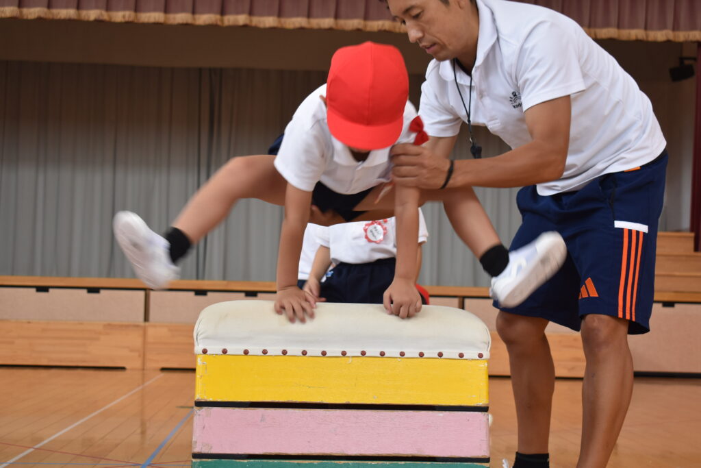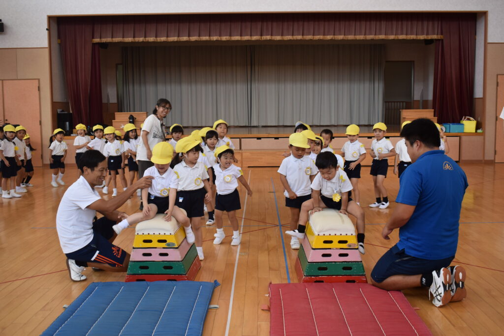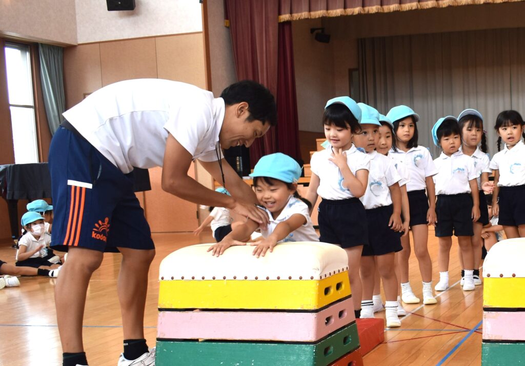 講師の辻先生と加藤先生の姿が見えると、子どもたちが集まって来ます。元気で面白いおふたりの先生は、子どもたちの遊びの大将。人気者です。追いかけっこをしたり高いところからジャンプをしたりとふたりの先生たちと一緒に思いきり身体を動かして遊んでいます。運動会で跳び箱ジャンプに挑戦する年長児たちは、「ちょっと休憩した方がいいんじゃない?」というくらいやる気満々。それを見ていた年中組も今日は跳び箱ジャンプに挑戦。自分の目標を持って挑戦する子どもたちを、全力応援しています。