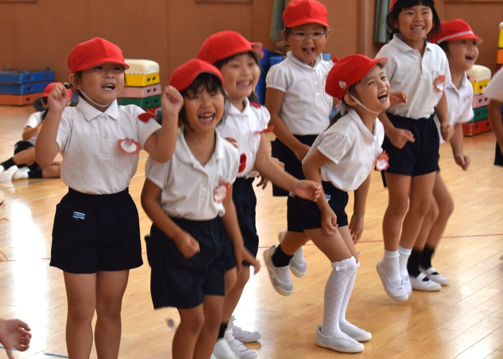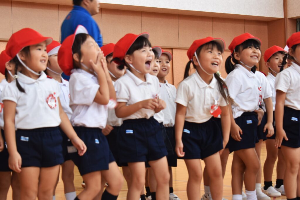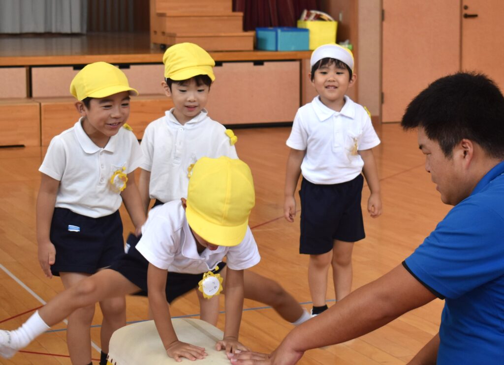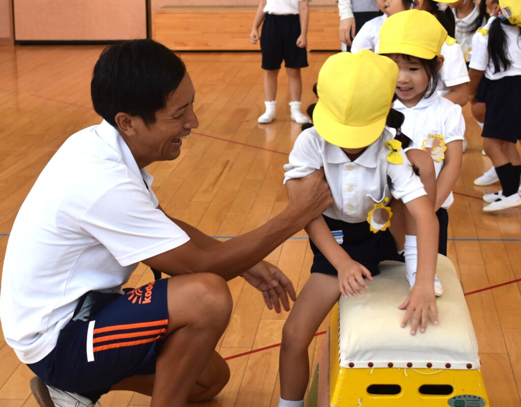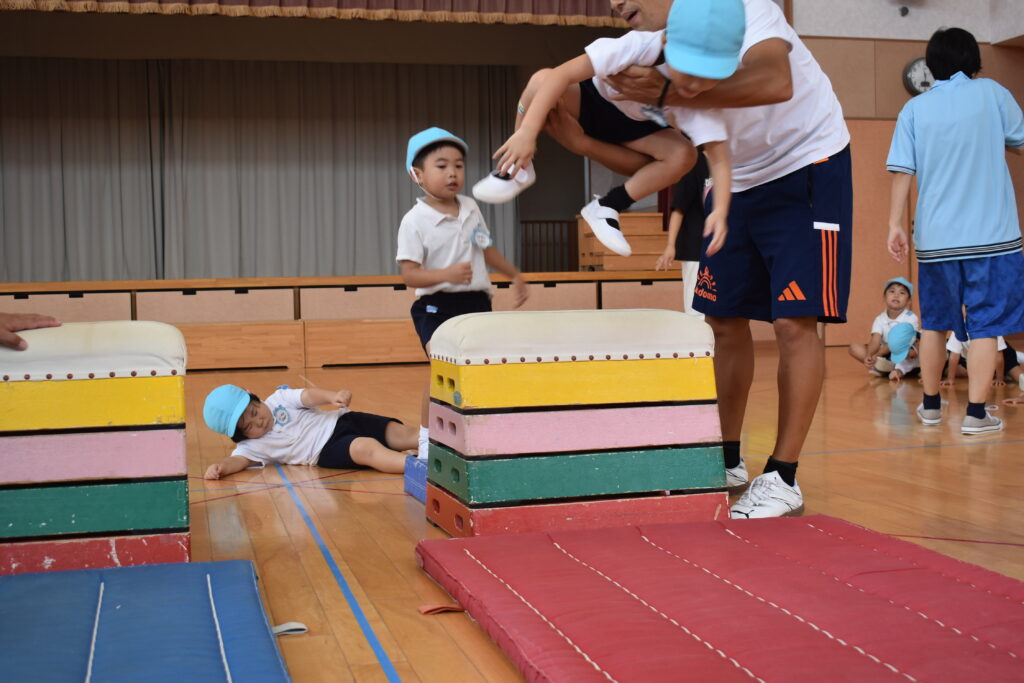 講師の辻先生と加藤先生の姿が見えると、子どもたちが集まって来ます。元気で面白いおふたりの先生は、子どもたちの遊びの大将。人気者です。追いかけっこをしたり高いところからジャンプをしたりとふたりの先生たちと一緒に思いきり身体を動かして遊んでいます。運動会で跳び箱ジャンプに挑戦する年長児たちは、「ちょっと休憩した方がいいんじゃない?」というくらいやる気満々。それを見ていた年中組も今日は跳び箱ジャンプに挑戦。自分の目標を持って挑戦する子どもたちを、全力応援しています。