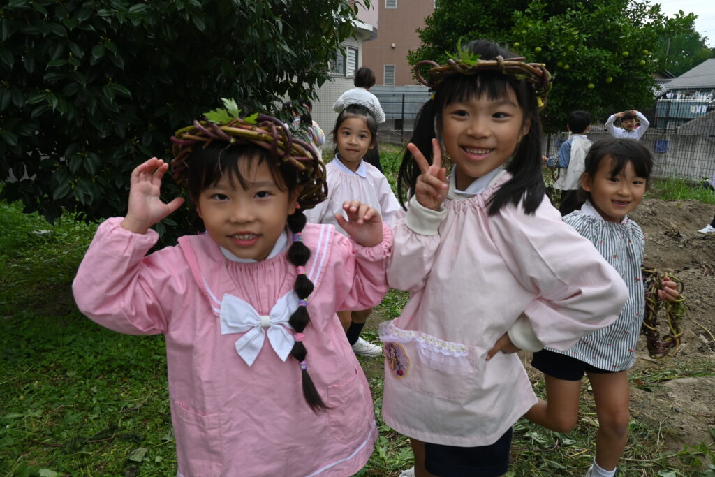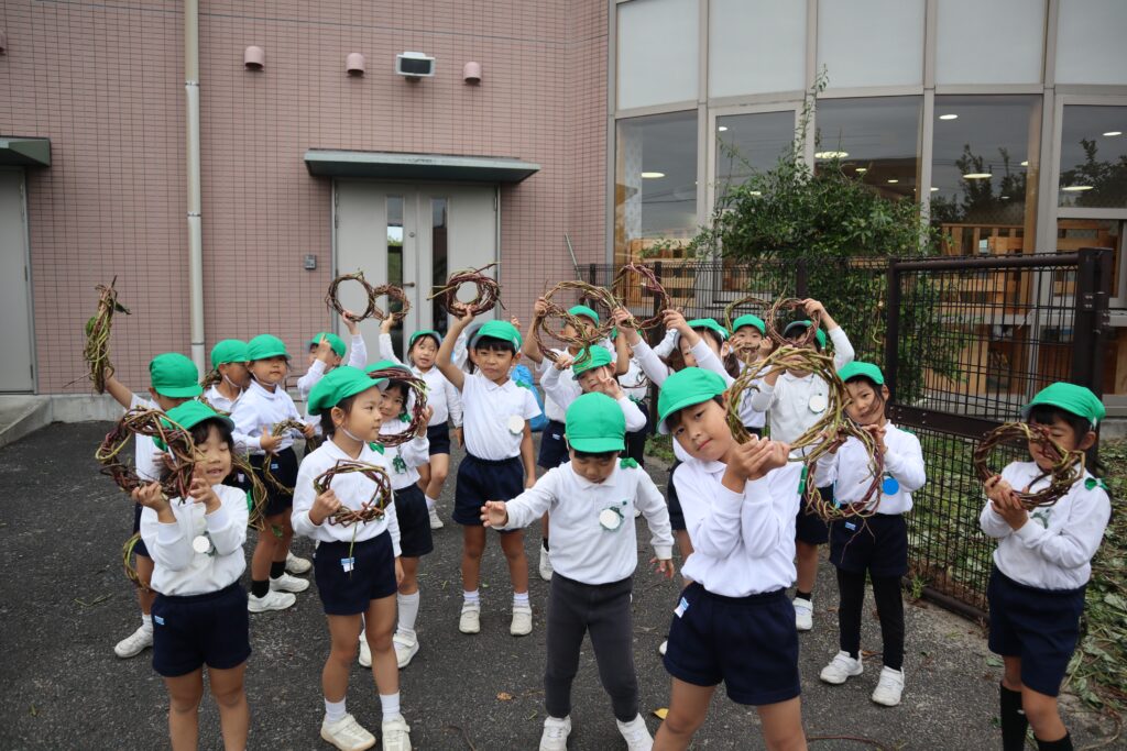 明日の芋ほりの為につるはらいをし、年長組はつるを使ってリースを作りました☆