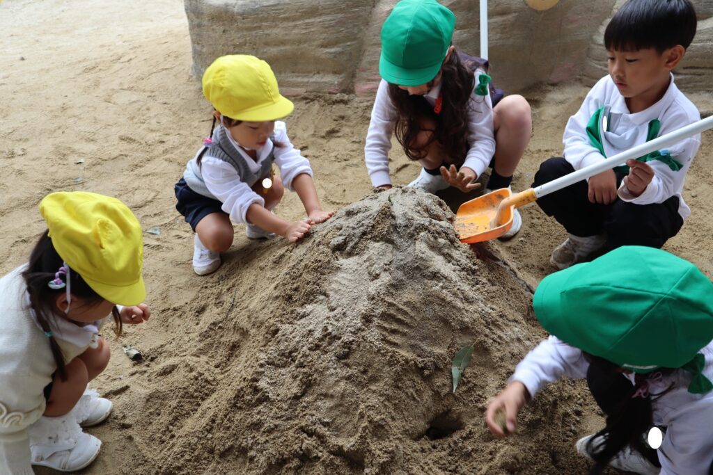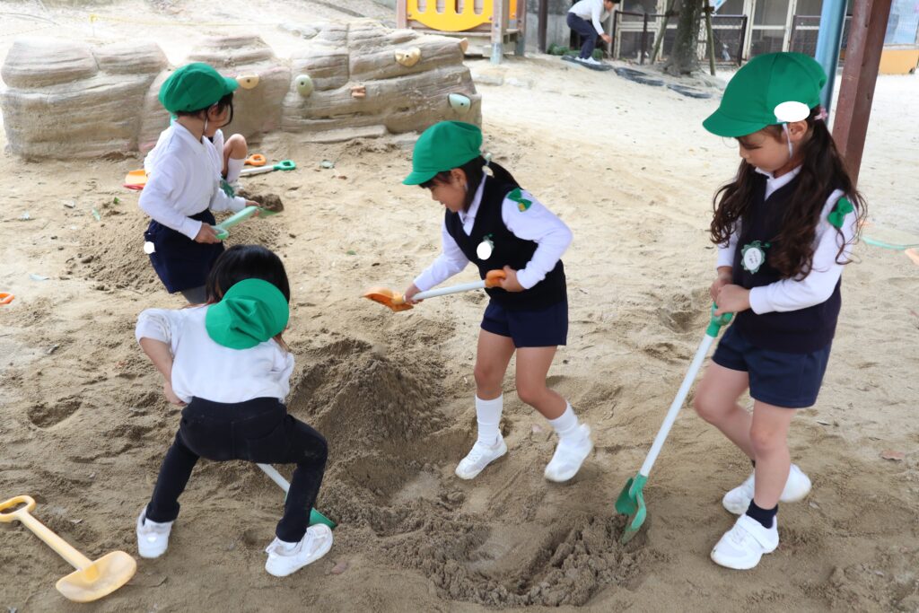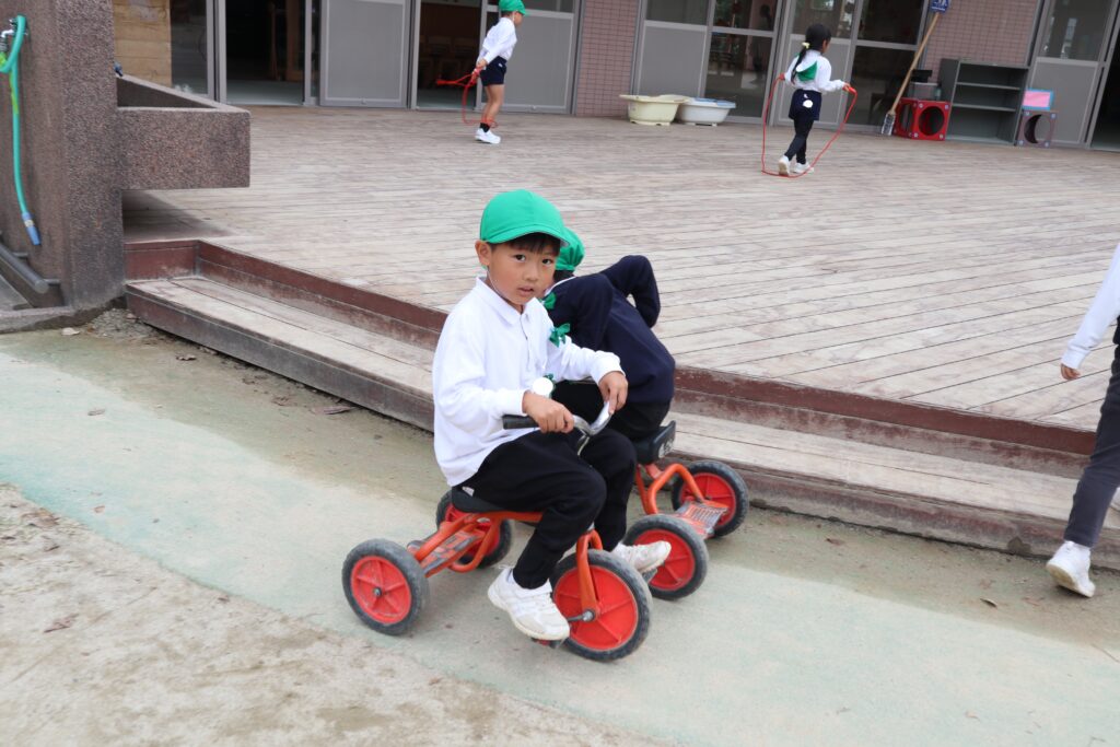 今日は年少さん、年中さんが遠足だったので、園庭の三輪車や砂場を思い切り使って遊びました。