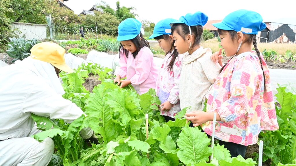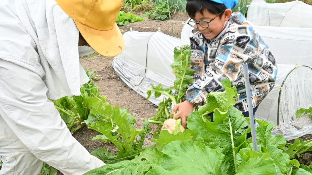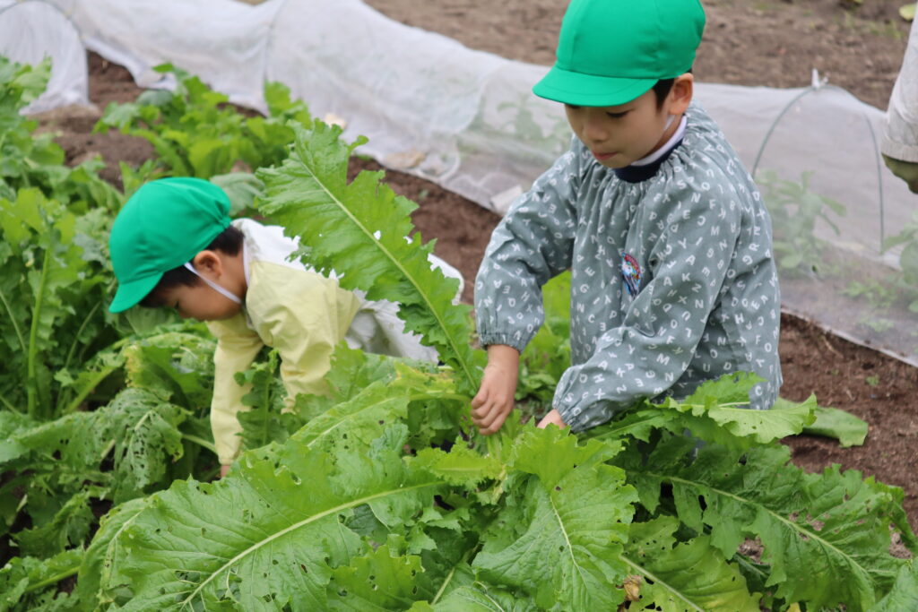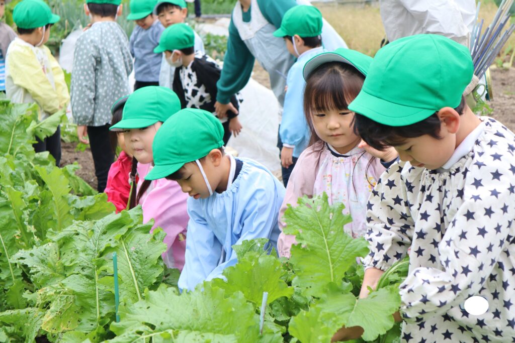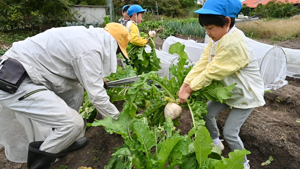 葉っぱのついたかぶを見ることが珍しかったようで、『葉っぱも食べれるの?』と興味深々。バスの中では『おおきなかぶ』の絵本を見たり、どんな料理にしようか会話も弾みました。