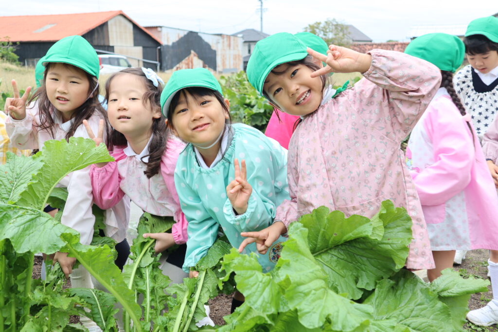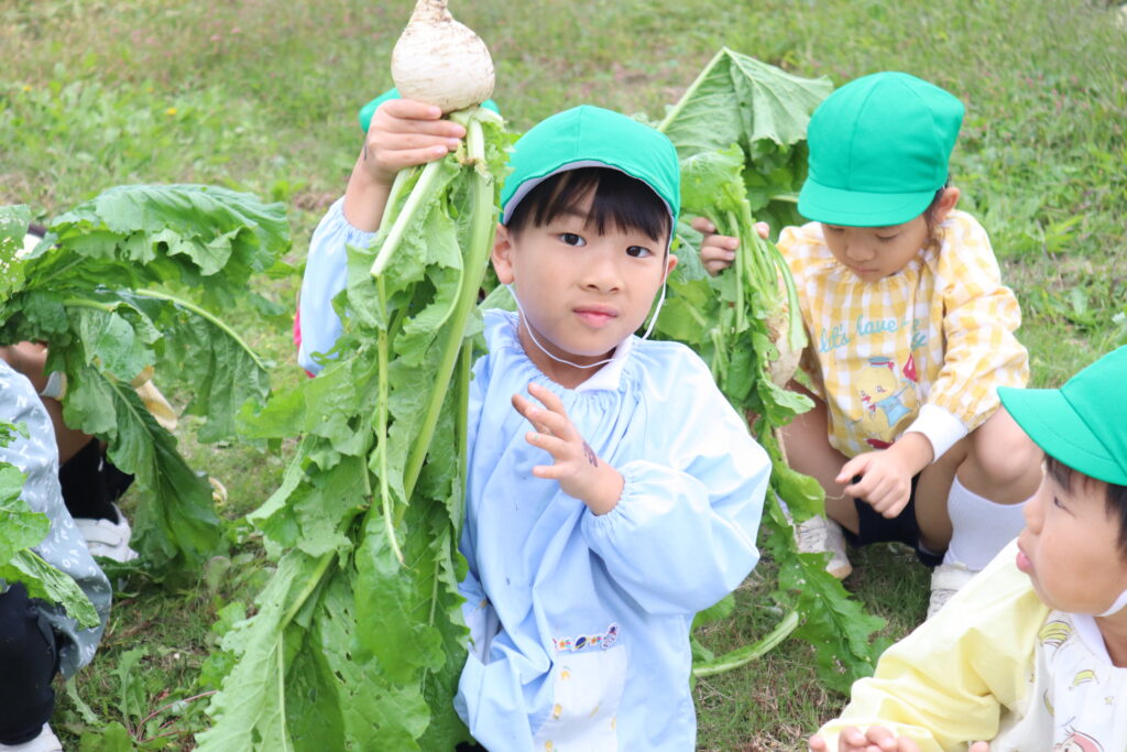 元園長の浅井先生の畑にすずらん組とあやめ組がかぶの収穫に行ってきました。付け根の方を両手で持って引っ張ると「スッポーン」と抜けて・・・。笑顔が溢れました。