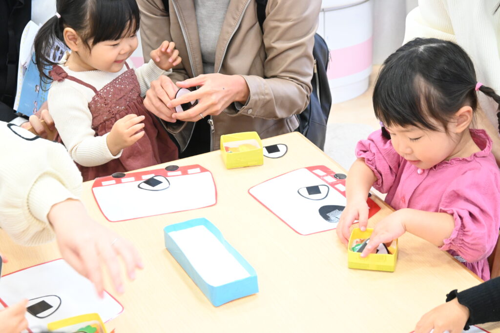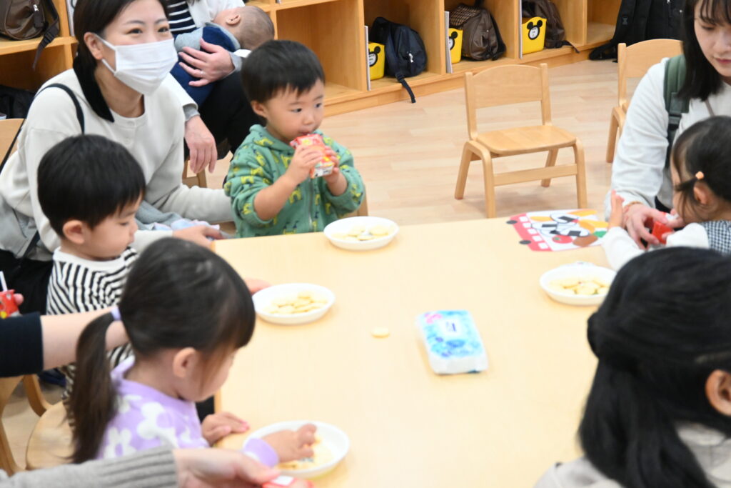 体験会では、絵本を見たり、お弁当作りをしたりしました。その後は、おやつタイム。
