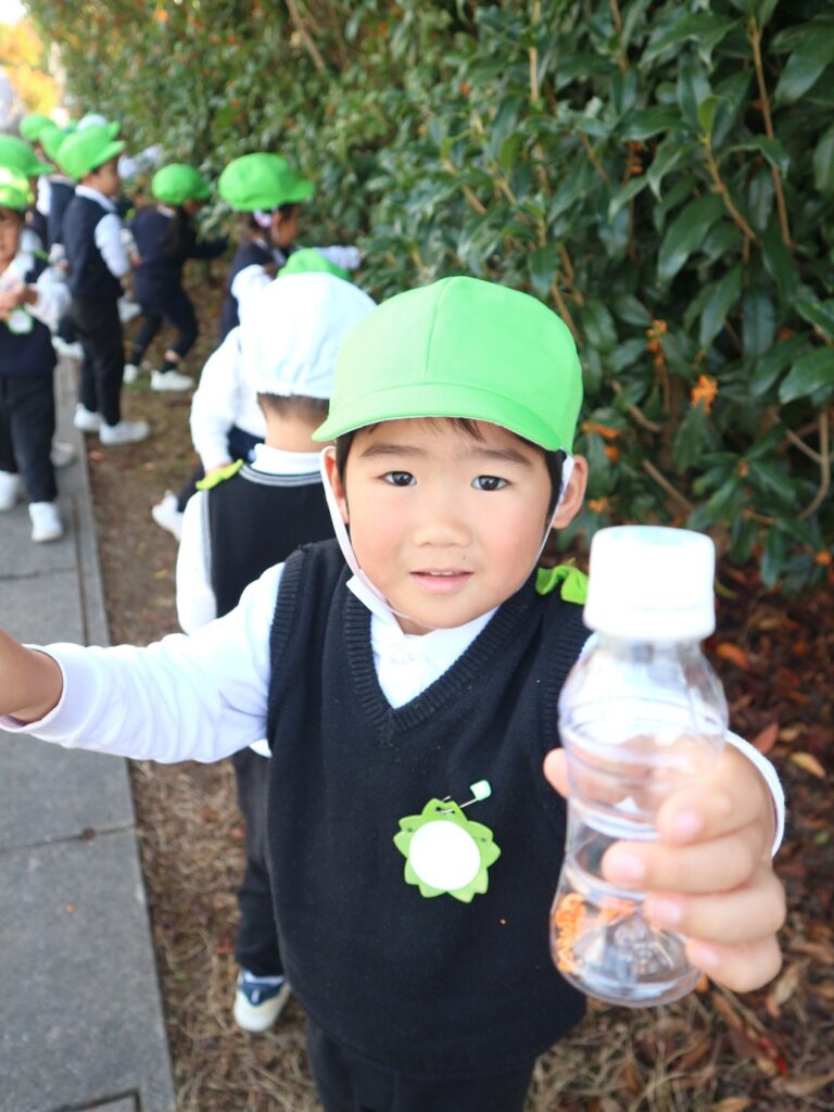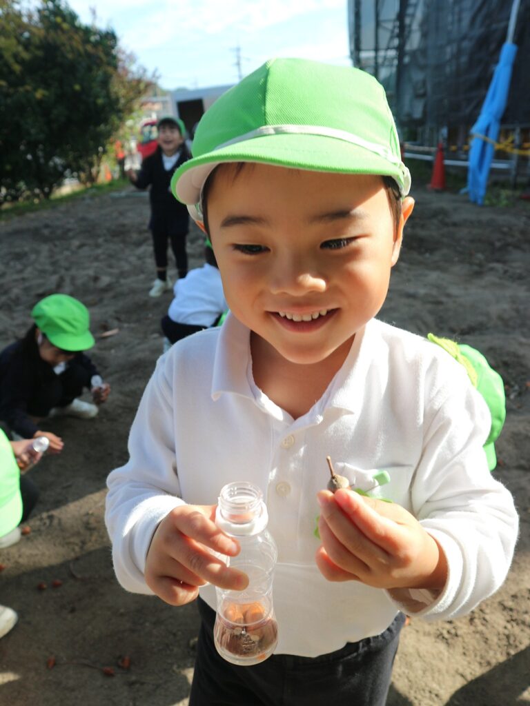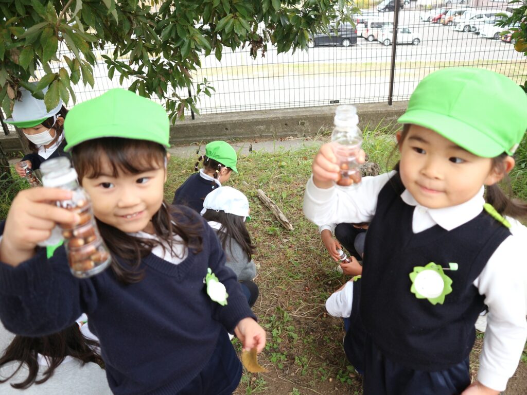 ペットボトルいっぱいにどんぐりを入れる子、どんぐりの帽子集めをする子、双子のどんぐりを見つける子・・・。思い思いにどんぐり拾いを楽しみました♪